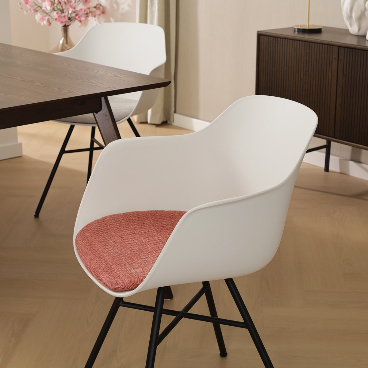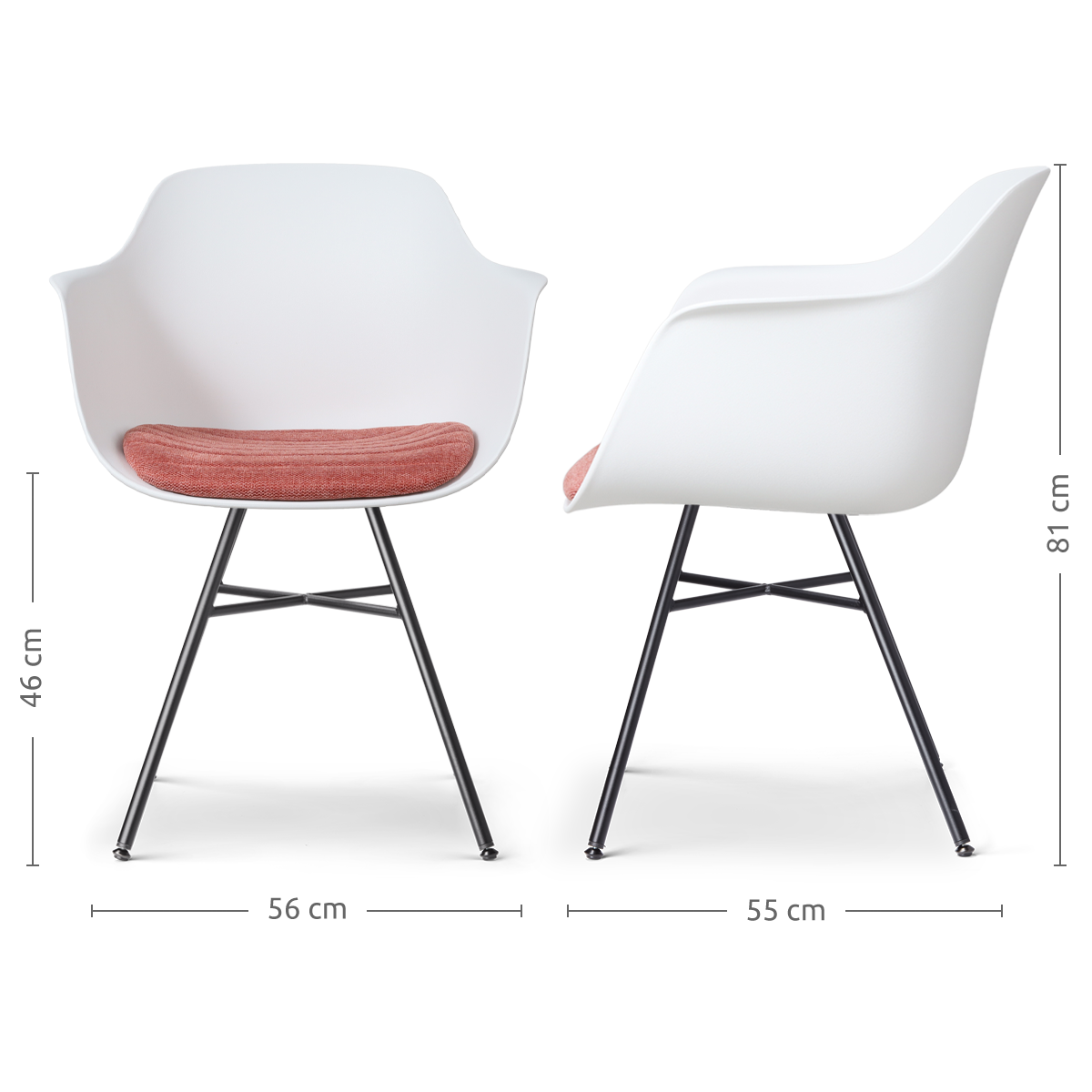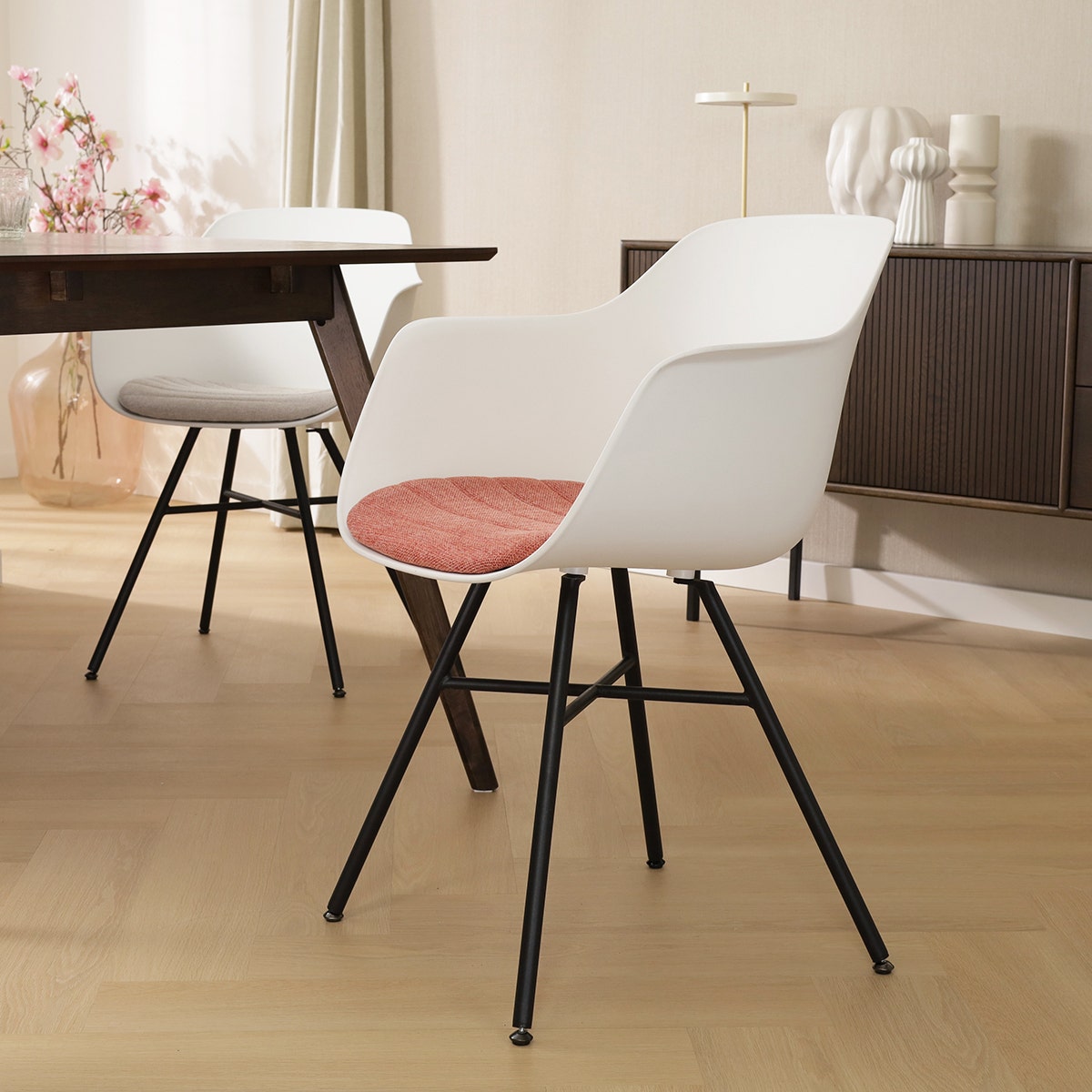 Het leuke is dat je deze stoel zelf kunt samenstellen. Je kunt namelijk kiezen uit meerdere kleuren vaste zitkussens om jouw perfecte kuipstoel samen te stellen. Hierdoor creëer je een frisse uitstraling in je interieur. Bovendien heeft de zitting armleuningen die jouw extra comfort bieden. De eetkamerstoel is afgewerkt met een metalen onderstel met een kruis in het midden als leuk detail. Zie jij jezelf al genieten in deze comfortabele eetkamerstoel?