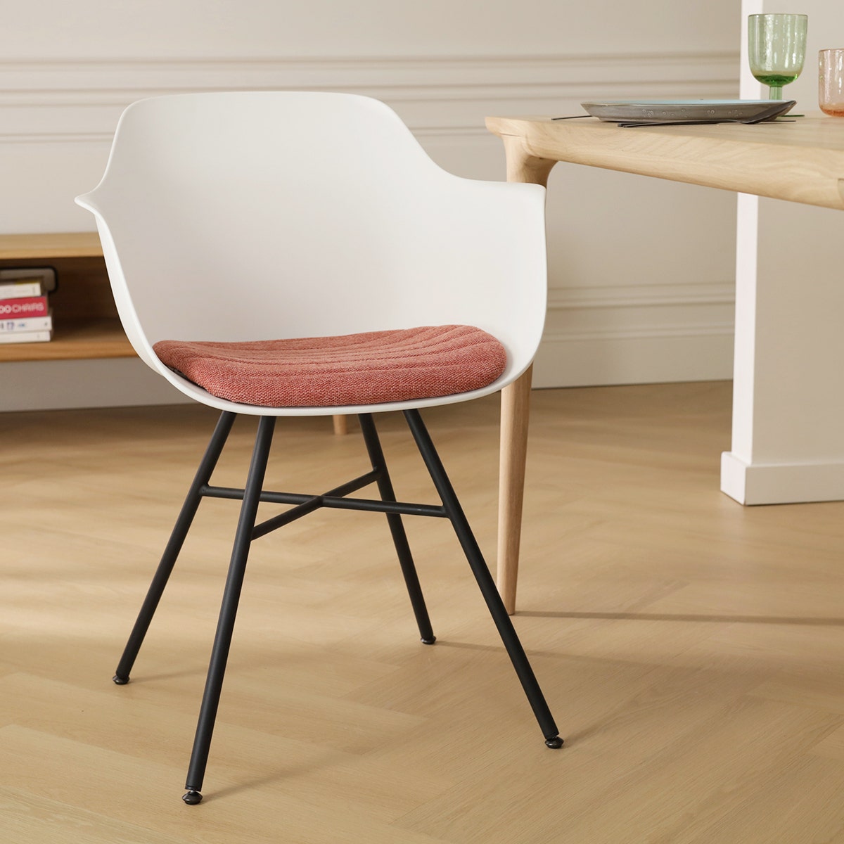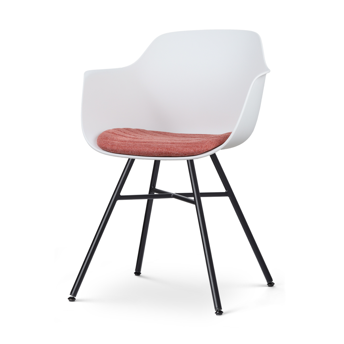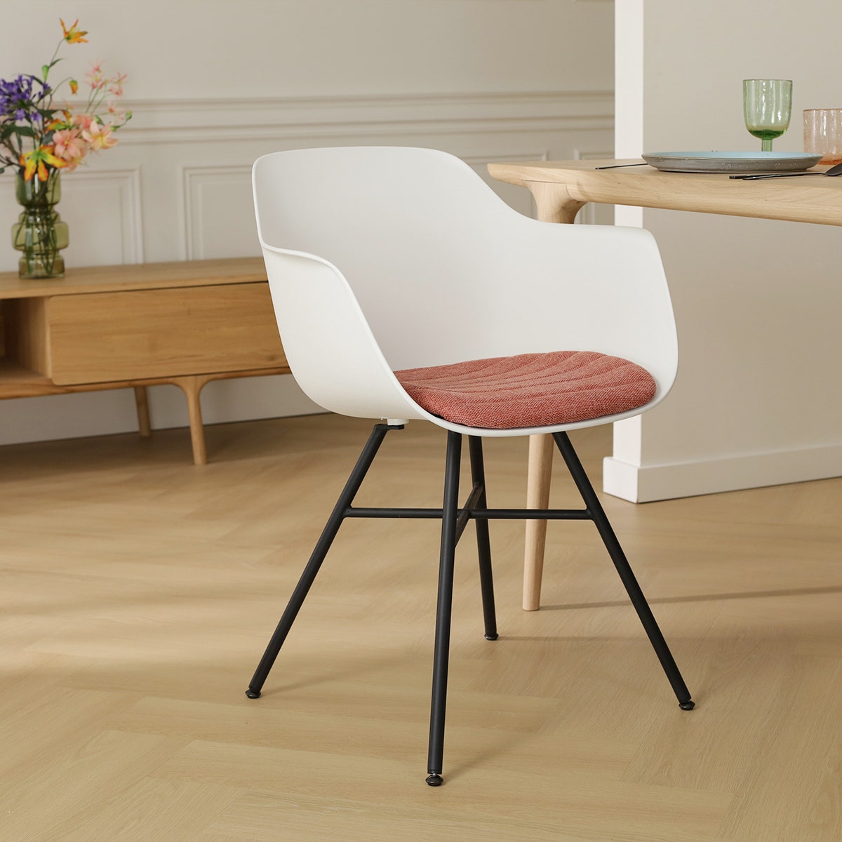 Het leuke is dat je deze stoel zelf kunt samenstellen. Je kunt namelijk kiezen uit meerdere kleuren vaste zitkussens om jouw perfecte kuipstoel samen te stellen. Hierdoor creëer je een frisse uitstraling in je interieur. Bovendien heeft de zitting armleuningen die jouw extra comfort bieden. De eetkamerstoel is afgewerkt met een metalen onderstel met een kruis in het midden als leuk detail. Zie jij jezelf al genieten in deze comfortabele eetkamerstoel?
