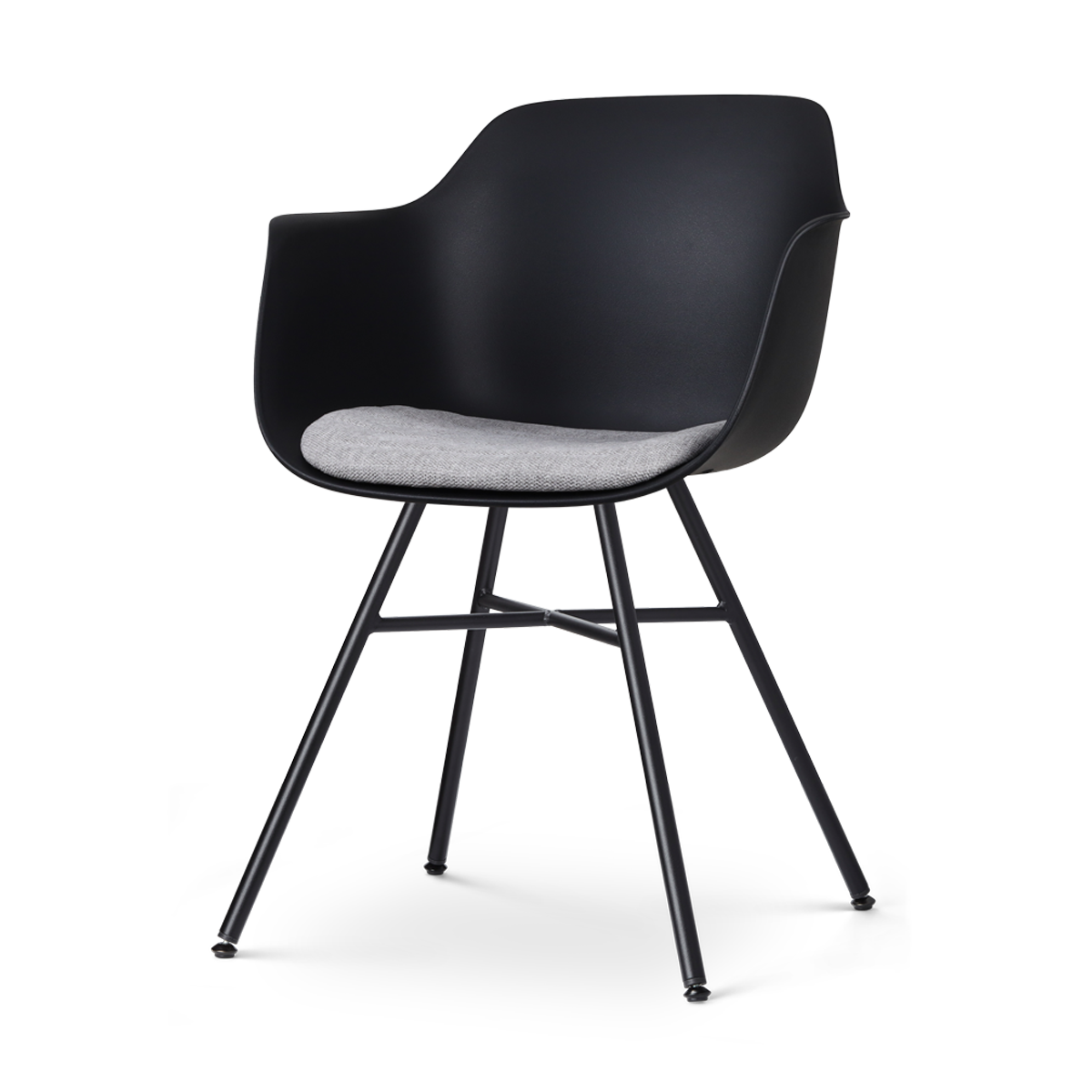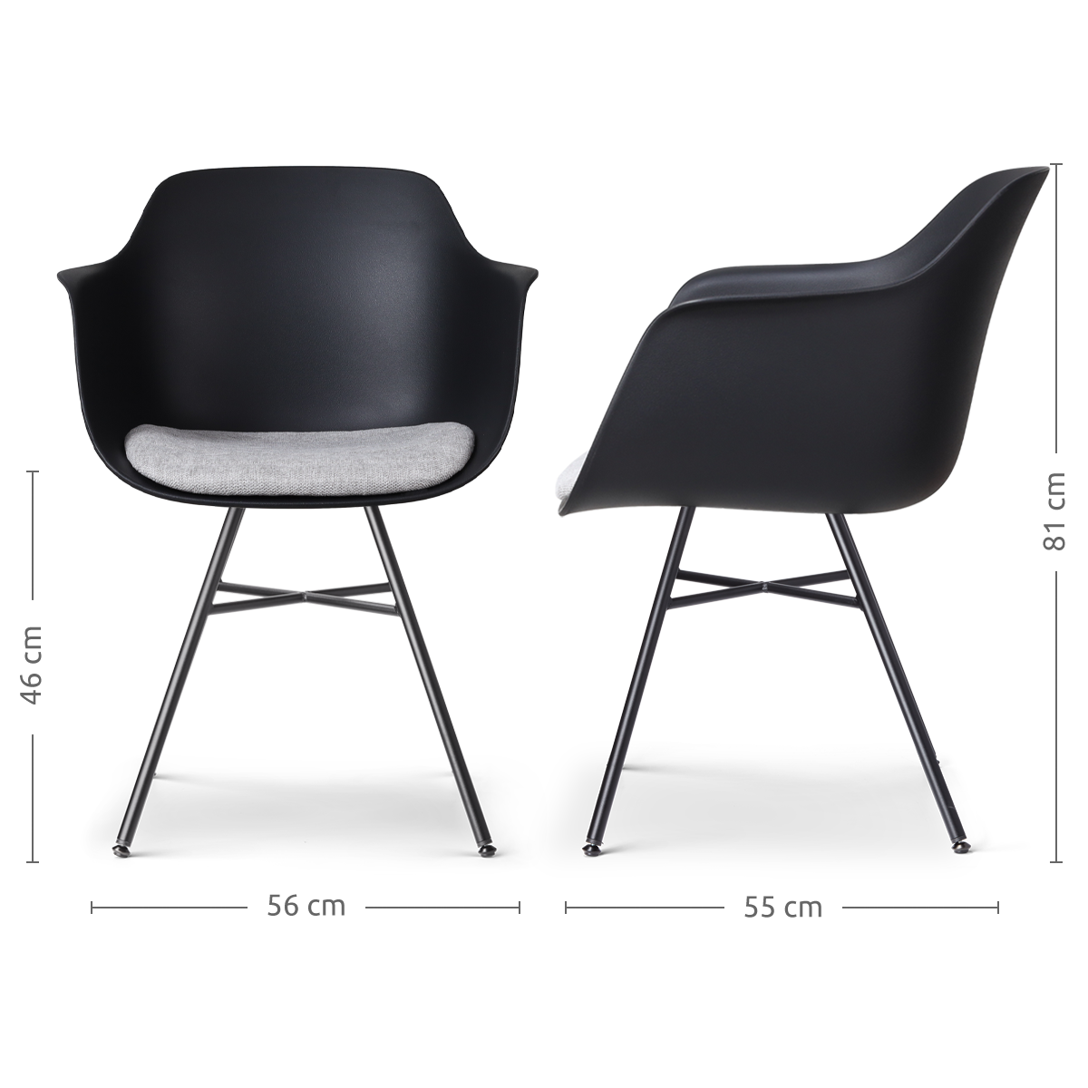 - De stoel is afgewerkt met een zwart metalen onderstel met een kruis als detail