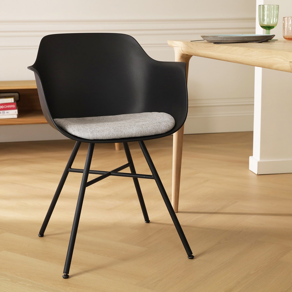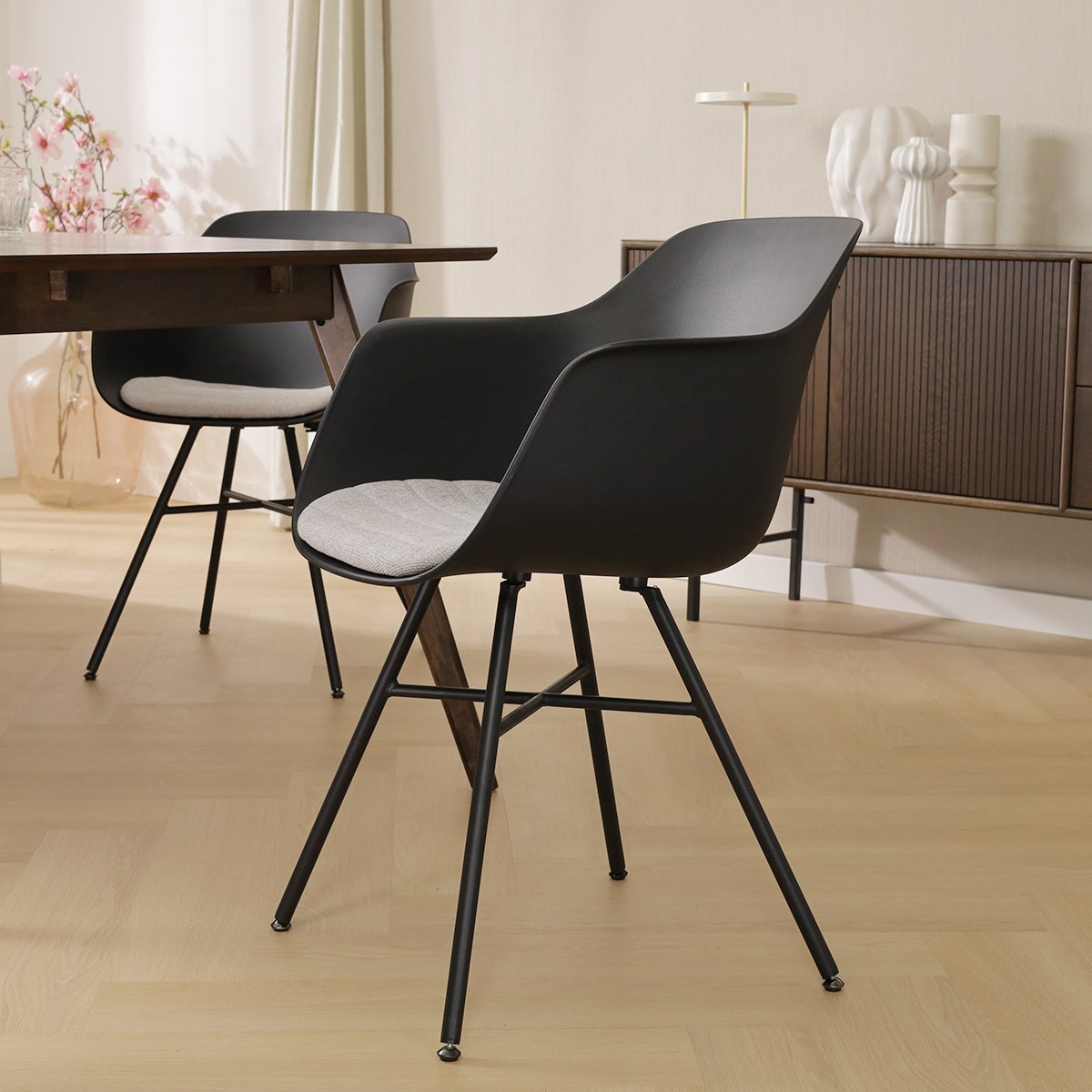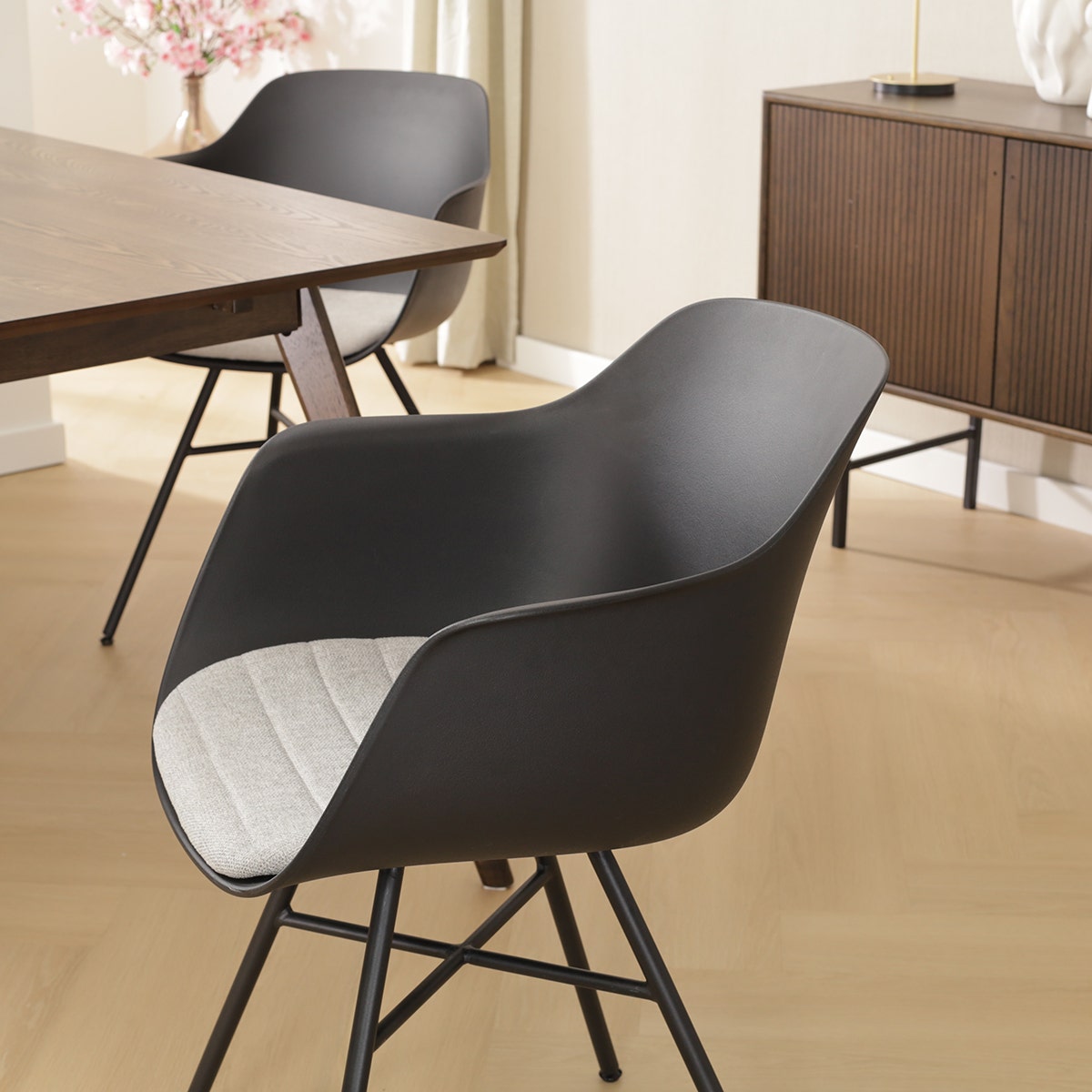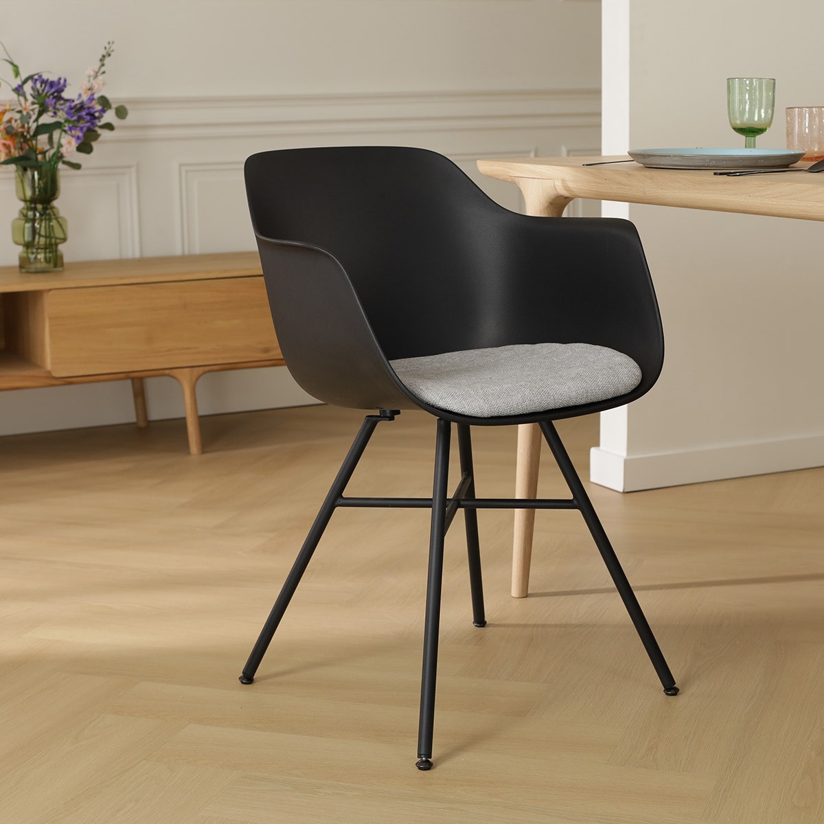Het leuke is dat je deze stoel zelf kunt samenstellen. Je kunt namelijk kiezen uit meerdere kleuren vaste zitkussens om jouw perfecte kuipstoel samen te stellen. Hierdoor creëer je een frisse uitstraling in je interieur. Bovendien heeft de zitting armleuningen die jouw extra comfort bieden. De eetkamerstoel is afgewerkt met een metalen onderstel met een kruis in het midden als leuk detail. Zie jij jezelf al genieten in deze comfortabele eetkamerstoel?