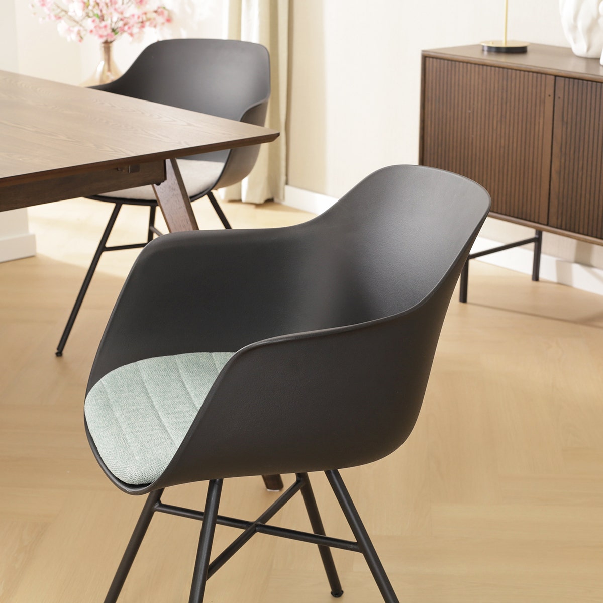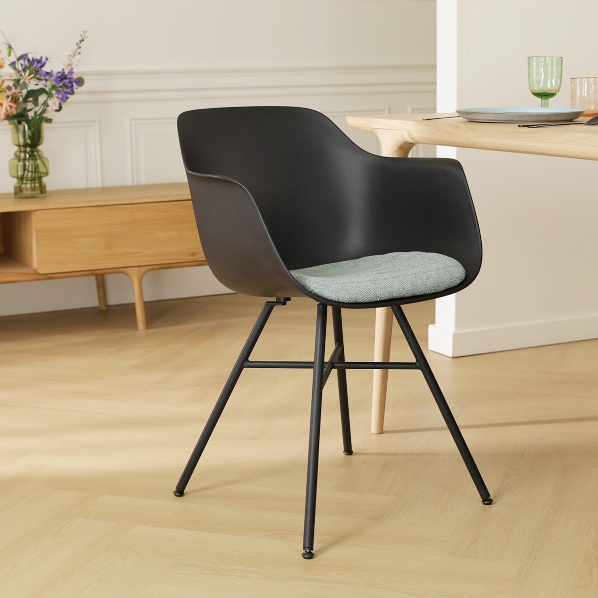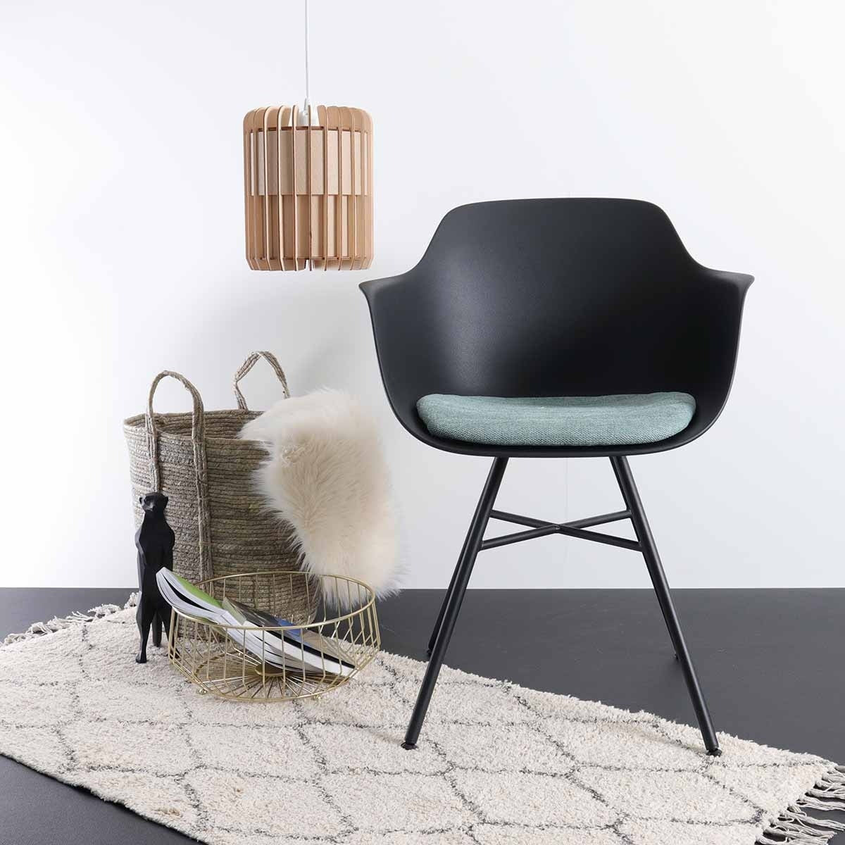 Het leuke is dat je deze stoel zelf kunt samenstellen. Je kunt namelijk kiezen uit meerdere kleuren vaste zitkussens om jouw perfecte kuipstoel samen te stellen. Hierdoor creëer je een frisse uitstraling in je interieur. Bovendien heeft de zitting armleuningen die jouw extra comfort bieden. De eetkamerstoel is afgewerkt met een metalen onderstel met een kruis in het midden als leuk detail. Zie jij jezelf al genieten in deze comfortabele eetkamerstoel?