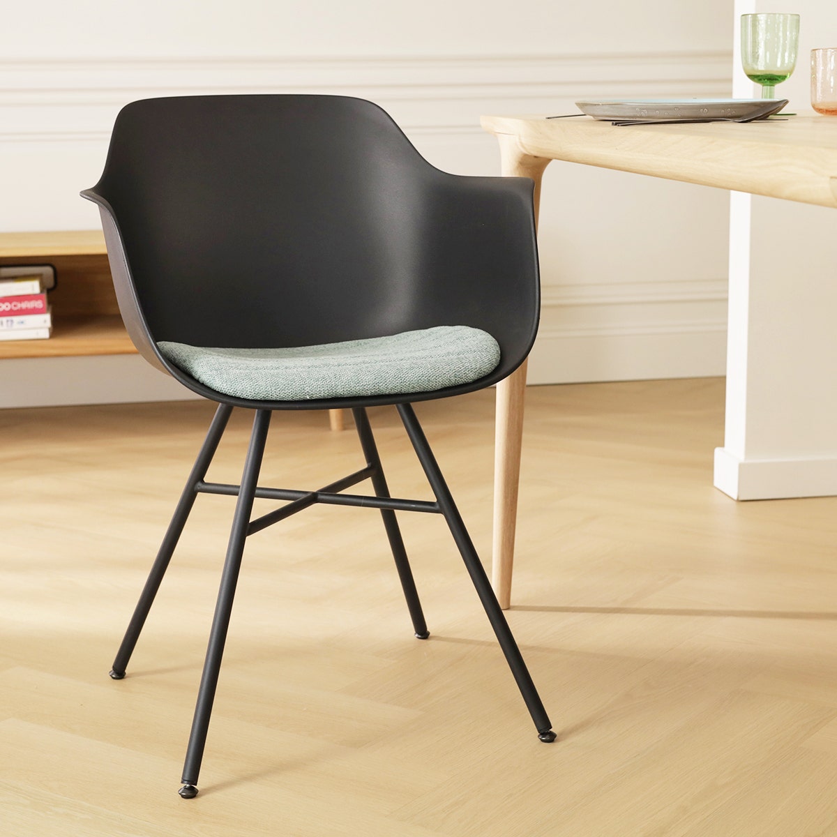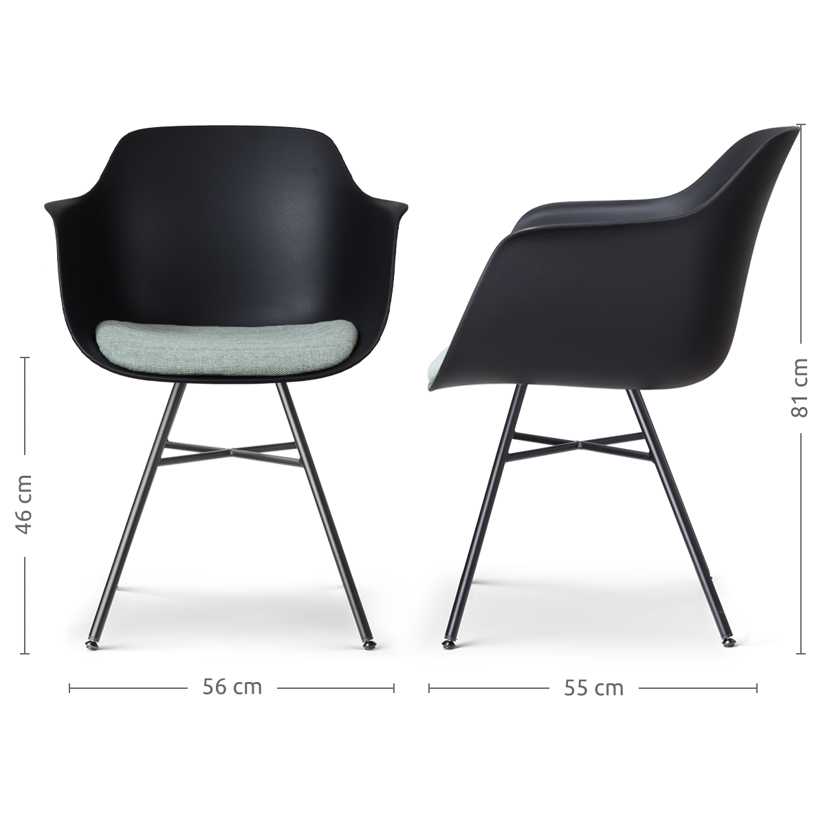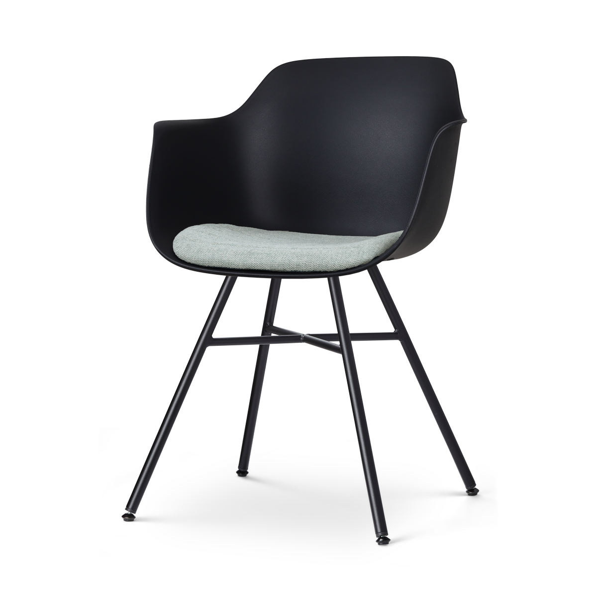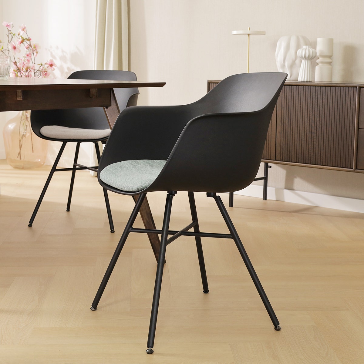 Het leuke is dat je deze stoel zelf kunt samenstellen. Je kunt namelijk kiezen uit meerdere kleuren vaste zitkussens om jouw perfecte kuipstoel samen te stellen. Hierdoor creëer je een frisse uitstraling in je interieur. Bovendien heeft de zitting armleuningen die jouw extra comfort bieden. De eetkamerstoel is afgewerkt met een metalen onderstel met een kruis in het midden als leuk detail. Zie jij jezelf al genieten in deze comfortabele eetkamerstoel?