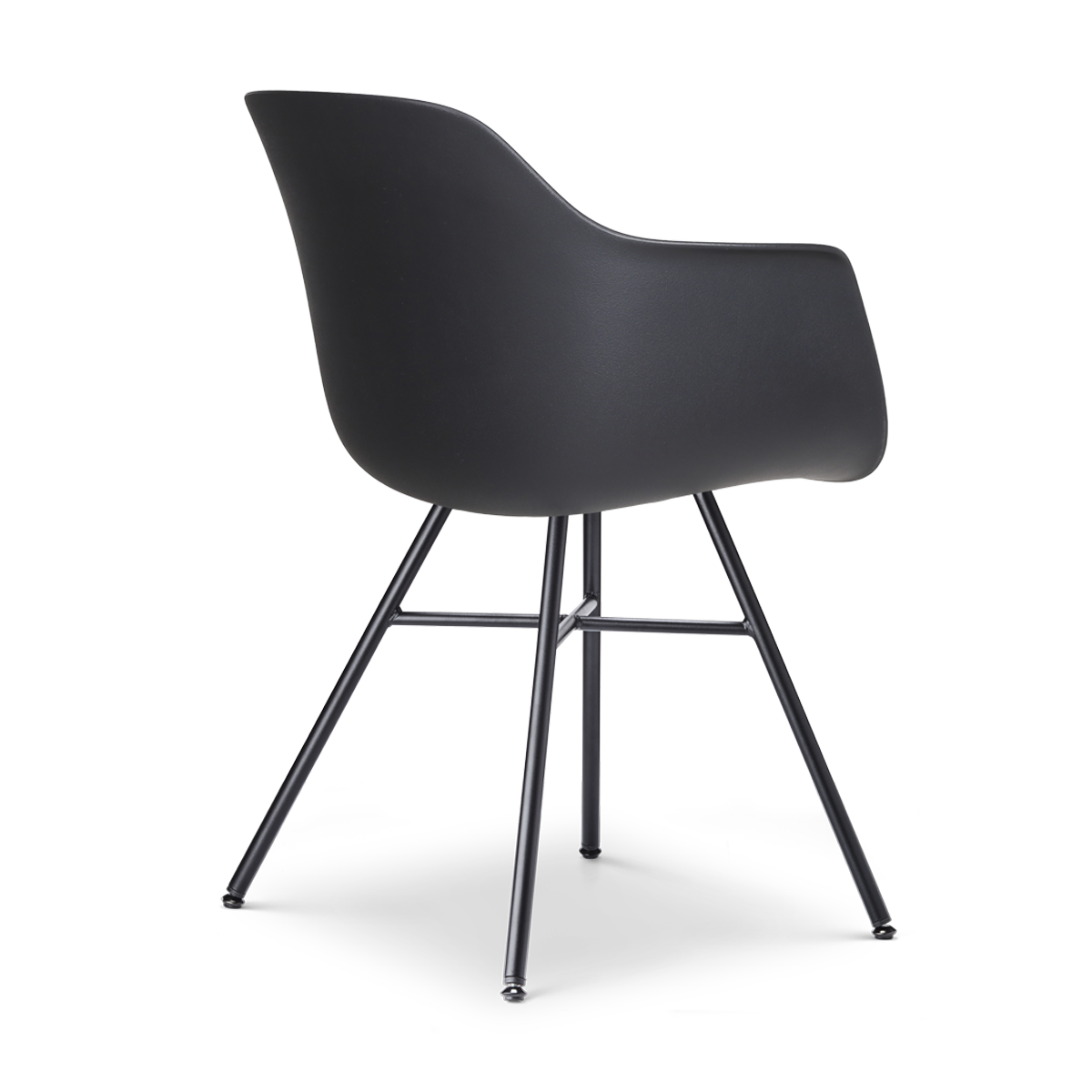 - De stoel is afgewerkt met een zwart metalen onderstel met een kruis als detail