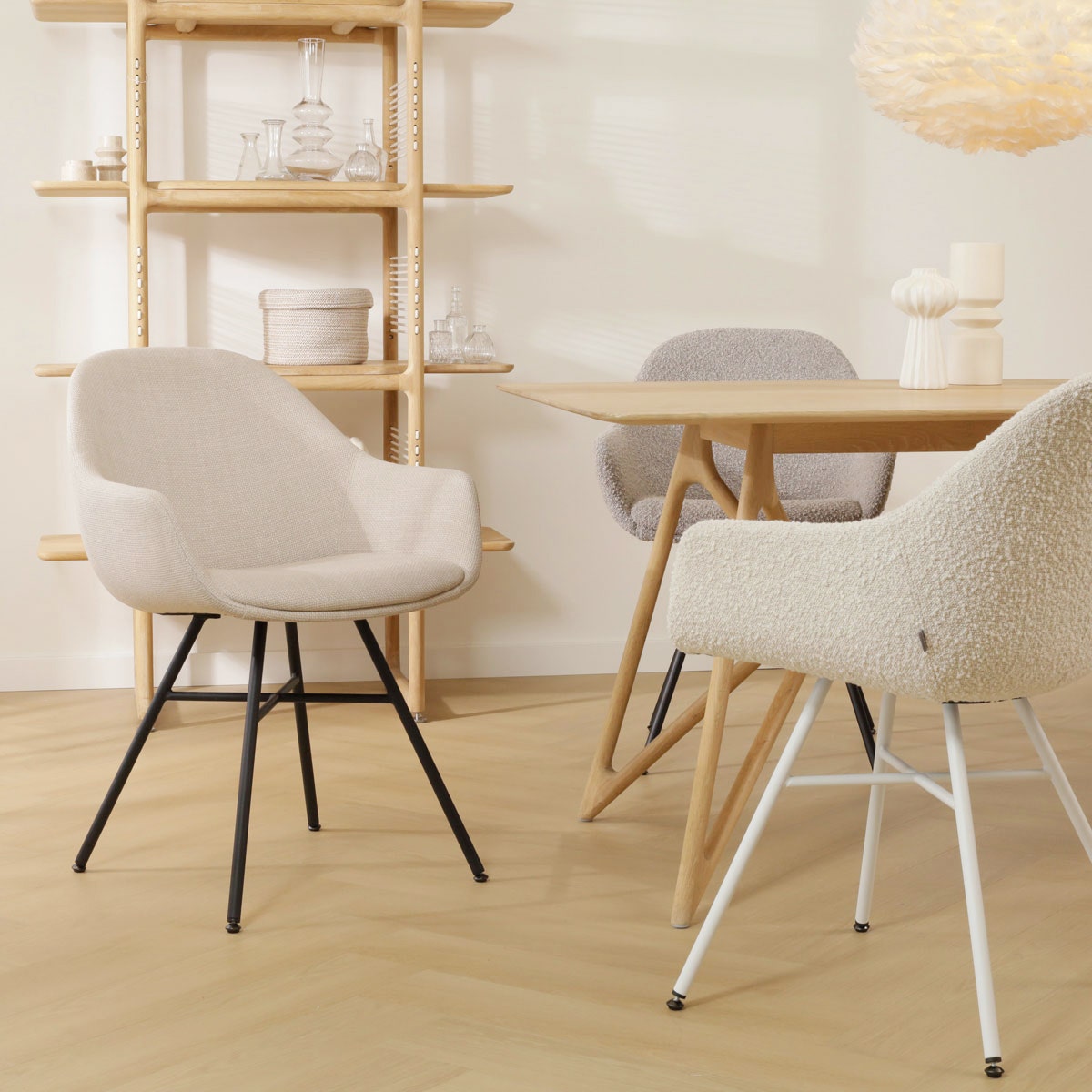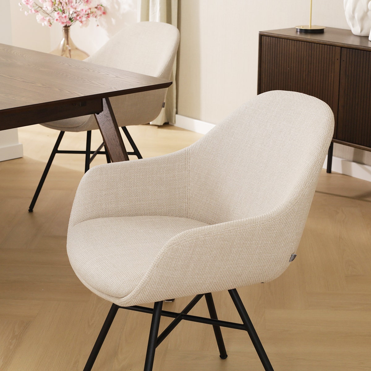 Deze stoffen eetkamerstoel heeft een moderne uitstraling dankzij de strakke lijnen van het onderstel en de subtiele rondingen van de zitting. Het zwarte metalen onderstel met kruisverbinding zorgt voor een stabiele zit en laat de eetkamerstoel tegelijkertijd modern ogen. De verstelbare voetpootjes zorgen ervoor dat de eetkamerstoel stevig op elke ondergrond staat. Dankzij de schuin aflopende armleuningen van de stoel kan je een fijne ontspannen zithouding aannemen, terwijl ook de zachte bekleding zorgt voor extra zitgemak. De combinatie van de beige stof met de zwarte poten zorgt voor een tijdloos design dat in vrijwel iedere woonstijl past, van Scandinavisch tot japandi en modern. Kortom, de stoere Noa-Mae eetkamerstoel in het beige is altijd een goede keuze.