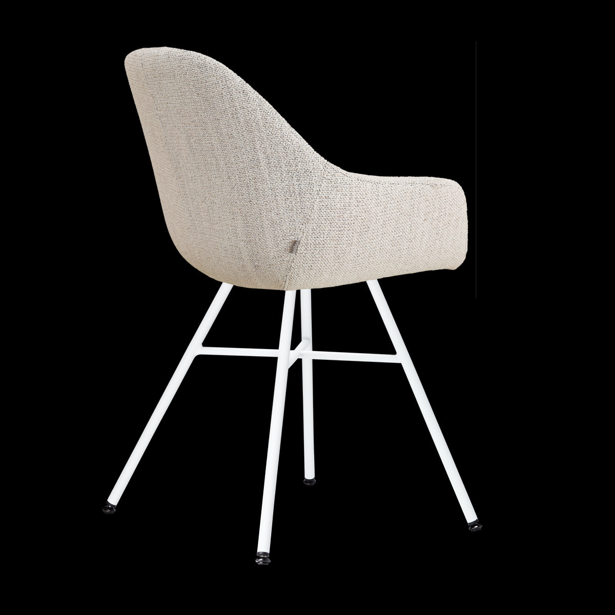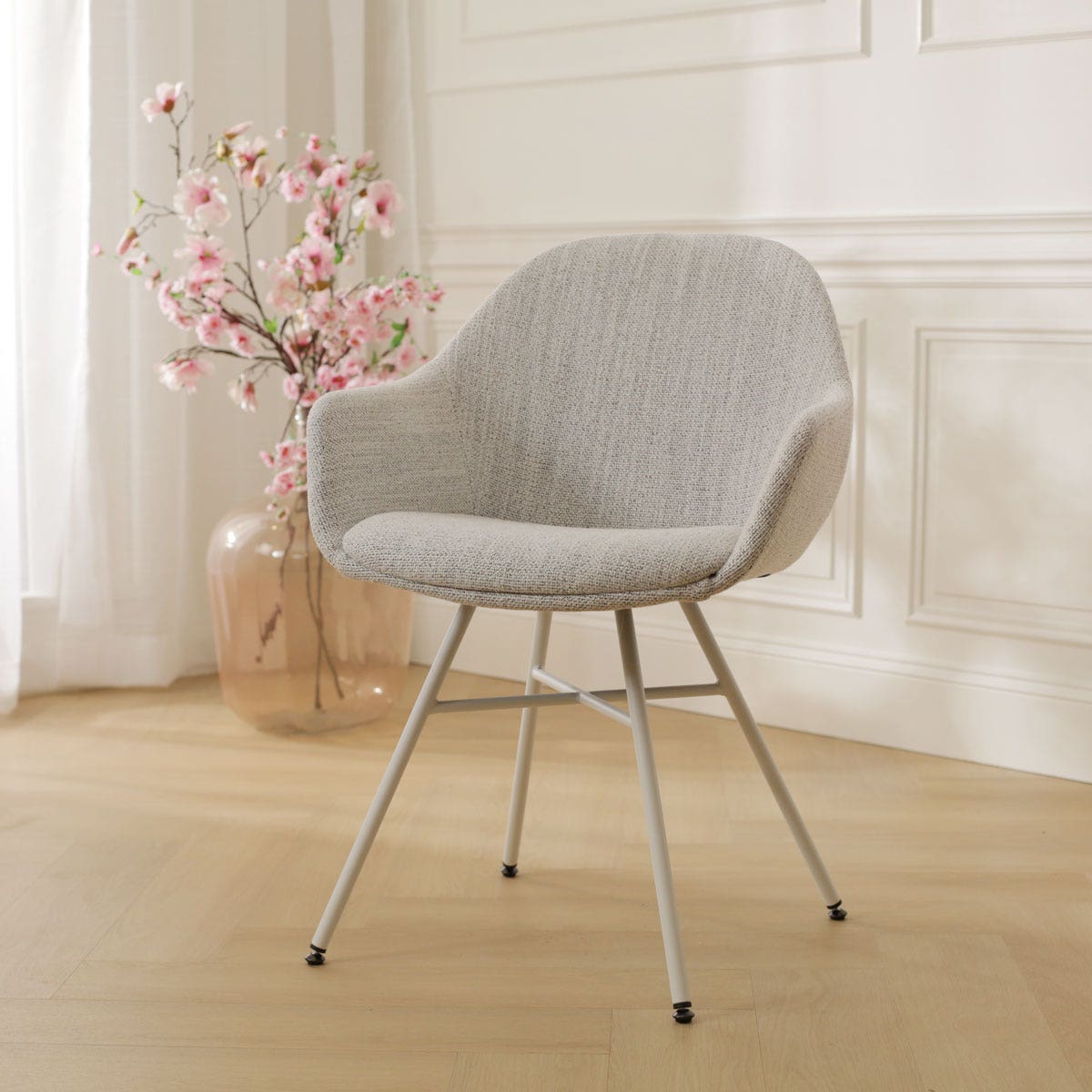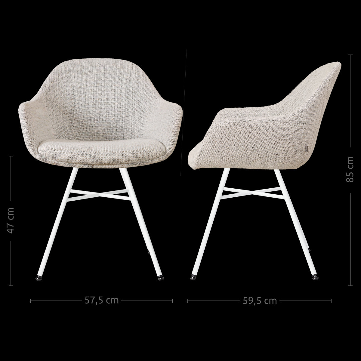 Deze eetkamerstoel combineert een eigentijdse uitstraling met comfort dankzij de strakke lijnen van het metalen onderstel en de zachte vormen van de zitting. Het witte frame met kruisverbinding geeft de stoel niet alleen een moderne look, maar zorgt ook voor een stabiele basis. De verstelbare pootjes van het witte onderstel garanderen dat de stoel stevig blijft staan, ongeacht de ondergrond. Met de licht hellende armleuningen neem je eenvoudig een ontspannen zithouding aan, terwijl de zachte stoffering en het vaste zitkussen bijdragen aan extra comfort. De beige gemêleerde stoffen bekleding zorgt ervoor dat deze Scandinavische stoel is een stijlvolle match met elke inrichting en woonstijl is.