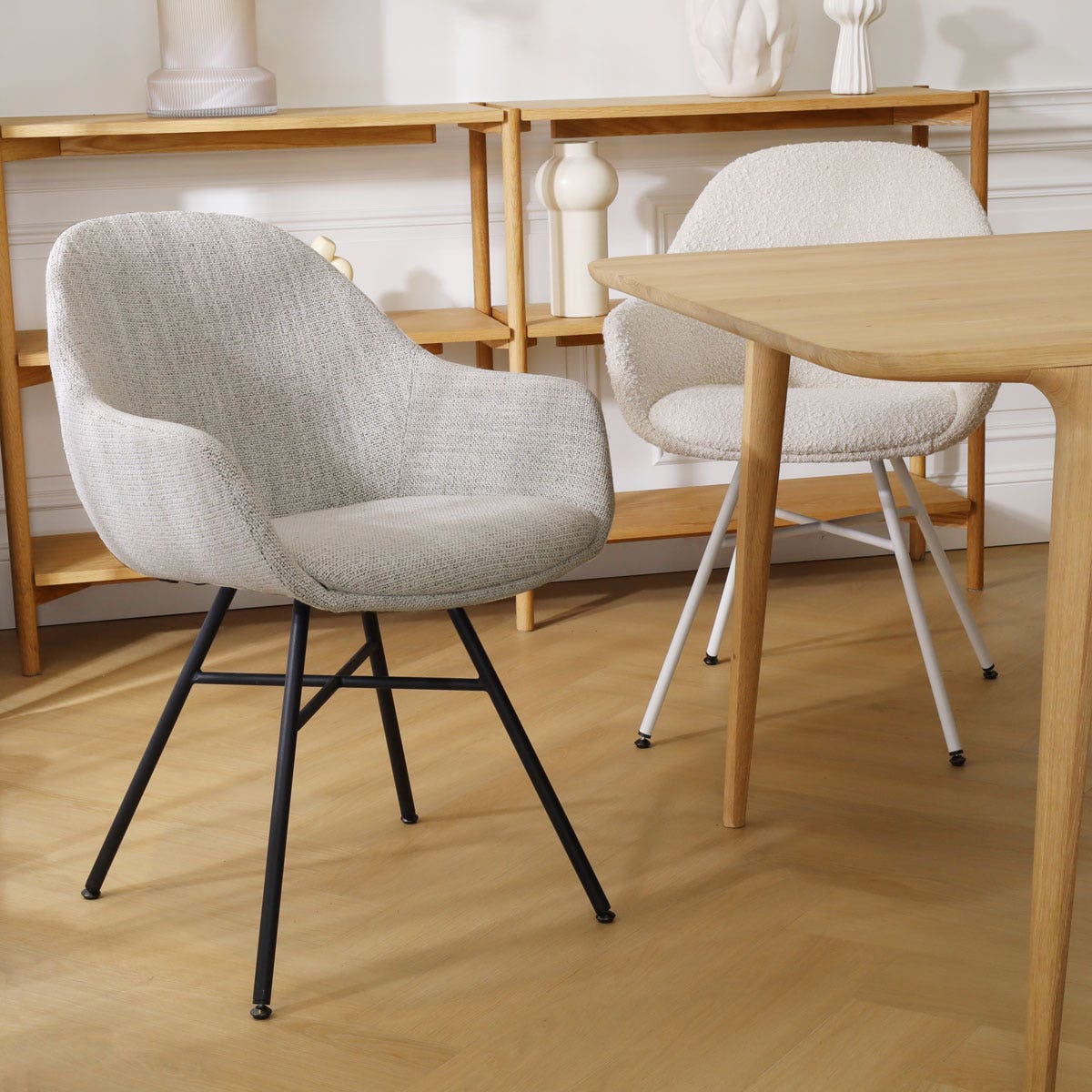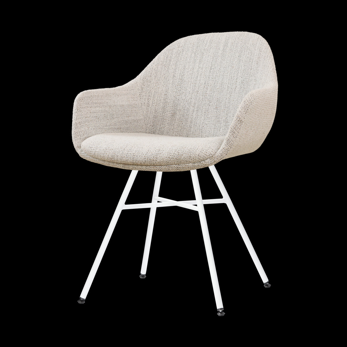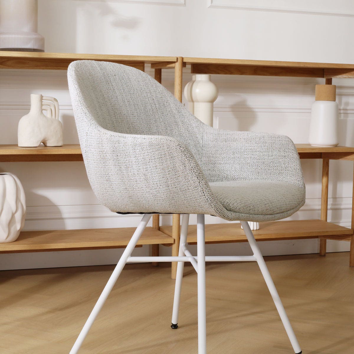 Deze eetkamerstoel combineert een eigentijdse uitstraling met comfort dankzij de strakke lijnen van het metalen onderstel en de zachte vormen van de zitting. Het witte frame met kruisverbinding geeft de stoel niet alleen een moderne look, maar zorgt ook voor een stabiele basis. De verstelbare pootjes van het witte onderstel garanderen dat de stoel stevig blijft staan, ongeacht de ondergrond. Met de licht hellende armleuningen neem je eenvoudig een ontspannen zithouding aan, terwijl de zachte stoffering en het vaste zitkussen bijdragen aan extra comfort. De beige gemêleerde stoffen bekleding zorgt ervoor dat deze Scandinavische stoel is een stijlvolle match met elke inrichting en woonstijl is.