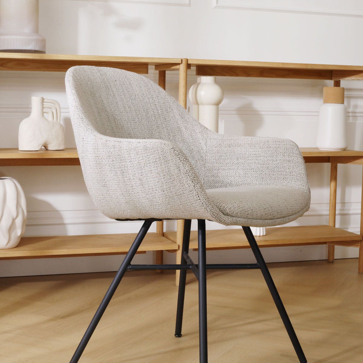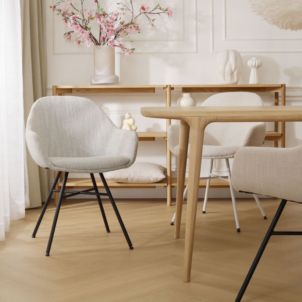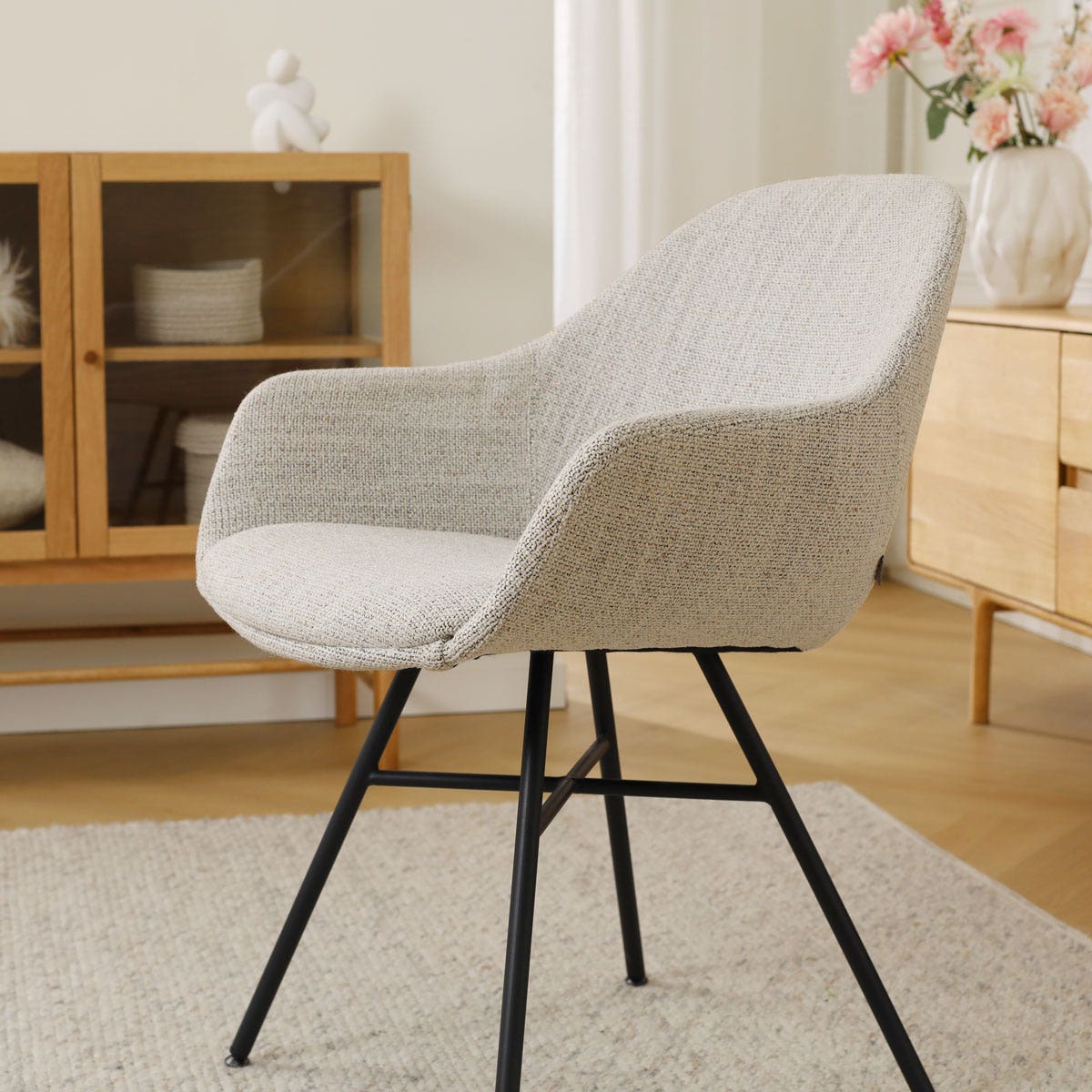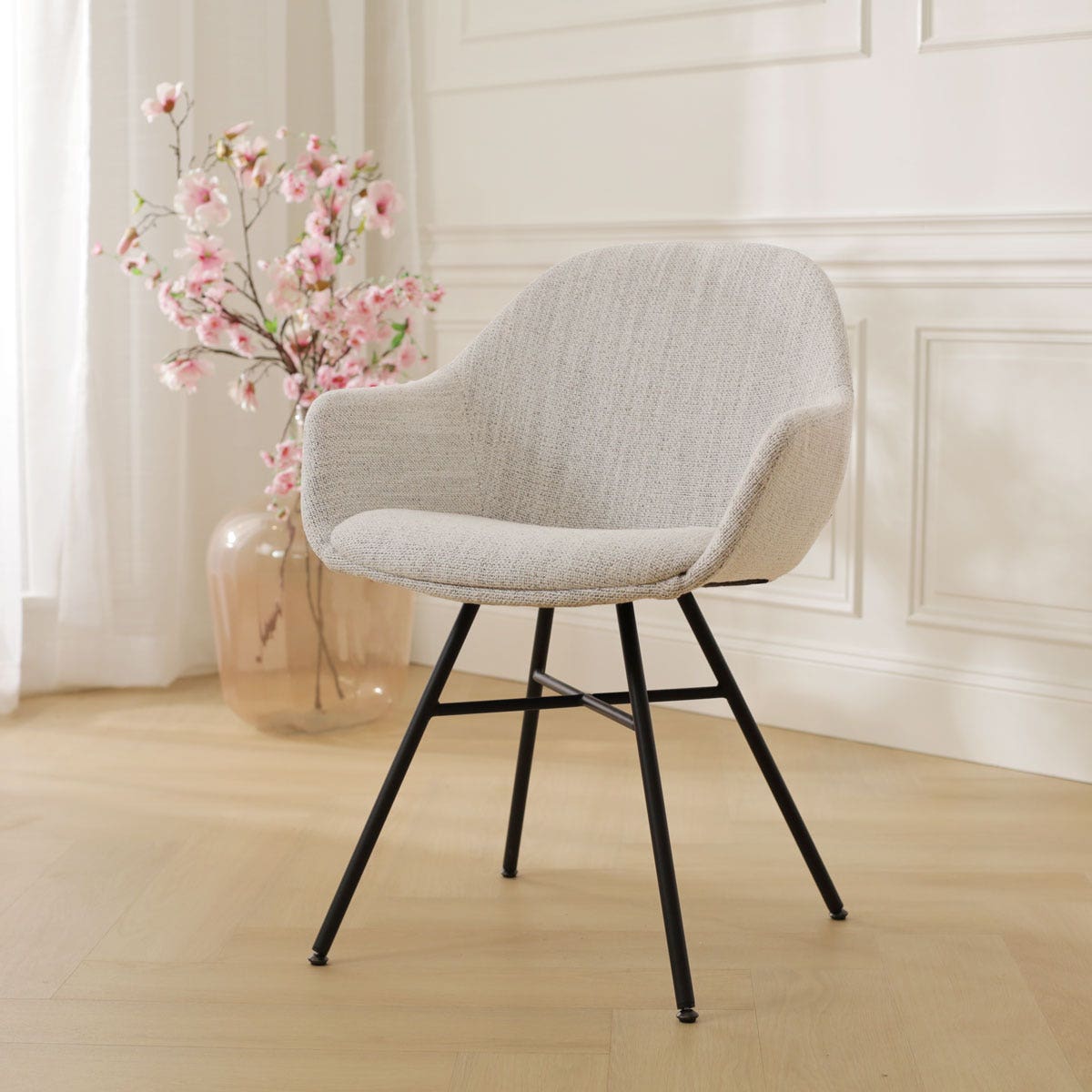 Geef je eetkamer een stijlvolle ambiance met de Noa-Mae beige gemêleerde eetkamerstoel met armleuningen van Nolon.
