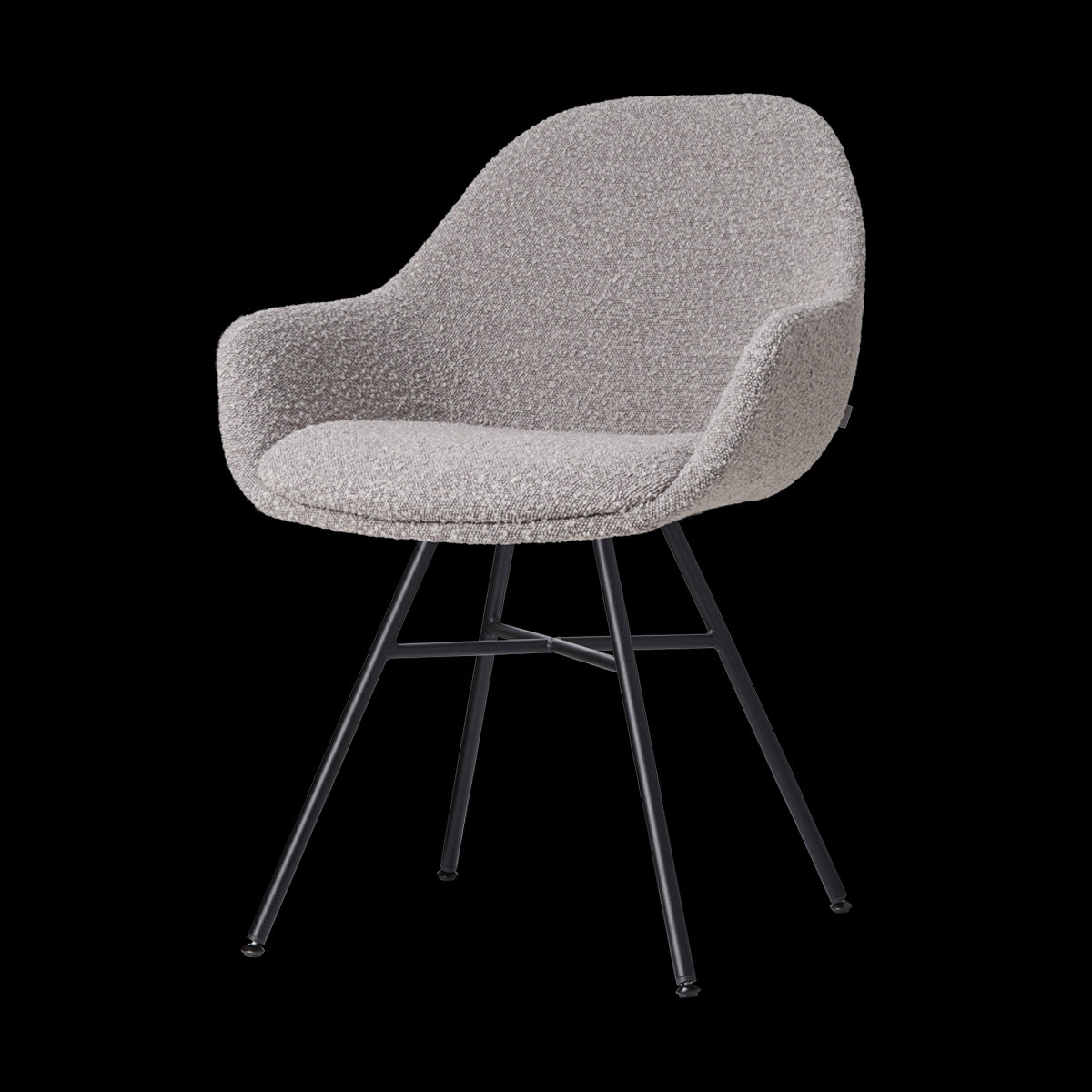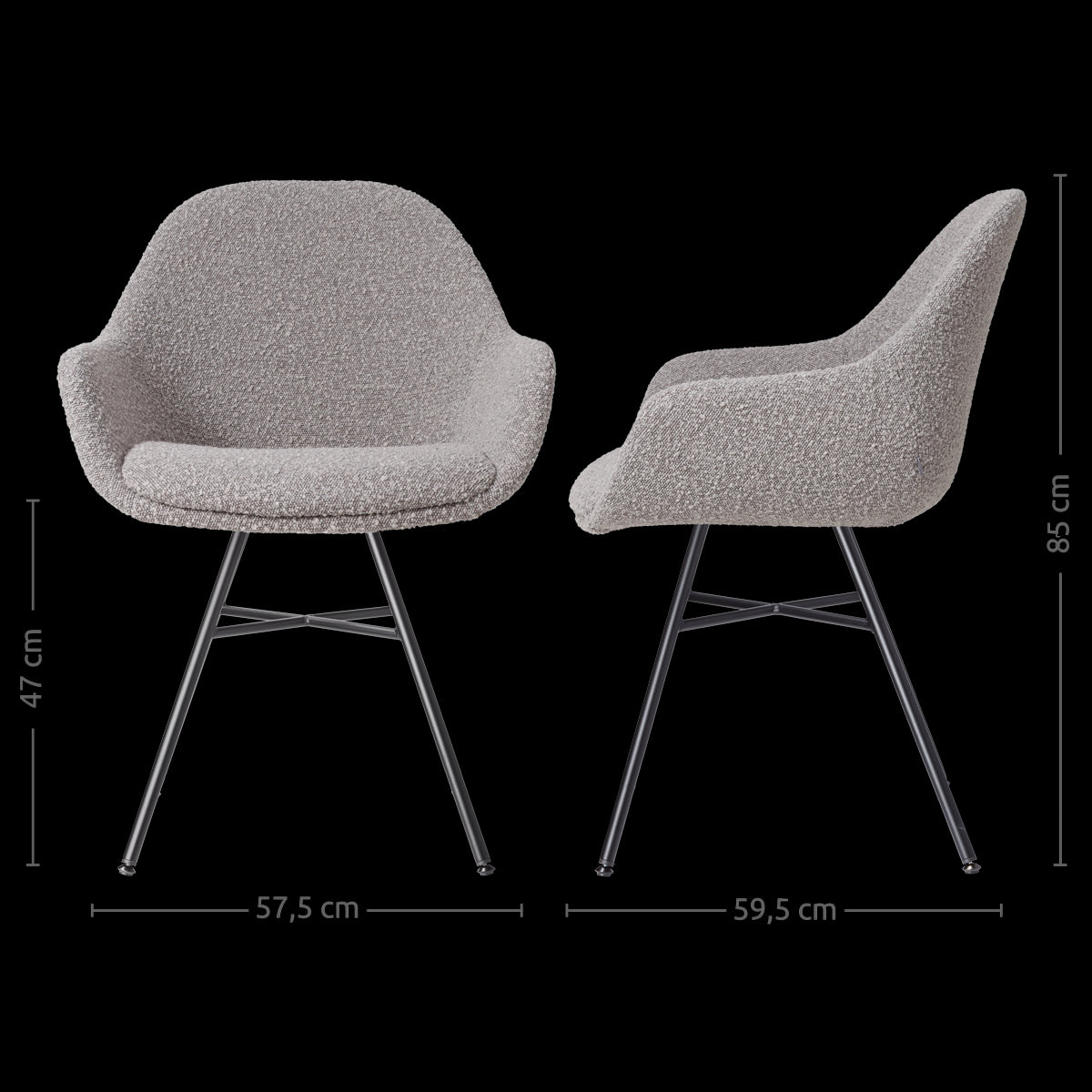 Een eethoek in hotel chique stijl creëer je in een handomdraai met de Noa-Mae eetkamerstoel met taupe bouclé stof en zwarte poten. De zachte bouclé bekleding voelt aangenaam aan en geeft de stoel een warme uitstraling, perfect voor een gezellige eetkamer. De taupe kleur is gemakkelijk te combineren met andere kleuren meubels en is bovendien een tijdloze keuze. De strakke lijnen van het metalen onderstel zorgen niet alleen voor stabiliteit, maar versterken ook de moderne uitstraling van de stoel. Dit moderne onderstel vormt een perfect contrast met de zachte stoffen bekleding. Deze stoel is daarnaast voorzien van armleuningen zodat comfortabel dineren een gegeven is. Naast een hotel chique woonstijl is de Noa-Mae eetkamerstoel ook zeker geschikt voor een eethoek in landelijke of industriële stijl.