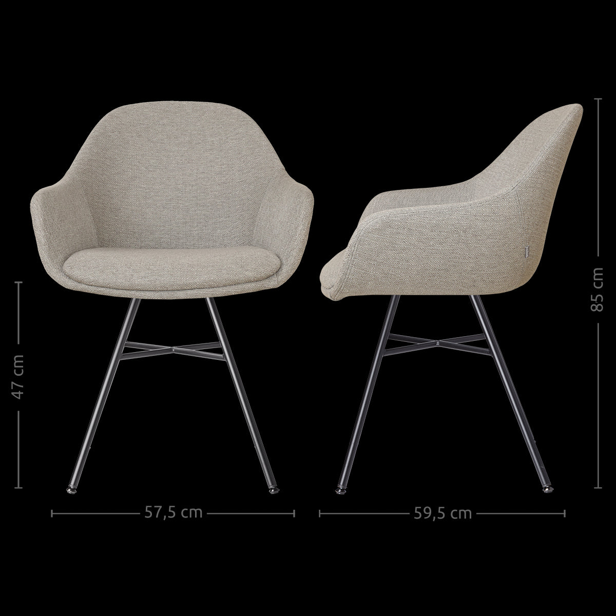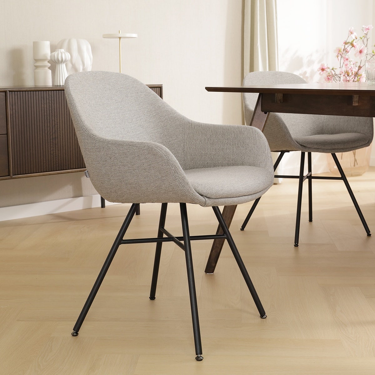 Grijze eetkamerstoel met armleuningen en zwarte poten.