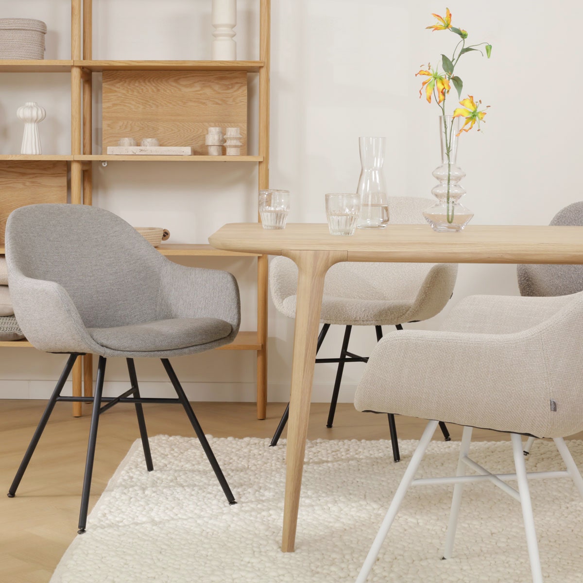 De grijze eetkamerstoel met zwarte poten Noa-Mae van Nolon is het perfecte voorbeeld van hoe comfort en stijl gecombineerd kunnen worden. Deze stoel heeft een zitting met luxe stoffen bekleding in een warm grijze tint. De zitting heeft een zacht zitvlak, schuin aflopende armleuningen en afgeronde vormen. Deze comfortabele stoffen zitting is gecombineerd met een modern metalen onderstel. De zwarte poten zijn voorzien van een kruisverbinding voor extra stabilteit, en hebben daarnaast verstelbare voetpootjes. Het ontwerp van de Noa-Mae straalt luxe uit dankzij de hoogwaardige materialen en subtiele rondingen. De warme grijstint van de zitting vormt een perfect contrast met de zwarte poten, wat de stoel geschikt maakt voor zowel een moderne als industriële woonstijl. Voor welk interieur je ook kiest, deze stoffen eetkamerstoel met zwarte poten past overal bij.