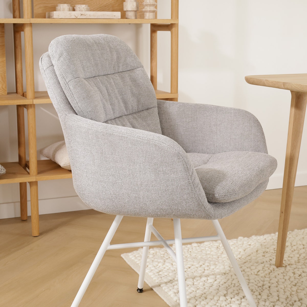 Het metalen onderstel met kruisverbinding heeft een stoere uitstraling en is voorzien van verstelbare voetpootjes, zodat de stoel op elke plek in huis stabiel staat. De gestoffeerde zitting is ontworpen met een hoge rugleuning en armleuningen voor optimaal comfort tijdens gezellig avonden en diners. Het vaste zitkussen draagt hier eveneens aan bij, maar zorgt er wel voor dat de zithoogte iets hoger is dan gemiddeld. Met de luxe stoffen bekleding en de zachte zitting zorgt deze stoel voor een warme sfeer in de eethoek. Of je nu kiest voor de beige of grijze bekleding, de Noa-Mia eetkamerstoel nodigt uit tot gezellig tafelen en uitgebreid dineren.