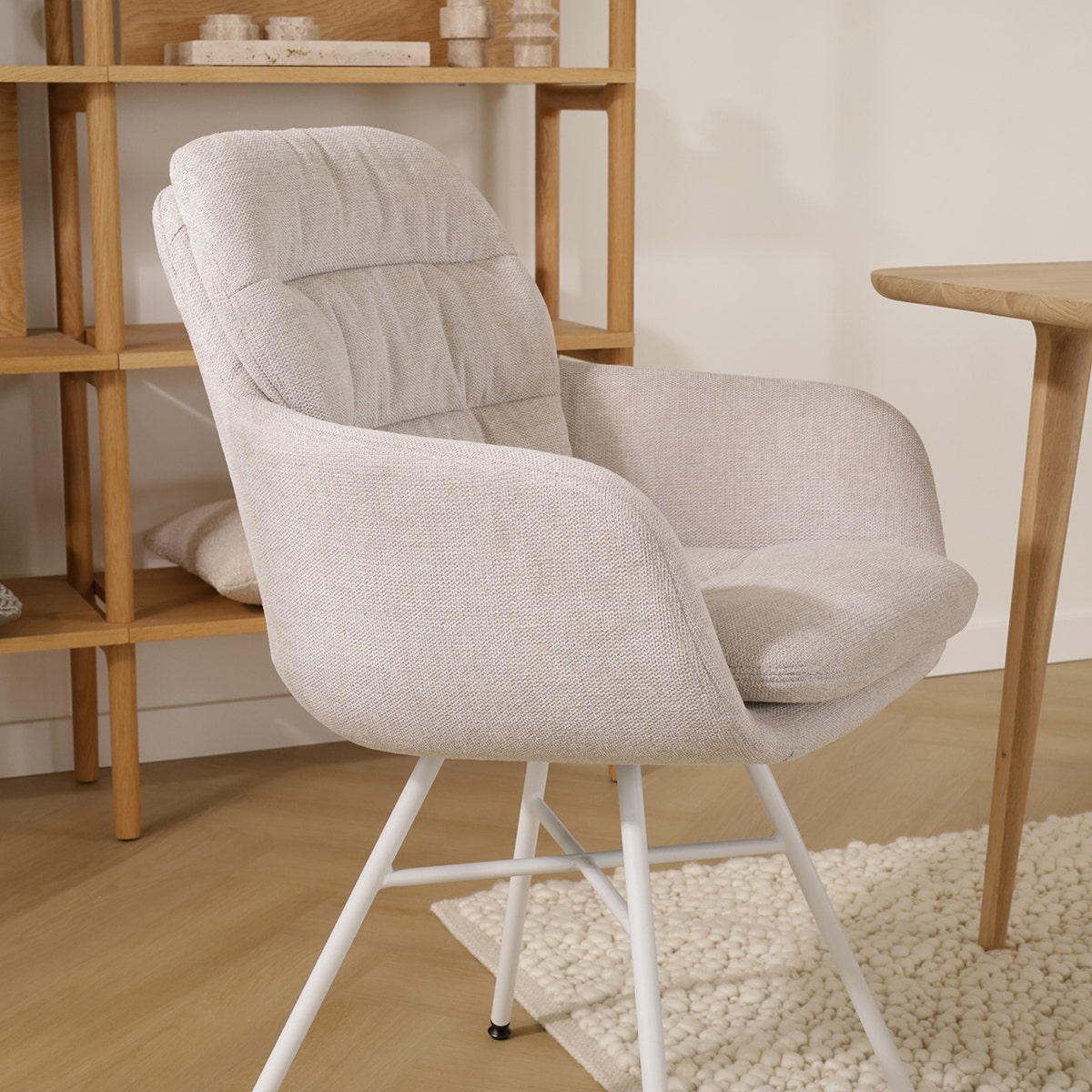 Het metalen onderstel met kruisverbinding heeft een stoere uitstraling en is voorzien van verstelbare voetpootjes, zodat de stoel op elke plek in huis stabiel staat. De gestoffeerde zitting is ontworpen met een hoge rugleuning en armleuningen voor optimaal comfort tijdens gezellig avonden en diners. Het vaste zitkussen draagt hier eveneens aan bij, maar zorgt er wel voor dat de zithoogte iets hoger is dan gemiddeld. Met de luxe stoffen bekleding en de zachte zitting zorgt deze stoel voor een warme sfeer in de eethoek. Of je nu kiest voor de beige of grijze bekleding, de Noa-Mia eetkamerstoel nodigt uit tot gezellig tafelen en uitgebreid dineren.
