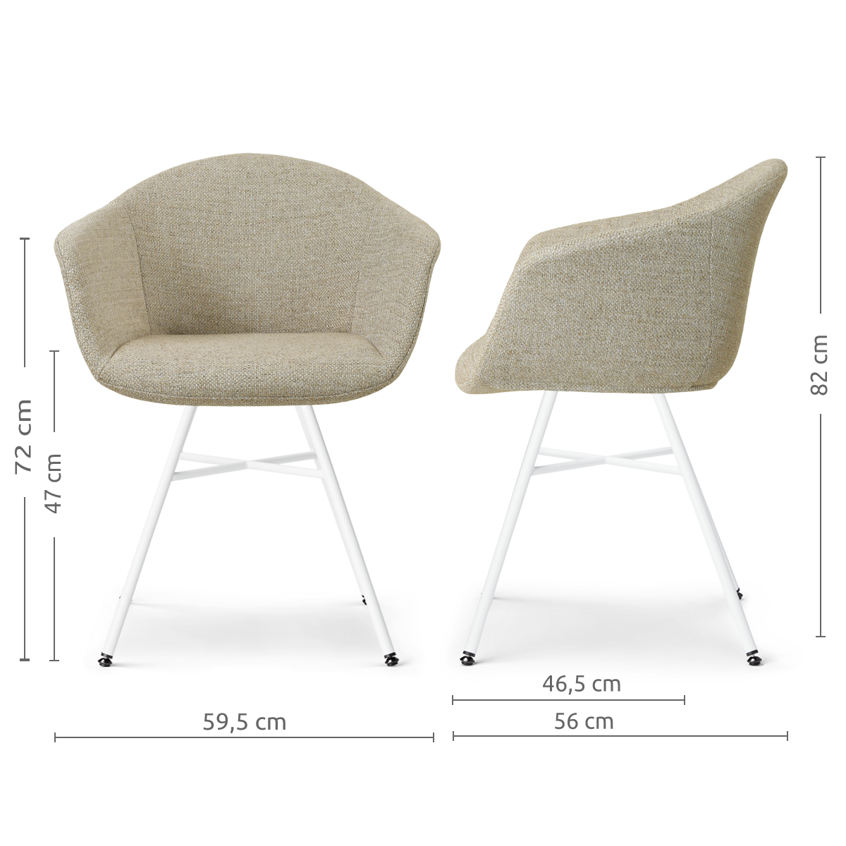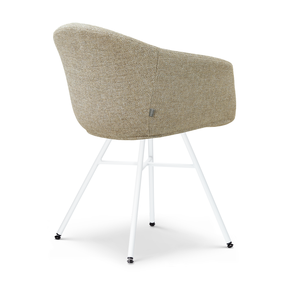 De Noa-Otis met taupekleurige zitting en oplopende armleuningen biedt zowel comfort als stijl. Het witte metalen onderstel met kruisverbinding versterkt het moderne en minimalistische karakter van de stoel, perfect passend in een Japandi eetkamer. De verstelbare voetpootjes zorgen ervoor dat de stoel altijd stabiel staat, ook op een ongelijke vloer.