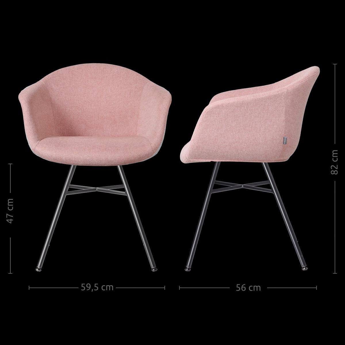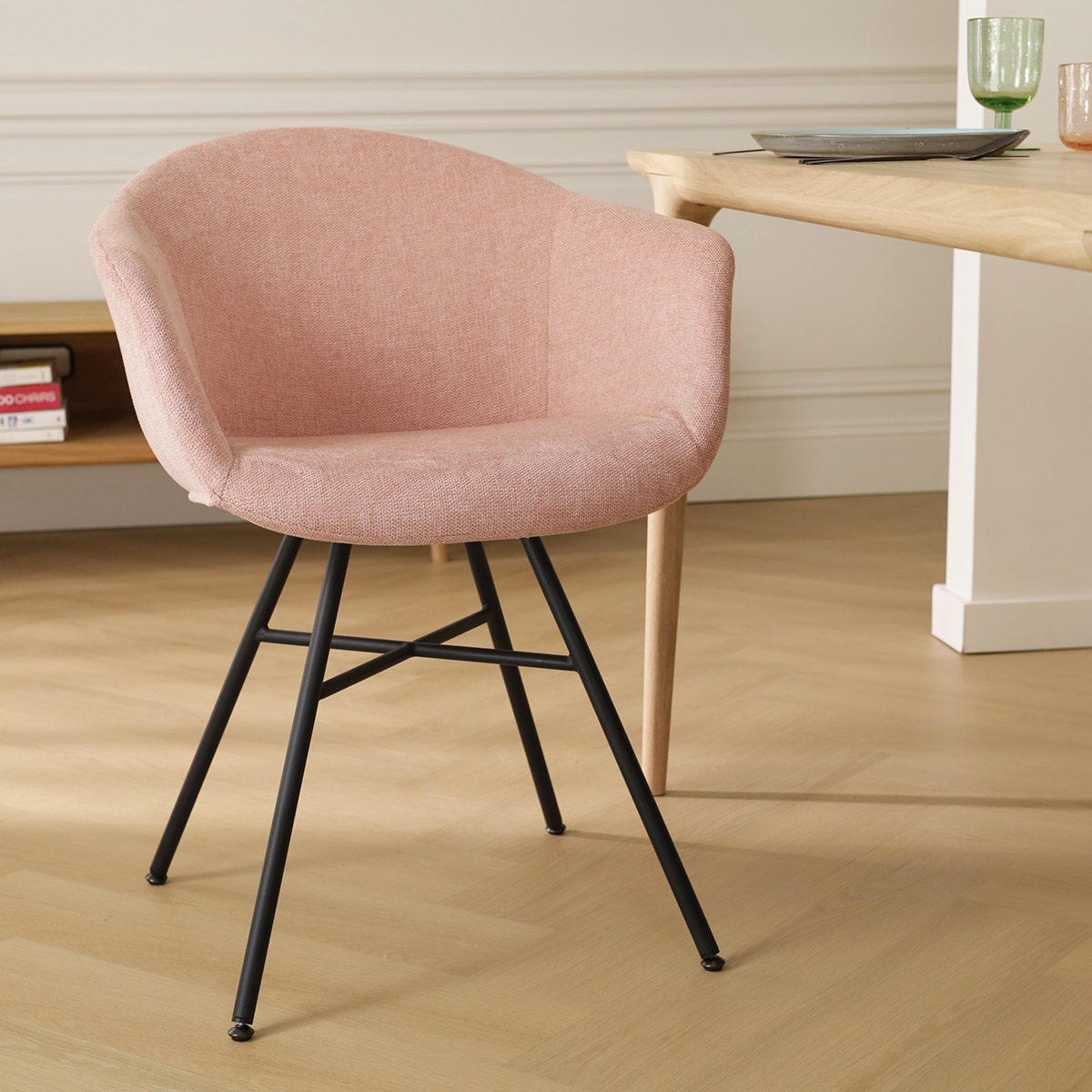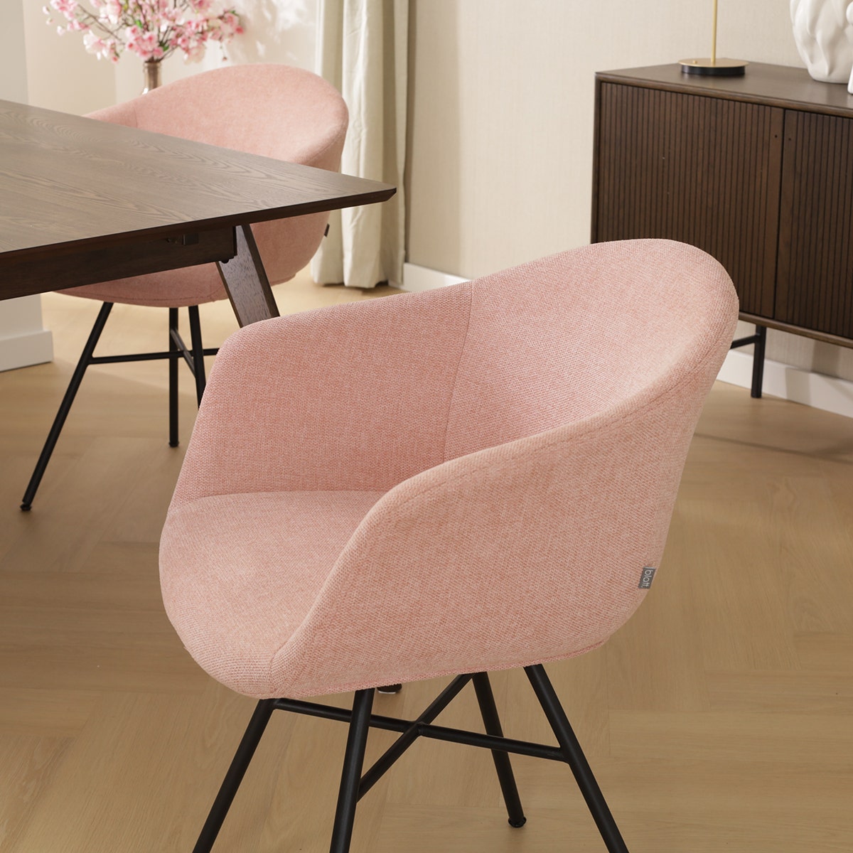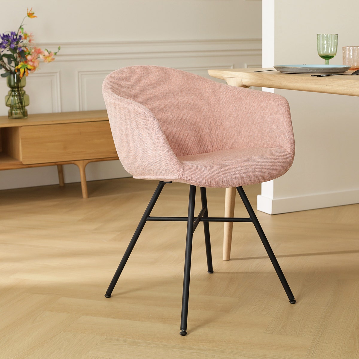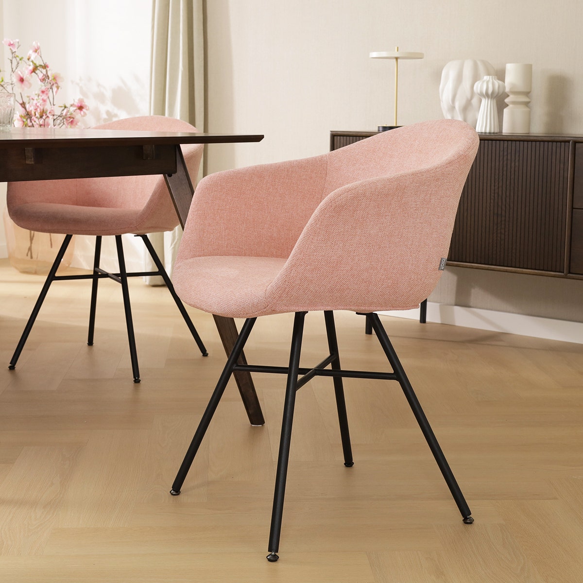 Deze eetkamerstoel heeft een moderne uitstraling dankzij de strakke lijnen van het onderstel en de contrasterende ronde vormen van de ergonomische kuipzitting. Het metalen frame met kruisverbinding is voorzien van verstelbare voetpootjes, zodat de stoel op ieder oppervlak stabiel staat. De zitting is ontworpen met schuin oplopende armleuningen om extra ondersteuning te bieden en is bekleed met hoogwaardige stof. Deze bekleding is verkrijgbaar in zes verschillende kleuren, zodat de Noa-Otis eetkamerstoel met elke woonstijl en ieder interieur te combineren is. Maak een keuze uit de beschikbare opties en voeg een vleugje moderne stijl toe aan je eethoek.