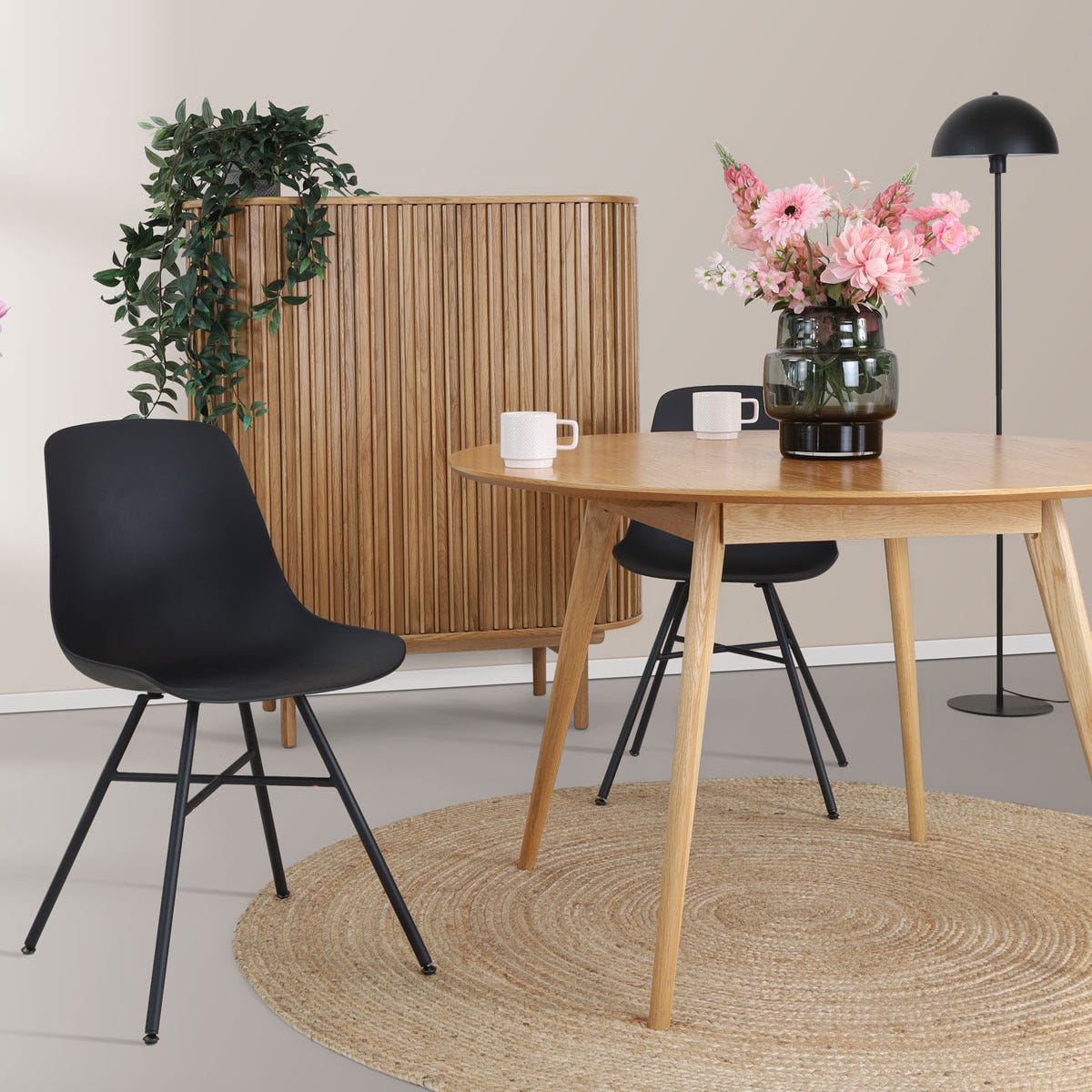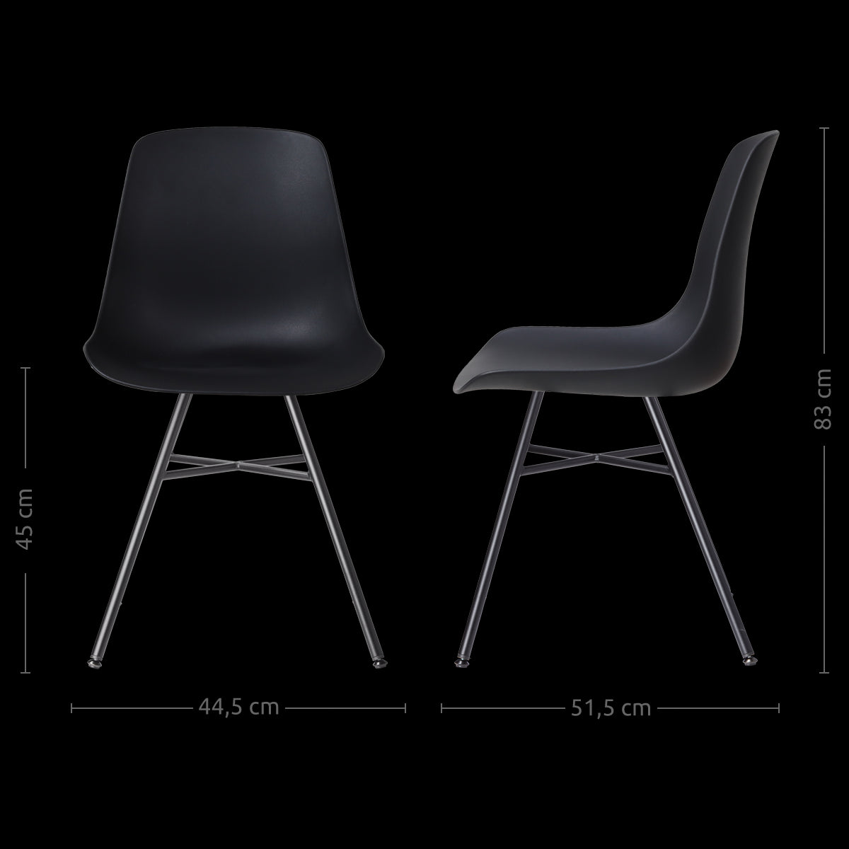 Het strakke design van het metalen onderstel in combinatie met de kunststof zitting maakt van deze stoel een echt modern design. De ronde metalen pootjes in combinatie met het kruis in het midden geeft deze eetkamerstoel net iets extra's. De kunststof zitting is slijtvast en van door en door gekleurd materiaal gemaakt, waardoor de stoel uitermate goed bestand is tegens dagelijks gebruik en onverhoopte krassen en beschadigingen. Dankzij de ergonomisch vorm van de zitting biedt deze voldoende zitcomfort voor een uitgebreid diner of gezellige borrelavond. Zit je toch graag iets zachter of wil je graag wat kleur in de eethoek? Combineer deze kunststof eetkamerstoel met witte of zwart kuip dan met het Fem stoelkussen van Nolon of neem een kijkje bij de Noa-Liv eetkamerstoel. Dit is namelijk hetzelfde ontwerp maar dan met een vast zitkussen.