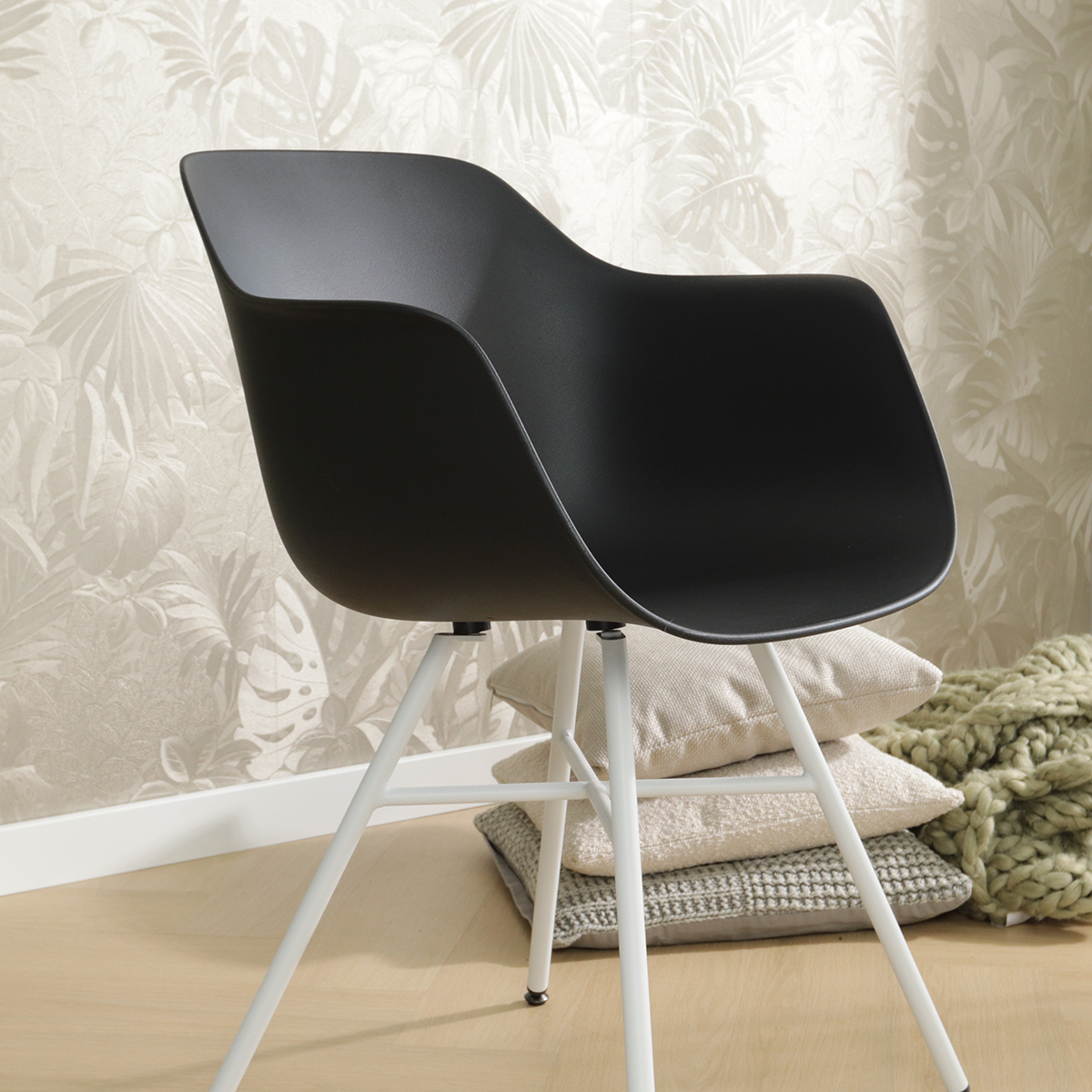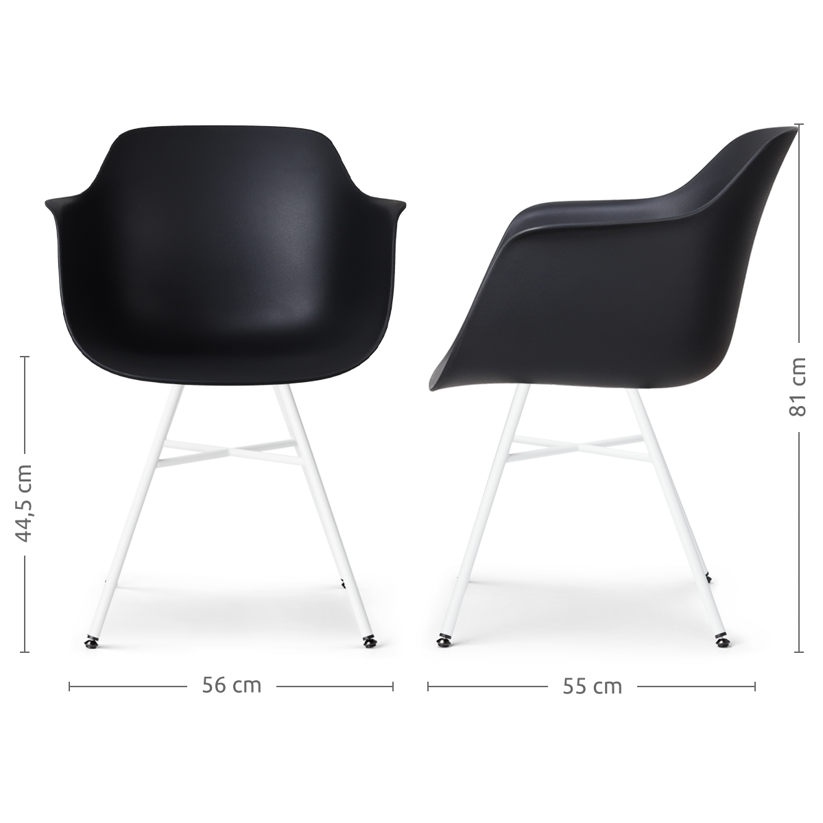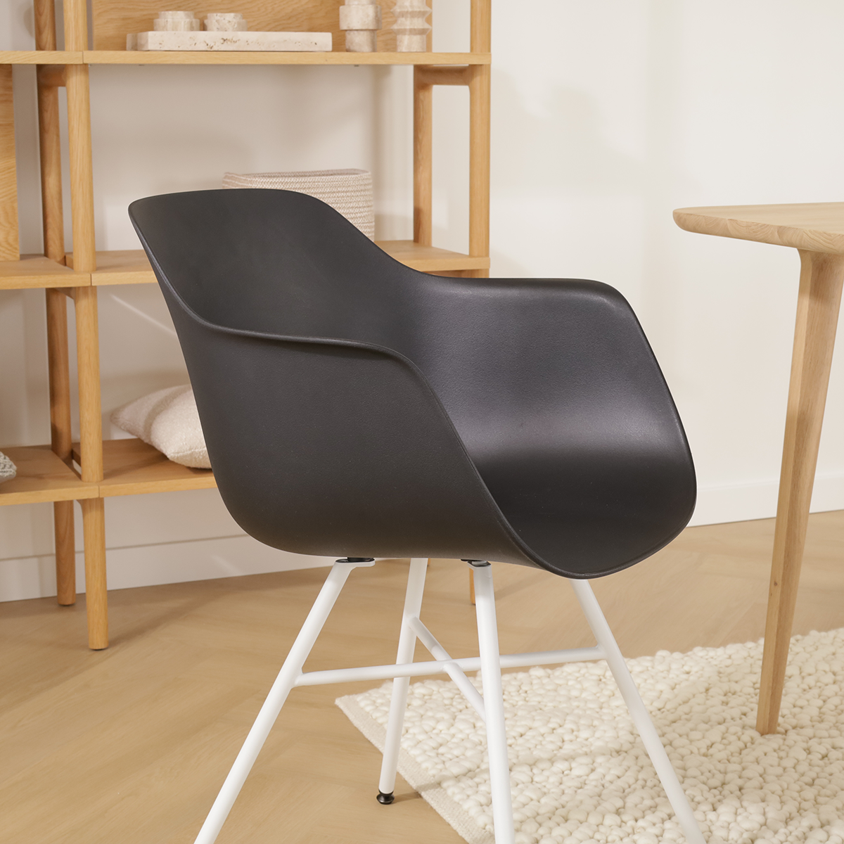 Deze kuipstoel is voorzien van comfortabele armleuningen en is gemaakt van duurzaam kunststof, wat zorgt voor een onderhoudsvriendelijke zitting. De stoel is 81 cm hoog, met een zithoogte van 45 cm en een zitdiepte van 46 cm, waardoor hij ideaal is voor lange maaltijden en gezellige avonden. Het metalen onderstel met witte poten geeft de stoel een eigentijdse look, en de zwart-witte kleurcombinatie maakt hem makkelijk te combineren met verschillende interieurstijlen. Hoewel de stoel niet draaibaar is, biedt hij dankzij de ergonomische vorm en stevige constructie een aangenaam zitcomfort. De Noa-Puk eetkamerstoel is perfect voor iedereen die op zoek is naar een moderne, functionele en trendy stoel voor in de eetkamer.