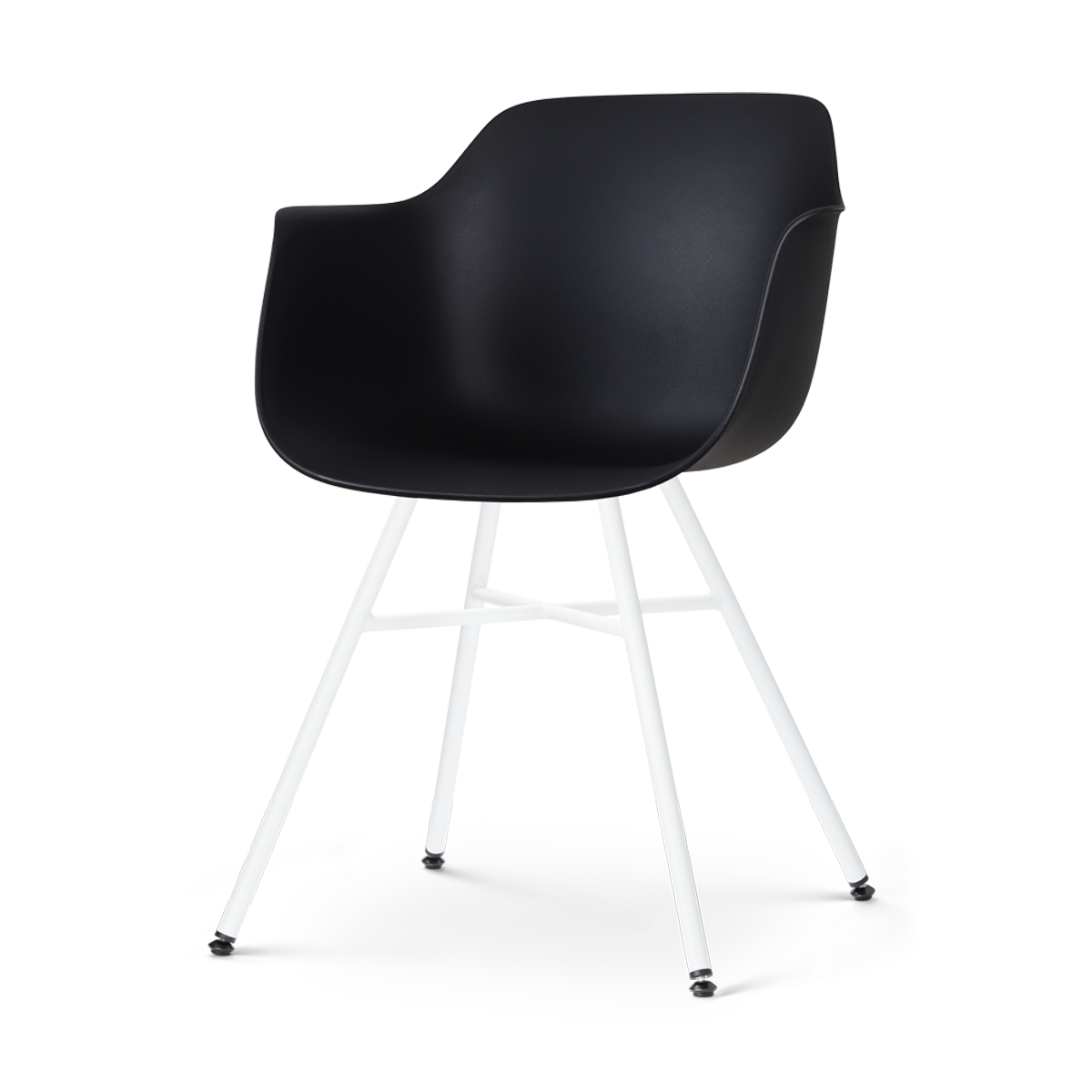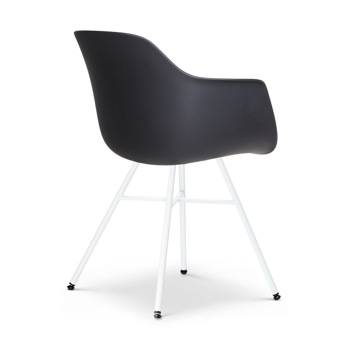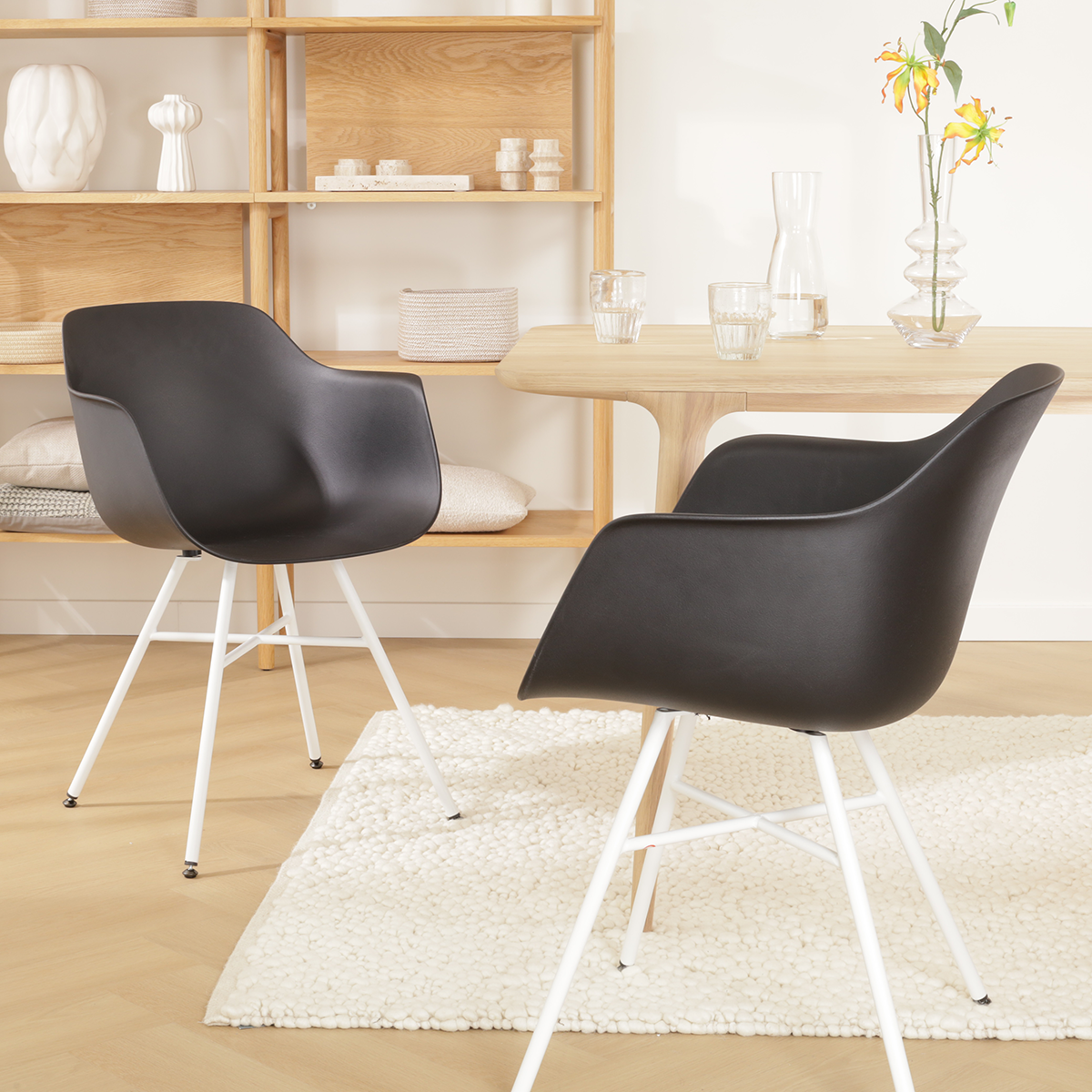 Deze kuipstoel is voorzien van comfortabele armleuningen en is gemaakt van duurzaam kunststof, wat zorgt voor een onderhoudsvriendelijke zitting. De stoel is 81 cm hoog, met een zithoogte van 45 cm en een zitdiepte van 46 cm, waardoor hij ideaal is voor lange maaltijden en gezellige avonden. Het metalen onderstel met witte poten geeft de stoel een eigentijdse look, en de zwart-witte kleurcombinatie maakt hem makkelijk te combineren met verschillende interieurstijlen. Hoewel de stoel niet draaibaar is, biedt hij dankzij de ergonomische vorm en stevige constructie een aangenaam zitcomfort. De Noa-Puk eetkamerstoel is perfect voor iedereen die op zoek is naar een moderne, functionele en trendy stoel voor in de eetkamer.