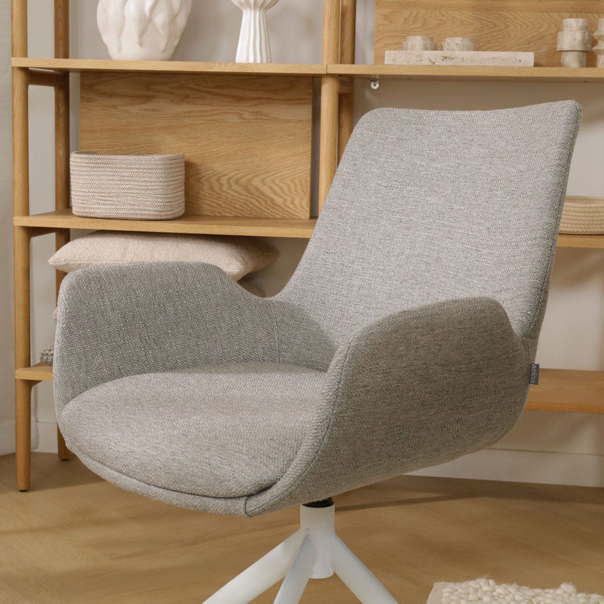 Het stijlvolle ontwerp van deze eetkamerstoel met armleuningen geeft een luxe en chique uitstraling aan elke ruimte. De Nola-Eef eetkamerstoel heeft een draaibaar metalen onderstel, waardoor de zitting 360 garden draaibaar is en je dus flexibel aan tafel zit. De gestoffeerde zitting geeft de eetkamerstoel een warme uitstraling en maakt dat je lekker zacht zit. De kuipzitting is bovendien voorzien van lage armleuningen om nog meer ondersteuning en zitcomfort te bieden, terwijl je de stoel nog steeds gemakkelijk onder de eettafel kan schuiven. Deze draaibare eetkamerstoel is verkrijgbaar met een kuipzitting in luxe stof of in bouclé stof. Bouclé is een populair materiaal dat zowel onderhoudsvriendelijk is als de eetkamerstoel een nog warmere uitstraling geeft. Liever een eetkamerstoel zonder armleuningen in deze stof? Dan is de Nola-Isa eetkamerstoel misschien iets voor jou.