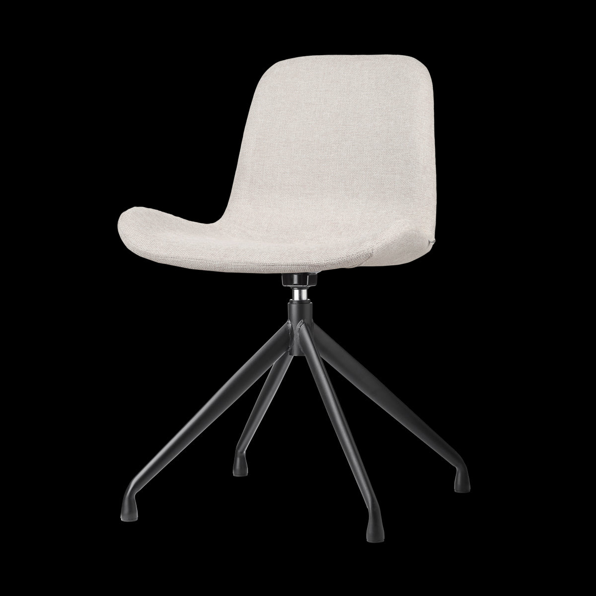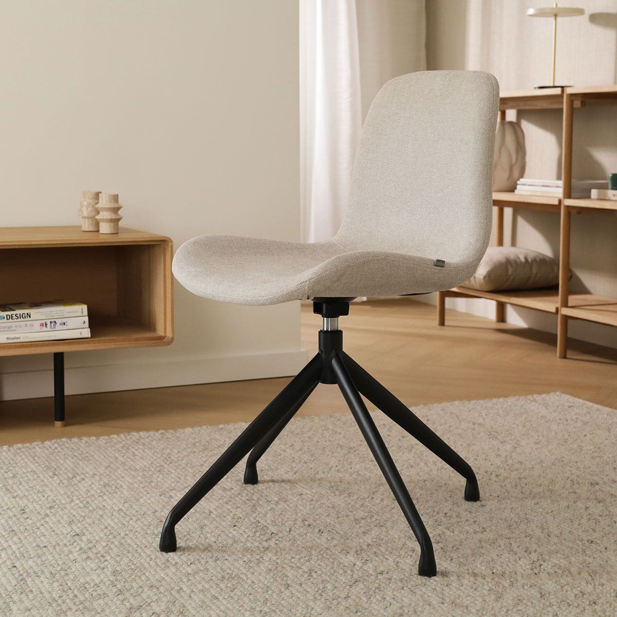 Deze eetkamerstoel heeft een tijdloos design dat naadloos in elke interieurstijl toe te passen is. De eetkamerstoel heeft een praktisch metalen onderstel met draaifunctie. Hierdoor zit je flexibel aan de eettafel en kan je gemakkelijk in en uit stappen. De zitting is volledig bekleed met stof en is ontworpen met een gevleugeld zitvlak. Dit biedt een zacht en comfortabel oppervlak om op te zitten. Dankzij de afwezigheid van armleuningen neemt deze stoel minder ruimte in rond de tafel en past hij bovendien onder iedere eettafel. Kies uit een assortiment van prachtige kleuren en verschillende materialen voor de stoffen bekleding, waaronder teddystof, ribstof en bouclé.