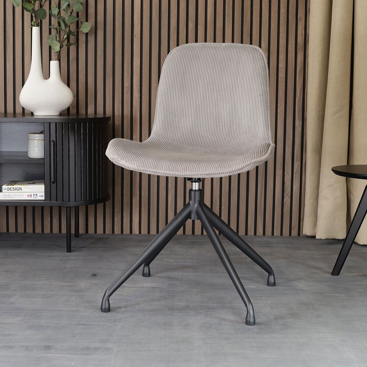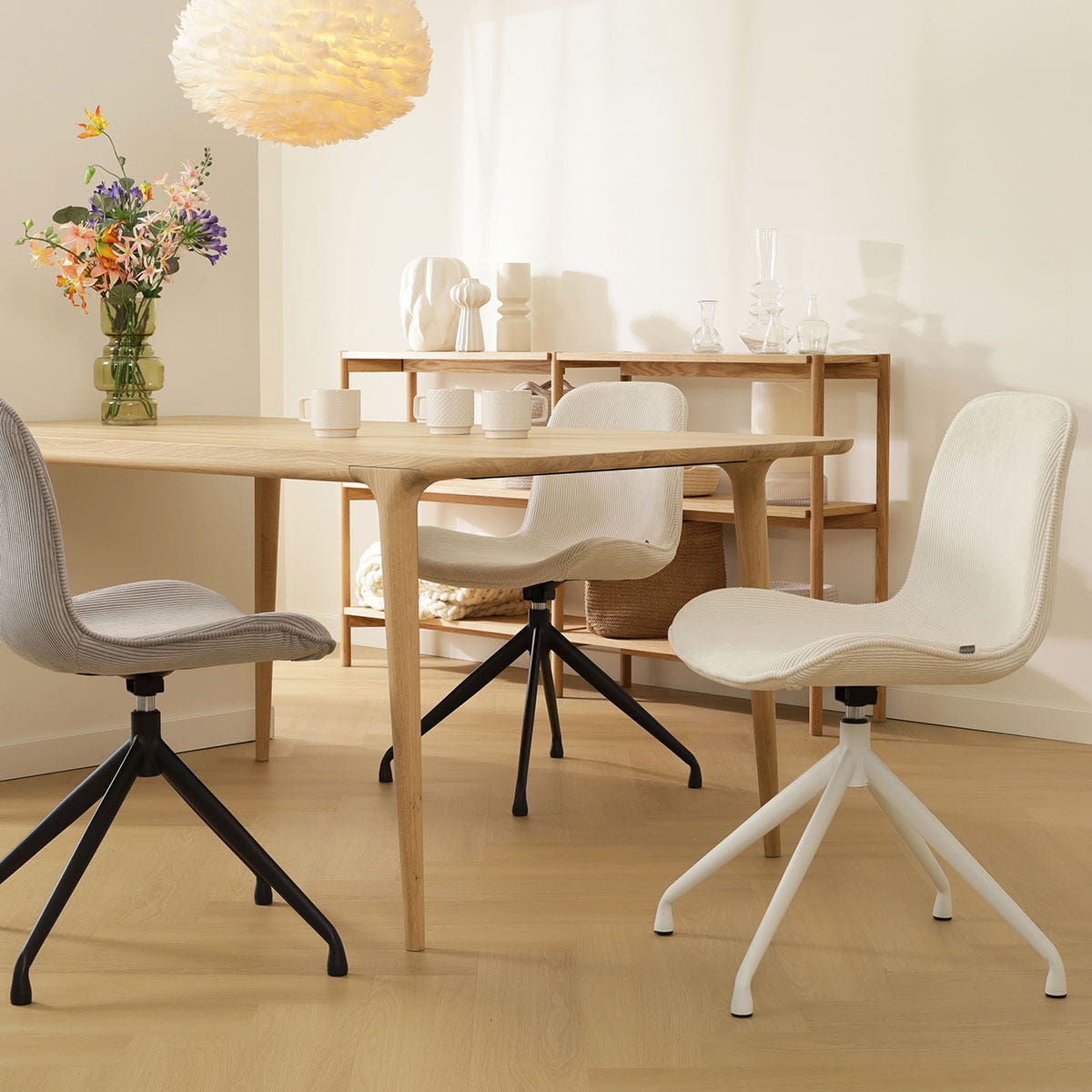 Deze eetkamerstoel heeft een tijdloos design dat naadloos in elke interieurstijl toe te passen is. De eetkamerstoel heeft een praktisch metalen onderstel met draaifunctie. Hierdoor zit je flexibel aan de eettafel en kan je gemakkelijk in en uit stappen. De zitting is volledig bekleed met stof en is ontworpen met een gevleugeld zitvlak. Dit biedt een zacht en comfortabel oppervlak om op te zitten. Dankzij de afwezigheid van armleuningen neemt deze stoel minder ruimte in rond de tafel en past hij bovendien onder iedere eettafel. Kies uit een assortiment van prachtige kleuren en verschillende materialen voor de stoffen bekleding, waaronder teddystof, ribstof en bouclé.