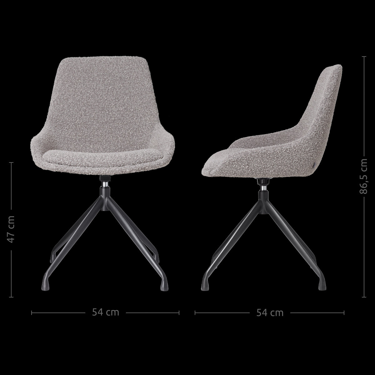 De eetkamerstoel heeft een comfortabele zitting met een sterk houten binnenwerk, waardoor je rug veel ondersteuning krijgt en je gemakkelijk een actieve zithouding aanneemt. Het gevoerde zitvlak zorgt voor veel comfort, evenals de zachte stoffen bekleding. Het metalen onderstel heeft een draaimechanisme, waardoor de zitting 360 graden op het onderstel kan draaien. Dit maakt van de Nola-Isa een uiterst functionele en flexibele stoel aan de eettafel. Maak een keuze uit de verschillende kleuren en materialen zitting, waaronder het trendy en onderhoudsvriendelijke bouclé stof, aan de hand van jouw persoonlijke smaak. De combinatie van het strakke ontwerp en de warme kleuropties van de bekleding geeft deze stoel een tijdloze, elegante uitstraling die bij elke inrichting past.