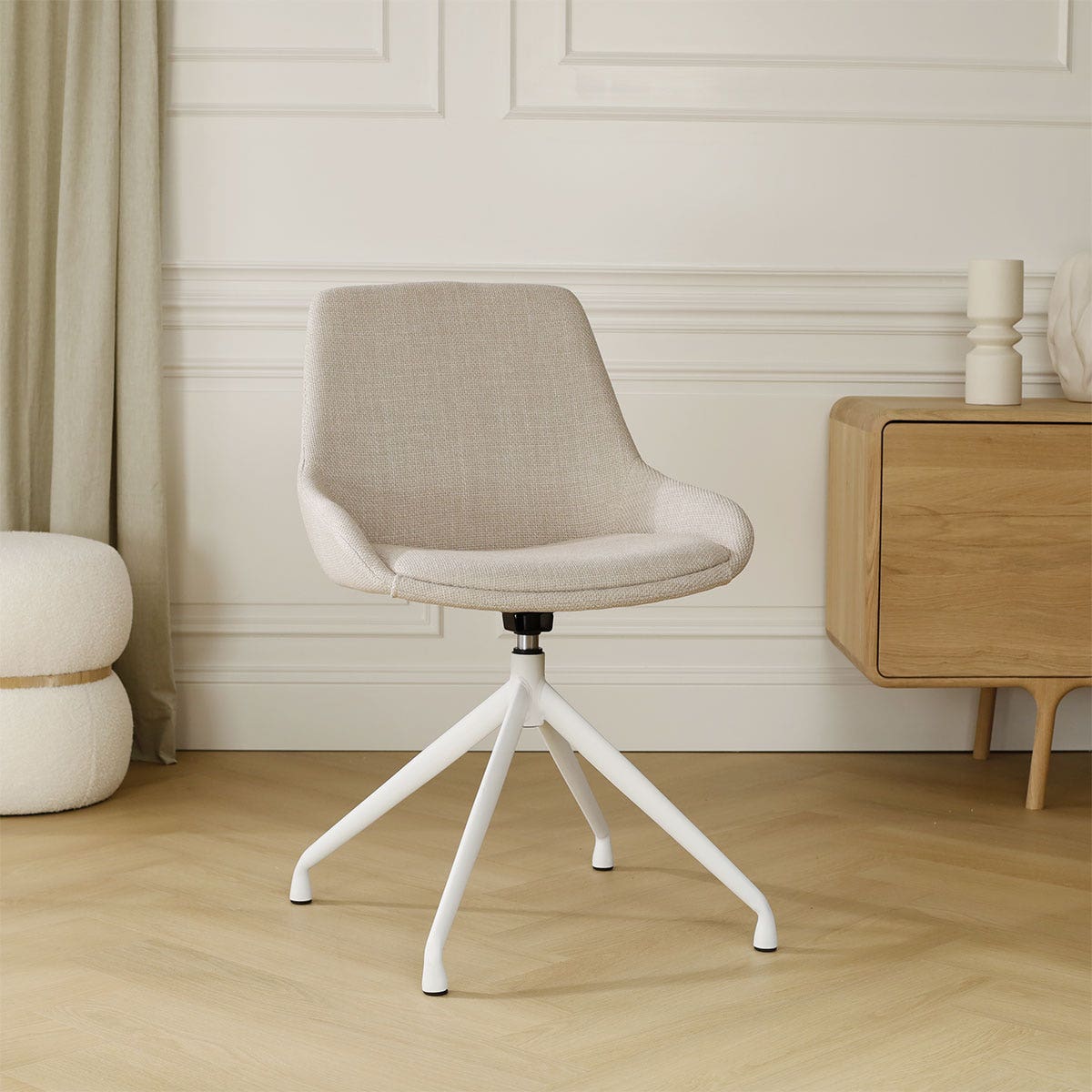 Deze stoel combineert Scandinavisch design met functionaliteit en comfort. De zitting is bekleed met een beige gemêleerde stof die niet alleen een neutrale kleur biedt, maar ook een aangename textuur voor dagelijks gebruik. Het stevige houten binnenwerk van de zitting zorgt voor optimale ondersteuning van je rug, wat bijdraagt aan een actieve zithouding. Dankzij het draaibare metalen onderstel met witte poten kan de stoel 360 graden draaien, wat de flexibiliteit aan de eettafel vergroot. De stoel heeft een zithoogte van 47 cm en een zitdiepte van 40 cm, waardoor hij comfortabel en ruimtelijk is, zelfs zonder armleuningen. De Nola-Isa stoel is zeer eenvoudig in elkaar te zetten en kan ook als bureaustoel gebruikt worden. Het tijdloze ontwerp maakt het een veelzijdige keuze voor verschillende interieurstijlen, terwijl het functionele design zorgt voor een praktische oplossing in je eetkamer.
