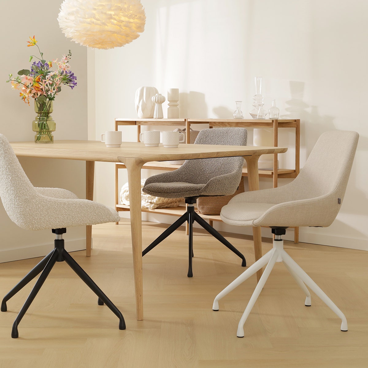 De Nola-Isa draaibare eetkamerstoel beige - wit onderstel is onderdeel van een mix en match collectie. Dit betekent dat zowel het onderstel als de zitting van deze stoel in diverse andere combinaties verkrijgbaar zijn. Zo is de stoel met een wit onderstel en een zwart onderstel verkrijgbaar in de kleuren bouclé beige, bouclé taupe, beige, warm grijs, bruin, beige gemêleerd en in het groen. Hierdoor kun je de perfecte combinatie kiezen die past bij jouw interieur en persoonlijke stijl.