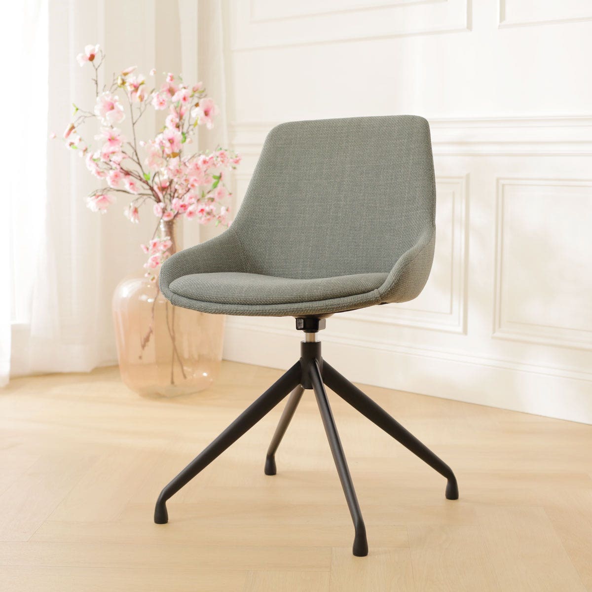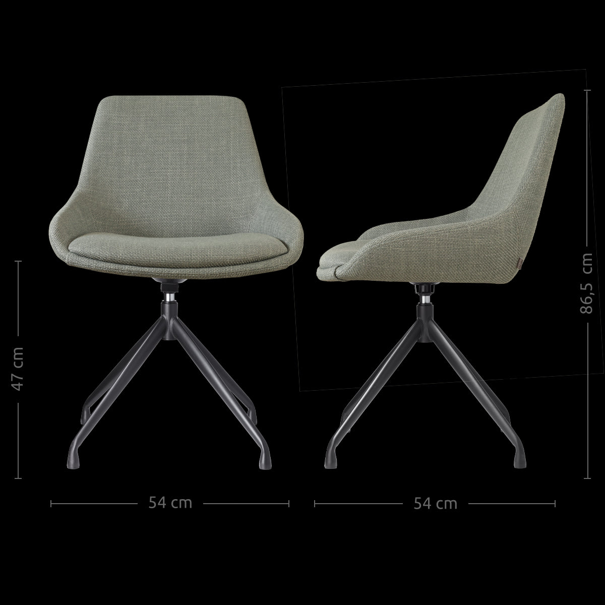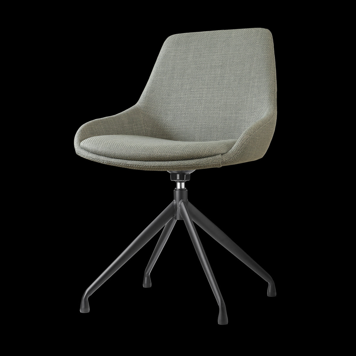 De Nola-Isa draaibare eetkamerstoel in saliegroen met een zwart onderstel van het merk Nolon biedt een stijlvolle en praktische zitoplossing voor elk interieur.