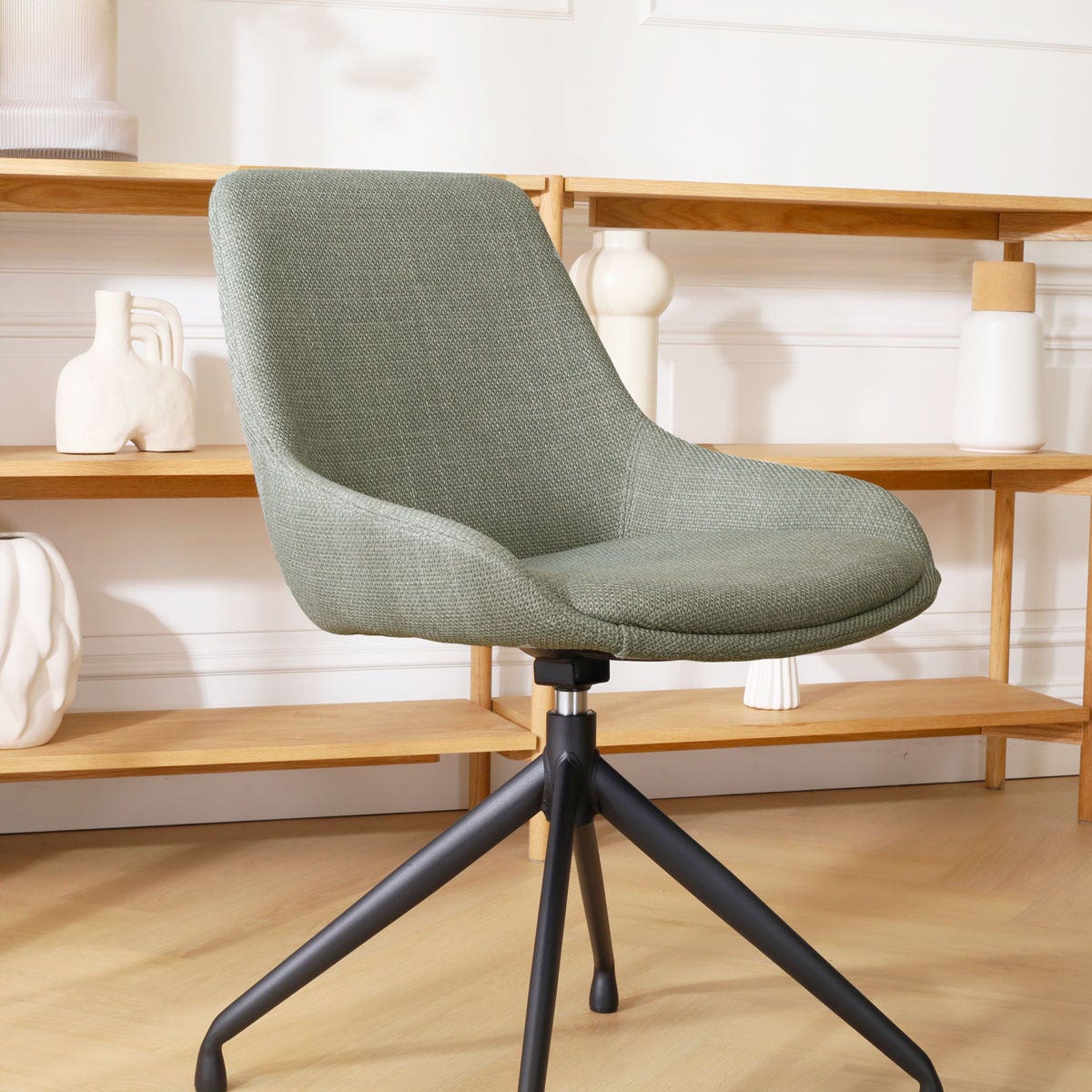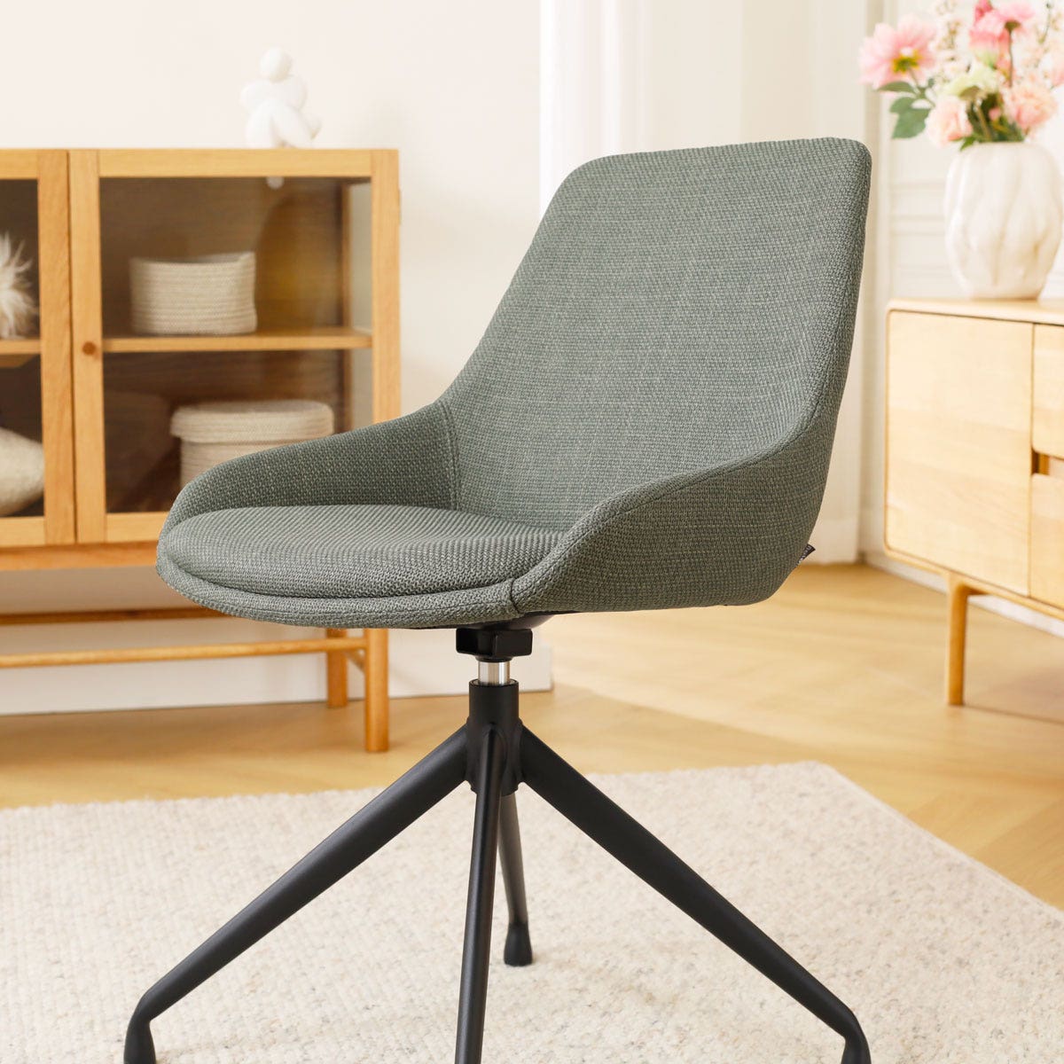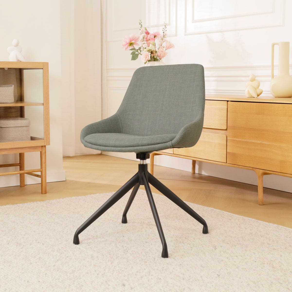 De Nola-Isa draaibare eetkamerstoel in saliegroen met een zwart onderstel van het merk Nolon biedt een stijlvolle en praktische zitoplossing voor elk interieur.