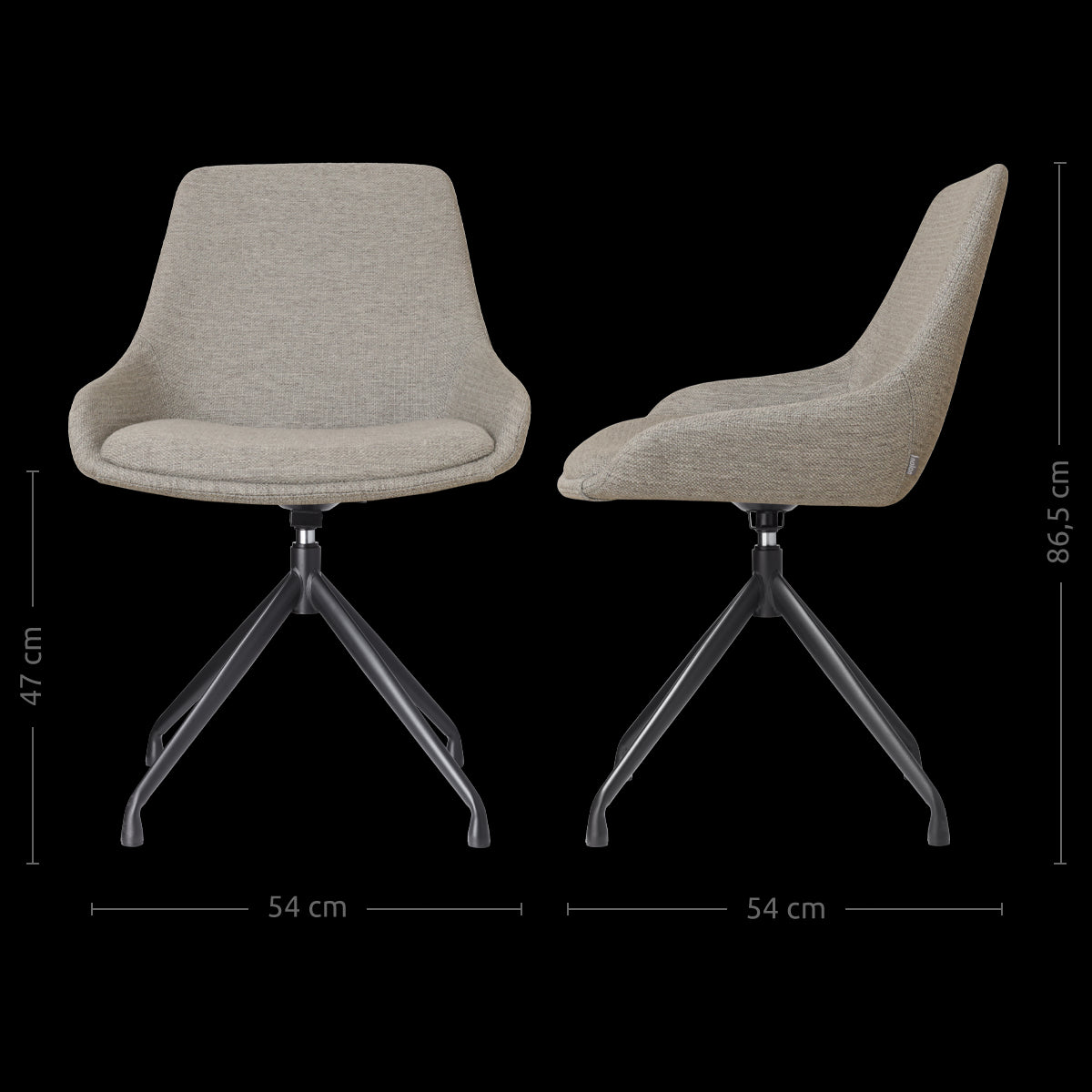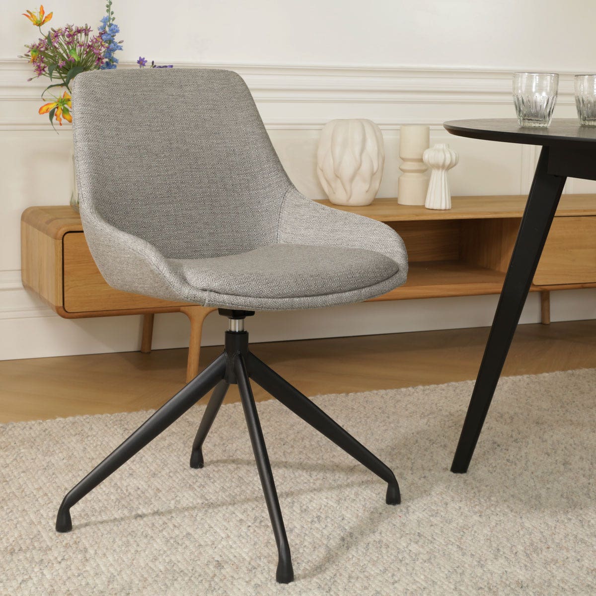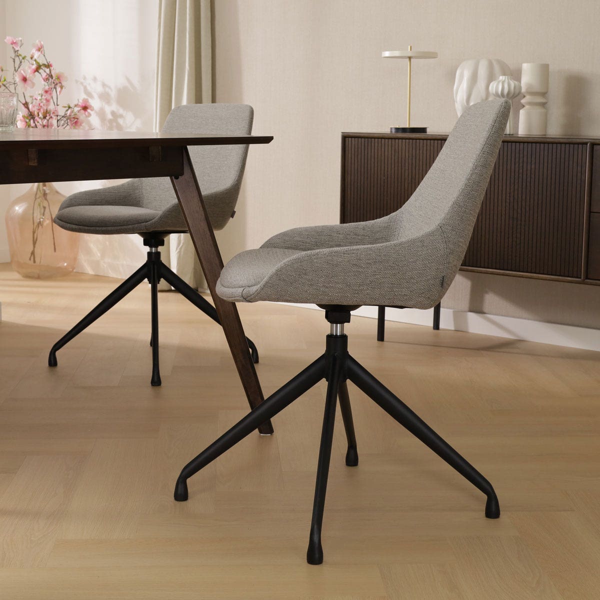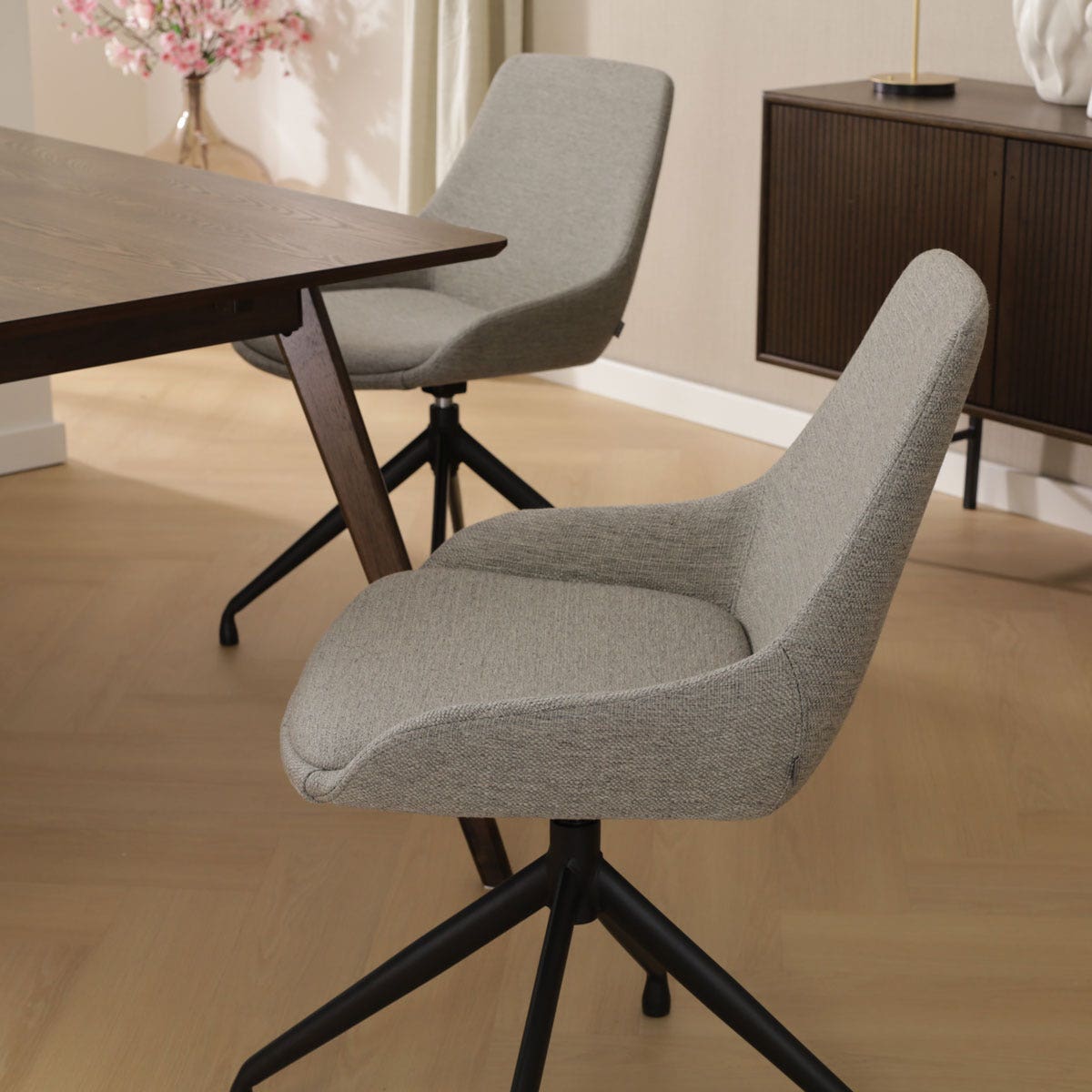 De Nola-Isa draaibare eetkamerstoel in warm grijs is een stijlvolle en functionele toevoeging aan elke eetkamer.
