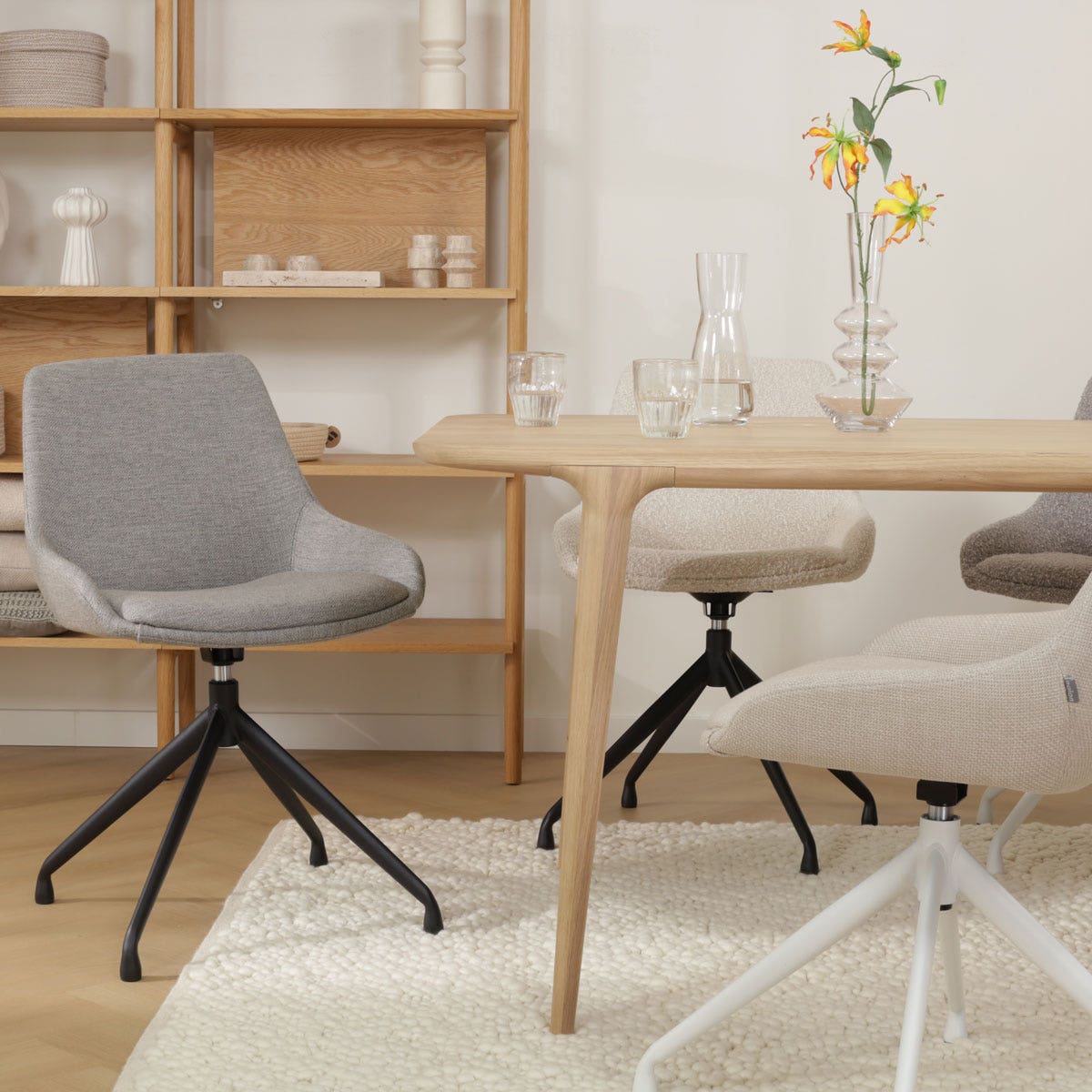 De Nola-Isa draaibare eetkamerstoel warm grijs - zwart onderstel is onderdeel van een mix en match collectie. Dit betekent dat zowel het onderstel als de zitting van deze stoel in diverse andere combinaties verkrijgbaar zijn. Zo is de stoel met een wit onderstel en een zwart onderstel verkrijgbaar in de kleuren bouclé taupe, beige, warm grijs, bruin, beige gemêleerd en in het groen. Deze variatie in kleuren en onderstellen zorgt ervoor dat je de perfecte combinatie kunt vinden die bij jouw interieur past. Of je nu gaat voor een subtiele uitstraling met neutrale tinten of een meer opvallende kleur, de Nola-Isa collectie biedt volop mogelijkheden.