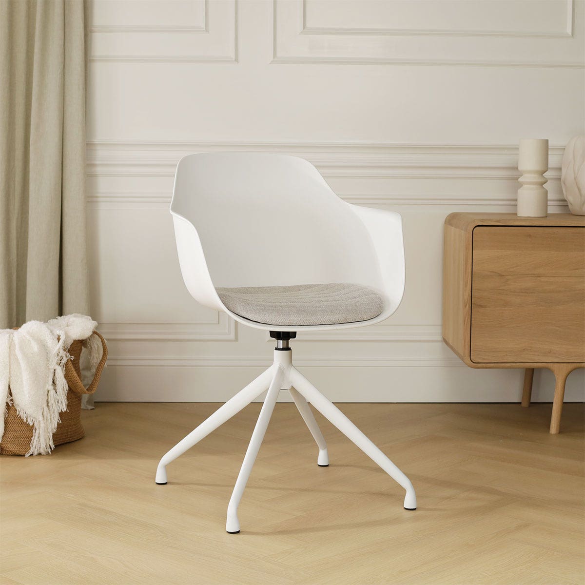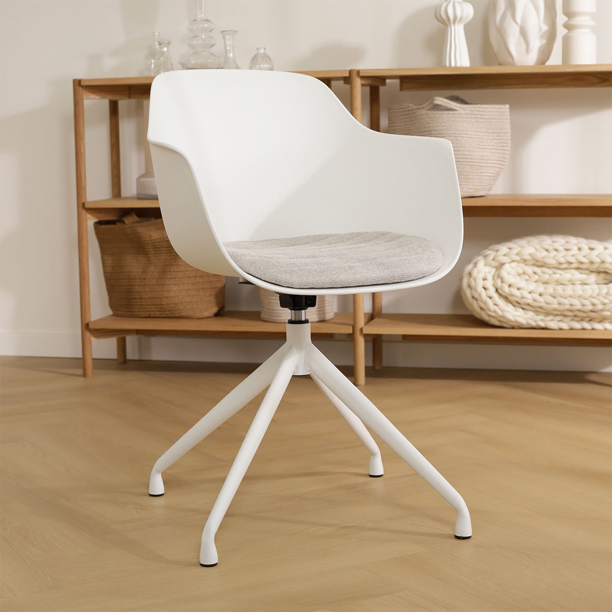 De Nola draaibare eetkamerstoel met een kunststof zitting met armleuningen is een mooie elegante stoel die als blikvanger dient rondom je eettafel.
