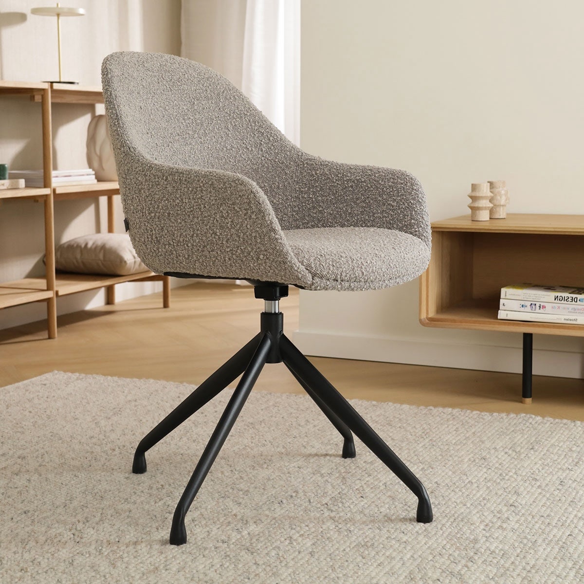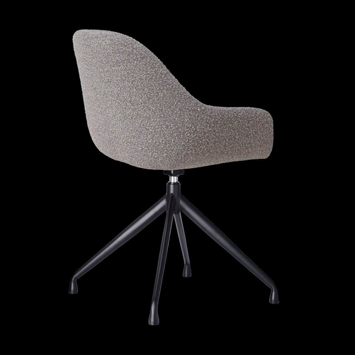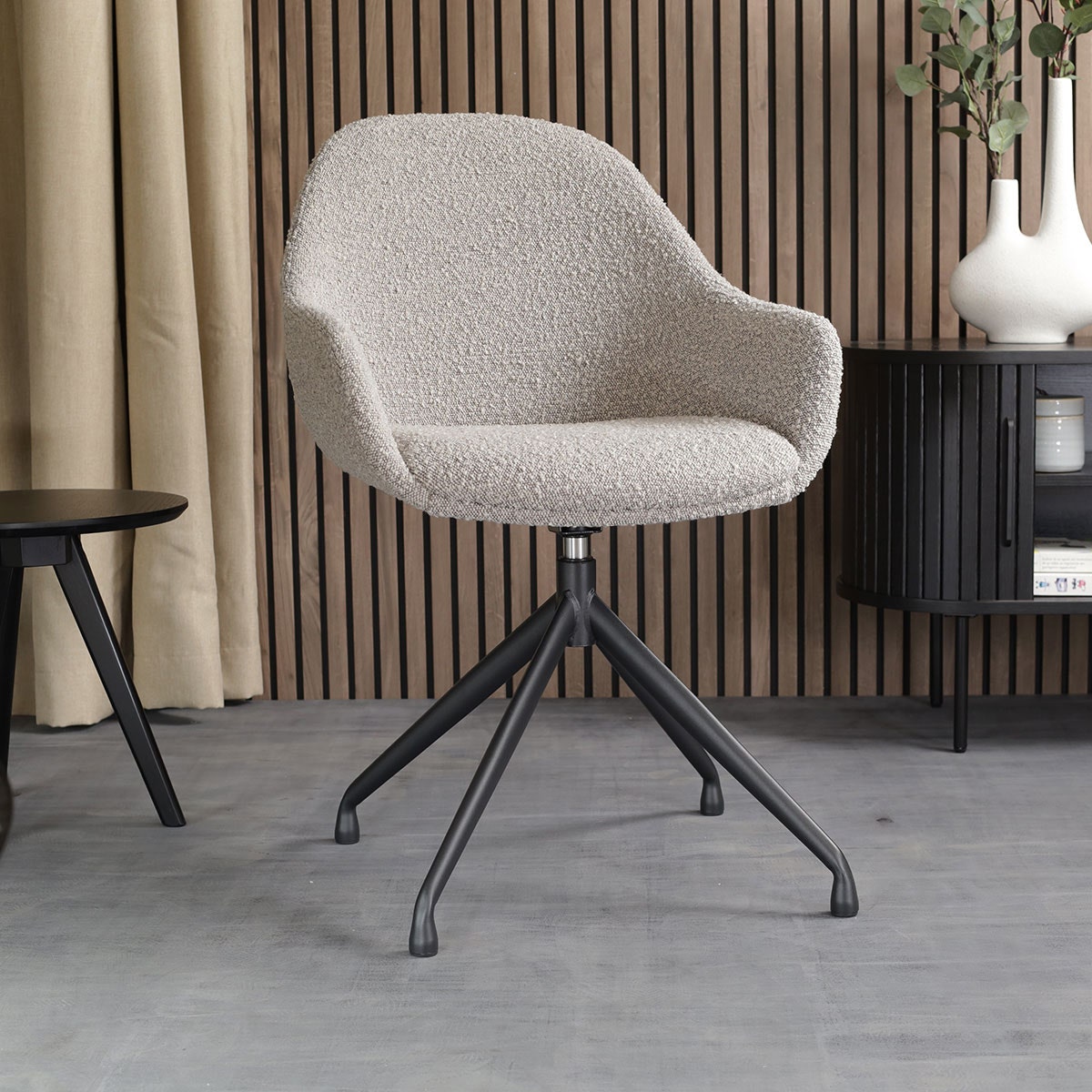 Taupe bouclé eetkamerstoel - draaibaar modern design met zwarte poten.