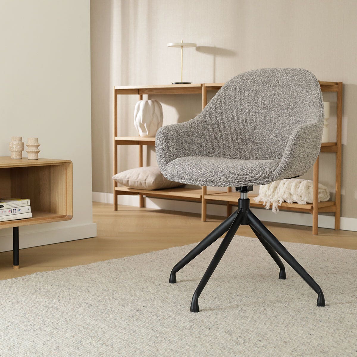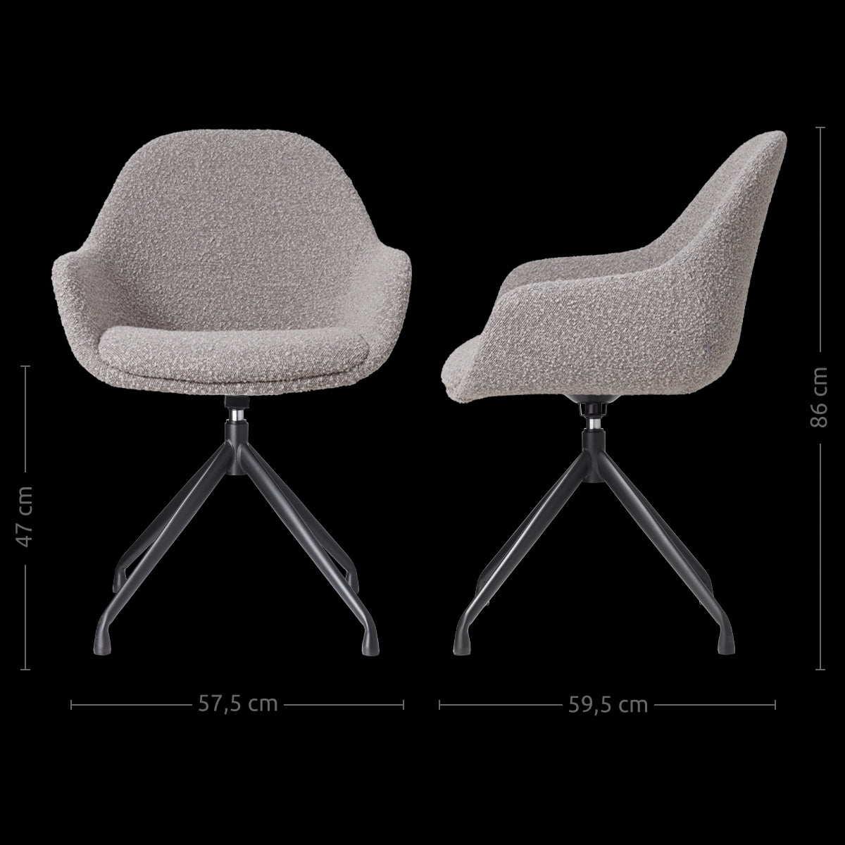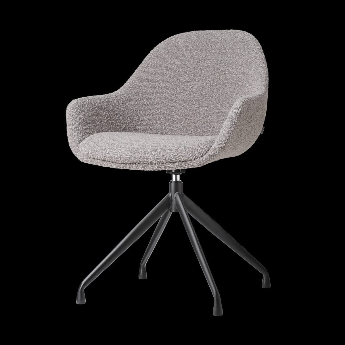 Taupe bouclé eetkamerstoel - draaibaar modern design met zwarte poten.