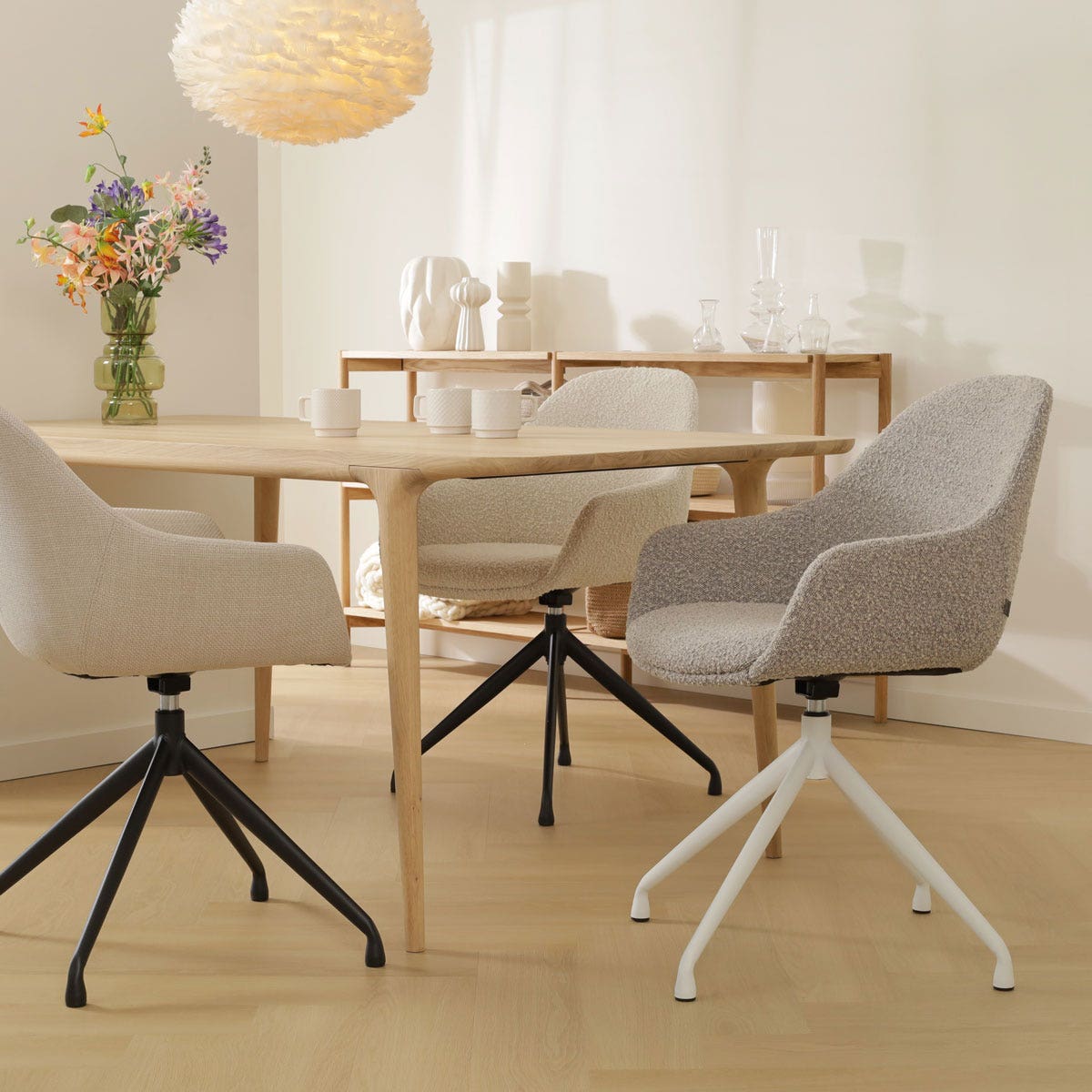 De Nola-Mae draaibare eetkamerstoel van Nolon is onderdeel van een mix en match collectie. Dit betekent dat zowel het onderstel als de zitting van deze stoel in diverse andere combinaties verkrijgbaar zijn. Zo kan je de Mae zitting ook combineren met een draaibaar onderstel in het wit, een houten onderstel in naturel of walnoot kleur, of een ander metalen onderstel. Het draaibare Nola onderstel kan ook juist weer gecombineerd worden met alle andere zittingen van Nolon.