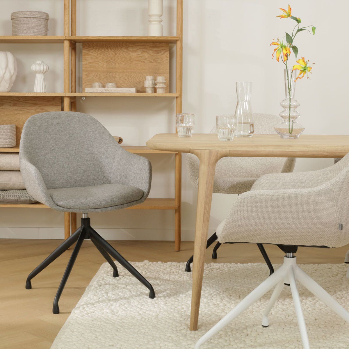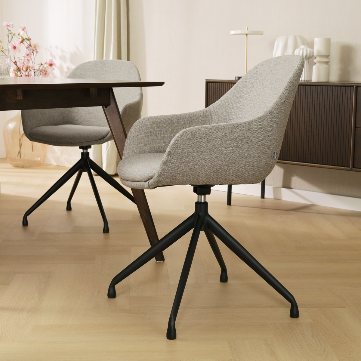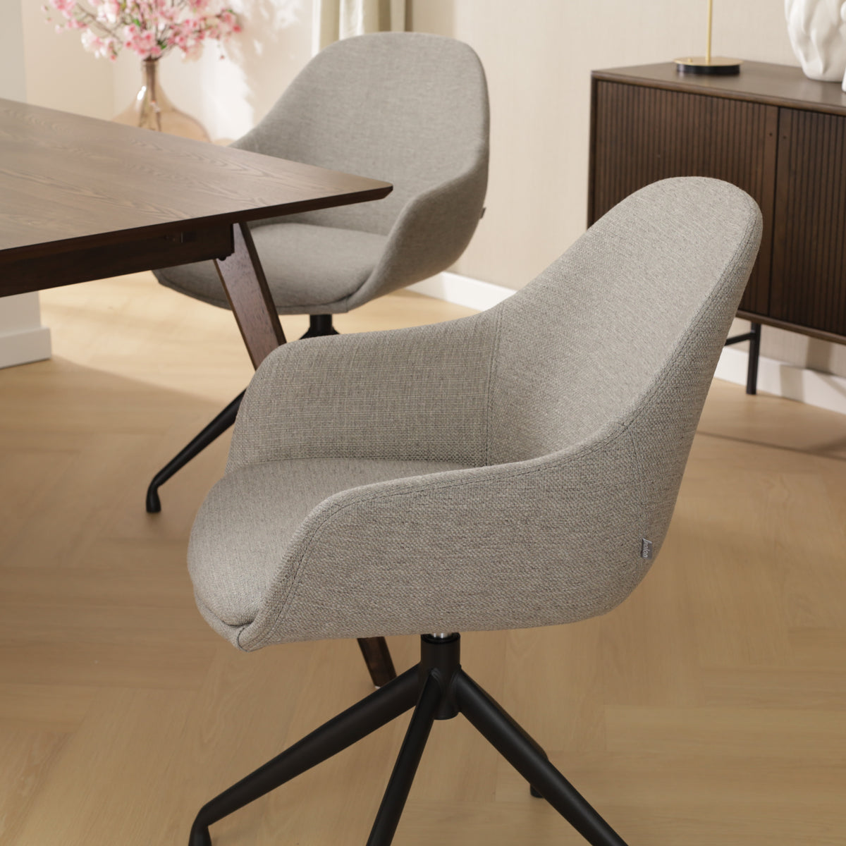 Stijlvol en praktisch: de Nola-Mae draaibare eetkamerstoel in warm grijs.