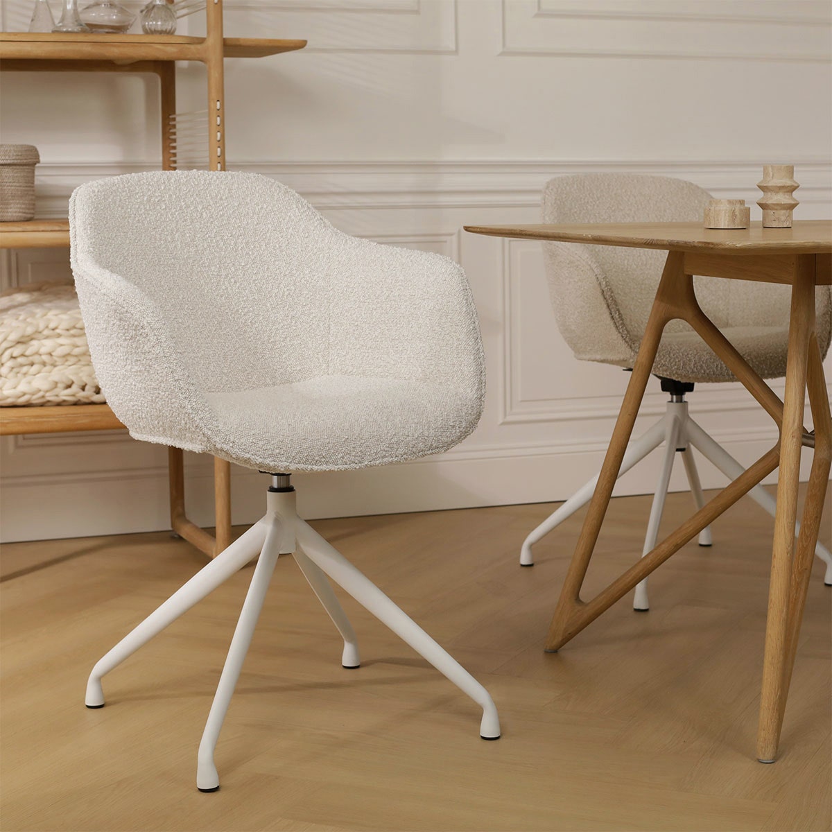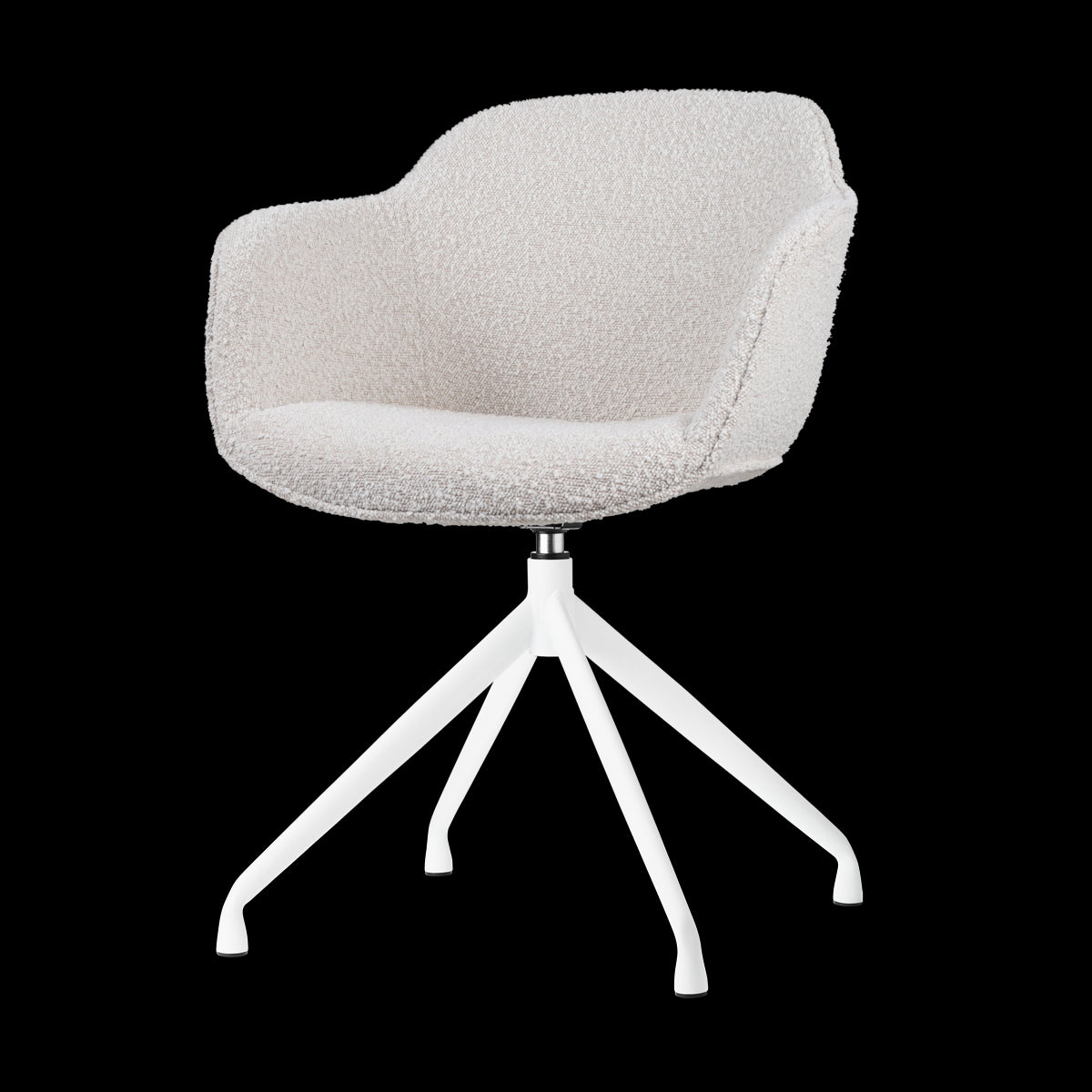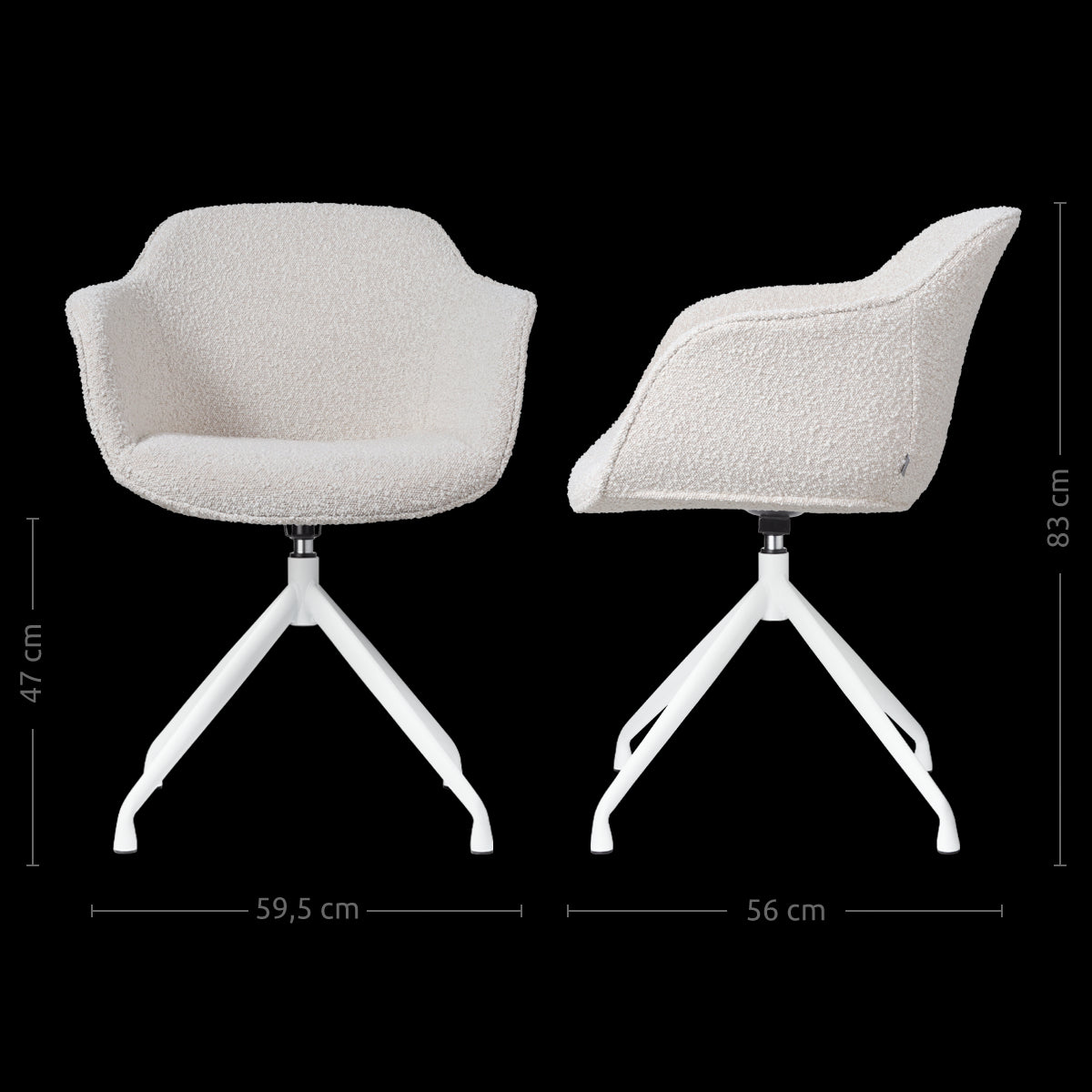 Dankzij het chique en sfeervolle design van deze stoel creëer je in een handomdraai een stijlvolle eetruimte. De eetkamerstoel heeft een kuipzitting met armleuningen om ultiem comfort te bieden tijdens de maaltijd. De bouclé bekleding zorgt voor een zachte zitervaring en is bovendien gemakkelijk te onderhouden en slijtvast, wat ideaal is in de eethoek. De zachte lijnen en subtiele rondingen van de zitting dragen bij aan het warme en uitnodigende karakter van de stoel. Deze prachtige zitting wordt gecombineerd met een strak metalen onderstel dat volledig draaibaar is. Hierdoor is deze stoel veelzijdig en handig in gebruik, aangezien je de stoel niet van tafel hoeft te schuiven om te kunnen gaan zitten.