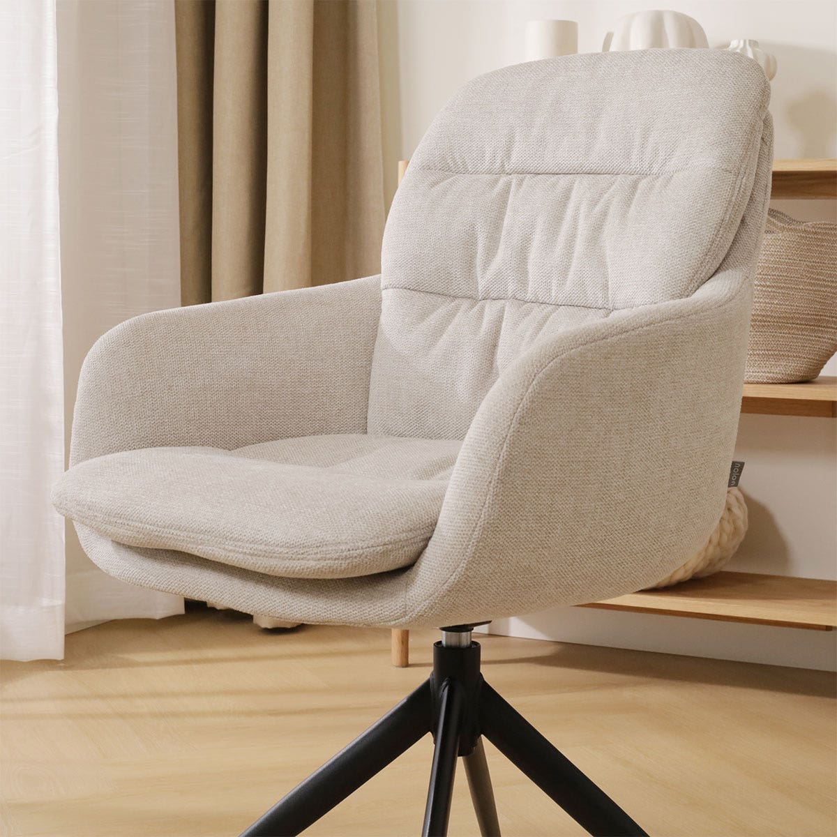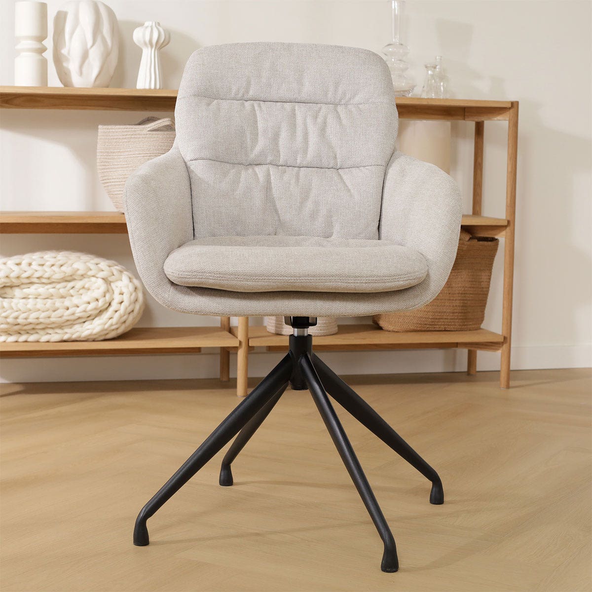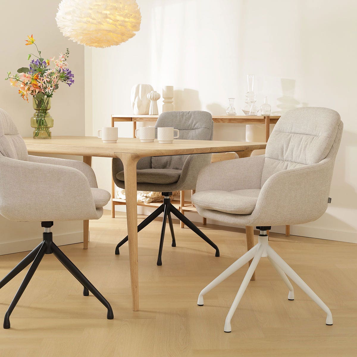 De eetkamerstoel heeft een metalen frame met een draaibare poot. Het onderstel van deze draaibare eetkamerstoel heeft geen terugdraaifunctie, waardoor de zitting 360 graden op het onderstel kan draaien. Dit biedt veel flexibiliteit aan tafel en zorgt ervoor dat je de stoel niet helemaal naar achteren hoeft te schuiven. De comfortabele zitting is volledig bekleed met zachte stof en is verkrijgbaar in beige en grijs. De hoge rugleuning zorgt voor veel ondersteuning, net als het vaste zitkussen en de armleuningen. Urenlang natafelen is met de Nola-Mia eetkamerstoel dus geen probleem.
