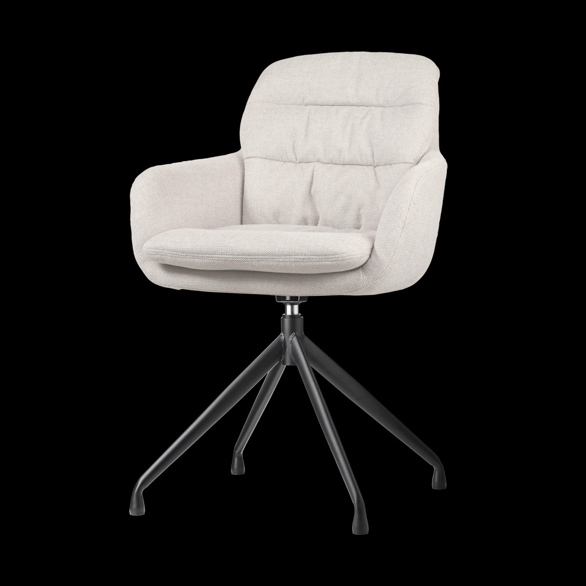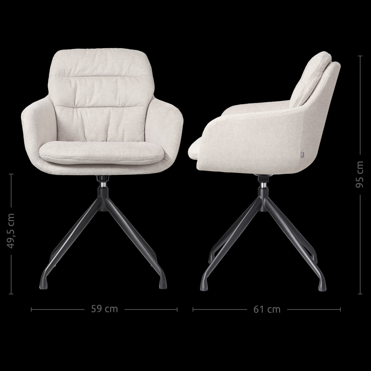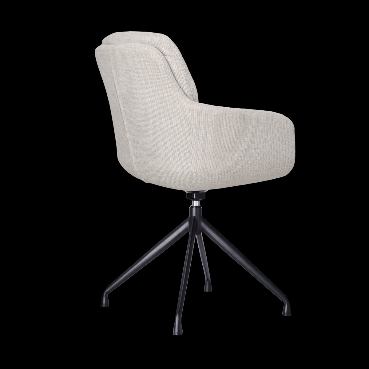 De eetkamerstoel heeft een metalen frame met een draaibare poot. Het onderstel van deze draaibare eetkamerstoel heeft geen terugdraaifunctie, waardoor de zitting 360 graden op het onderstel kan draaien. Dit biedt veel flexibiliteit aan tafel en zorgt ervoor dat je de stoel niet helemaal naar achteren hoeft te schuiven. De comfortabele zitting is volledig bekleed met zachte stof en is verkrijgbaar in beige en grijs. De hoge rugleuning zorgt voor veel ondersteuning, net als het vaste zitkussen en de armleuningen. Urenlang natafelen is met de Nola-Mia eetkamerstoel dus geen probleem.