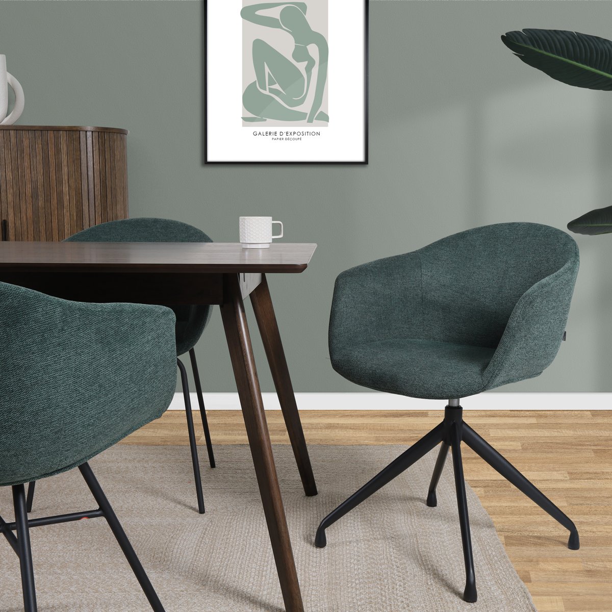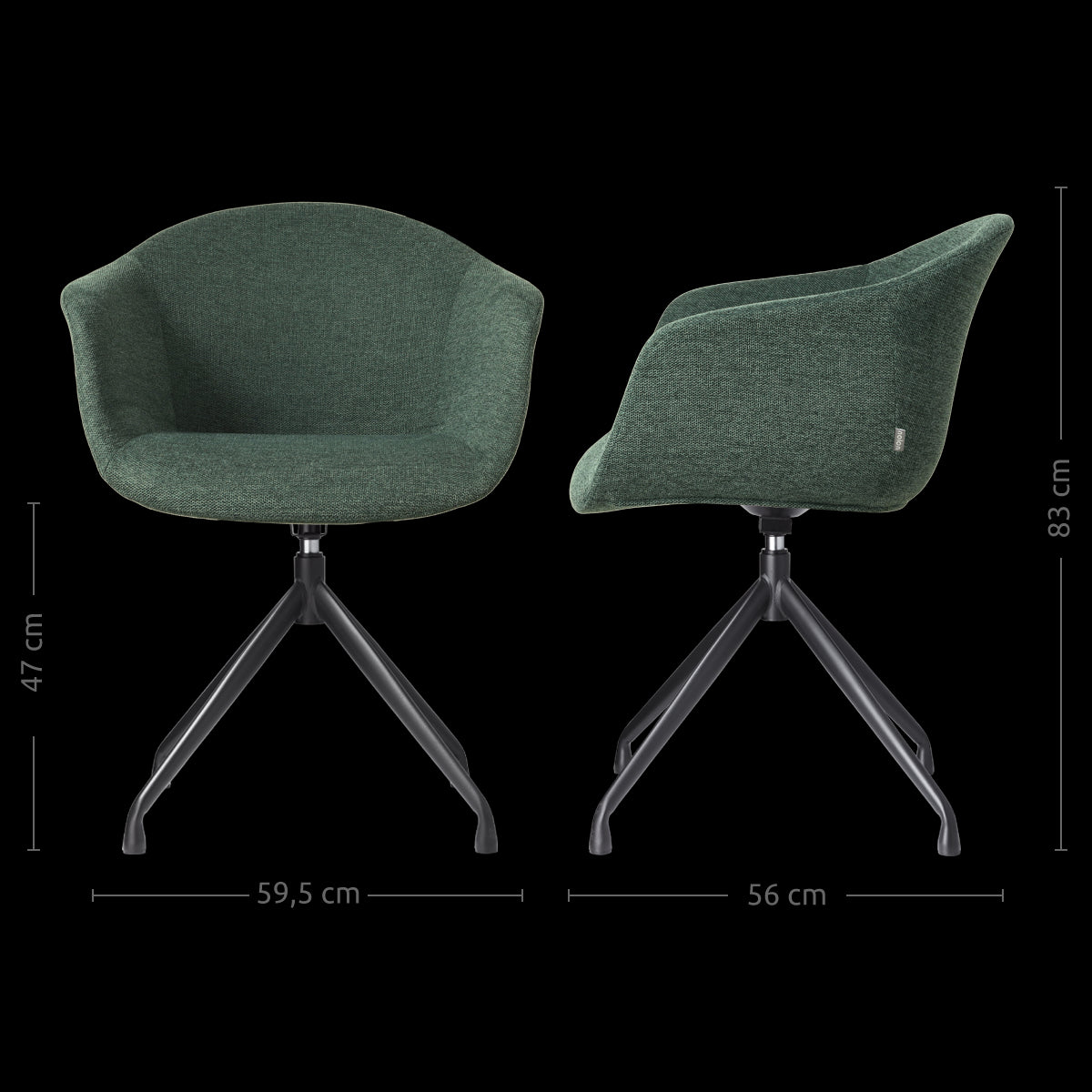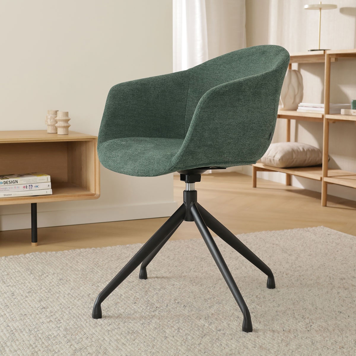 De stoel is ontworpen met armleuningen voor extra zitcomfort en de stoffen bekleding zorgt ervoor dat je lekker zacht zit. Met zes verschillende kleuren bekleding is er voor iedere woonstijl een geschikt exemplaar te vinden. Het moderne metalen onderstel staat op vier slanke poten en heeft een draaifunctie, zodat je gemakkelijk op en af kan stappen. De schuin aflopende armleuningen bieden volop ondersteuning en zorgen er in combinatie met de passieve zithouding voor dat je ontspannen aan tafel zit. Deze draaibare eetkamerstoel van Nolon is dus niet alleen erg leuk om te zien, maar zit ook nog eens heel erg comfortabel.