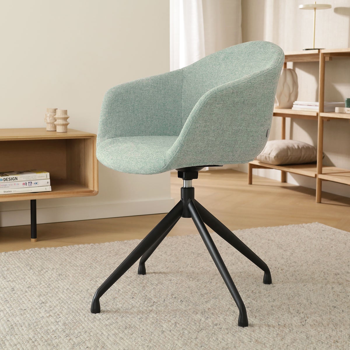 De stoel is ontworpen met armleuningen voor extra zitcomfort en de stoffen bekleding zorgt ervoor dat je lekker zacht zit. Met zes verschillende kleuren bekleding is er voor iedere woonstijl een geschikt exemplaar te vinden. Het moderne metalen onderstel staat op vier slanke poten en heeft een draaifunctie, zodat je gemakkelijk op en af kan stappen. De schuin aflopende armleuningen bieden volop ondersteuning en zorgen er in combinatie met de passieve zithouding voor dat je ontspannen aan tafel zit. Deze draaibare eetkamerstoel van Nolon is dus niet alleen erg leuk om te zien, maar zit ook nog eens heel erg comfortabel.