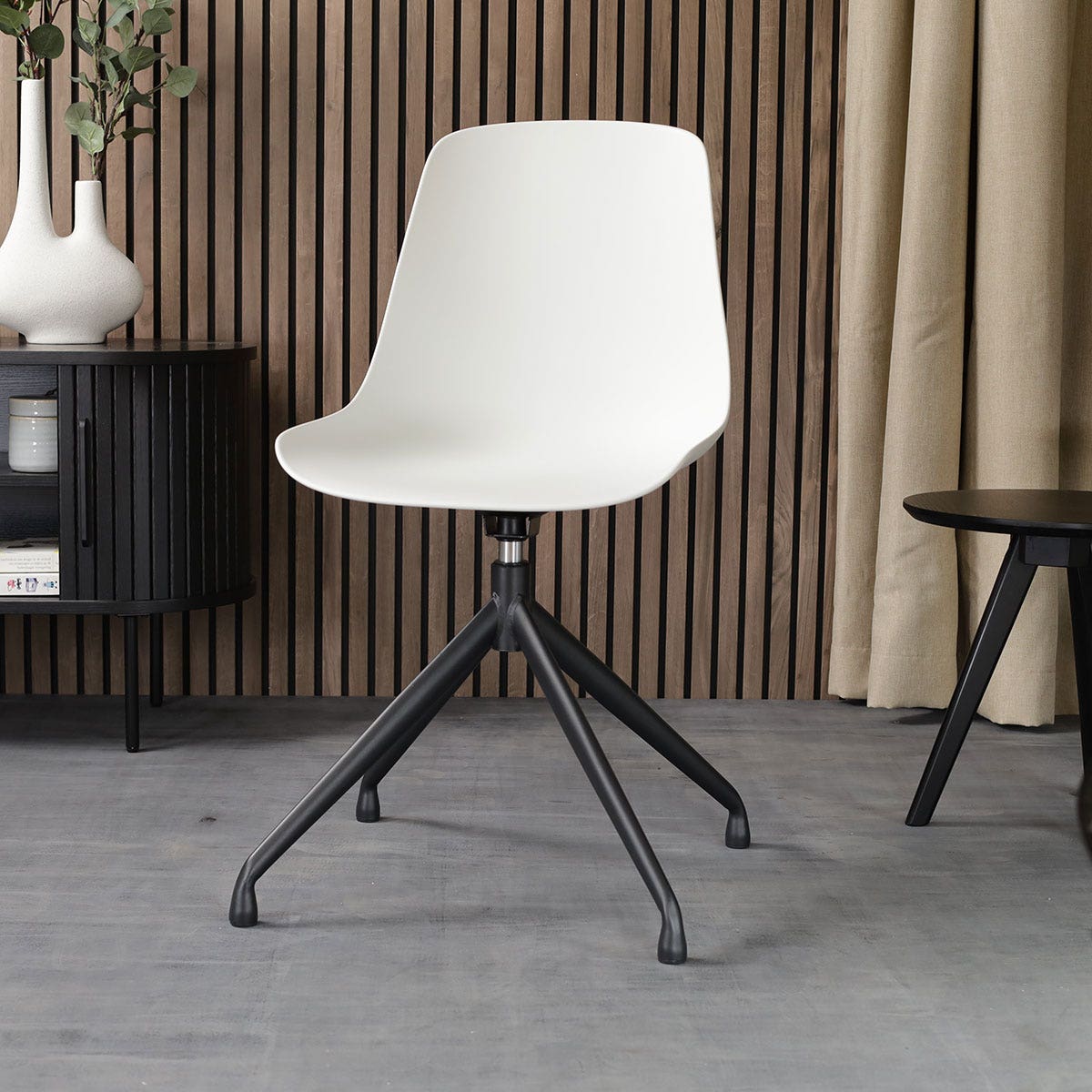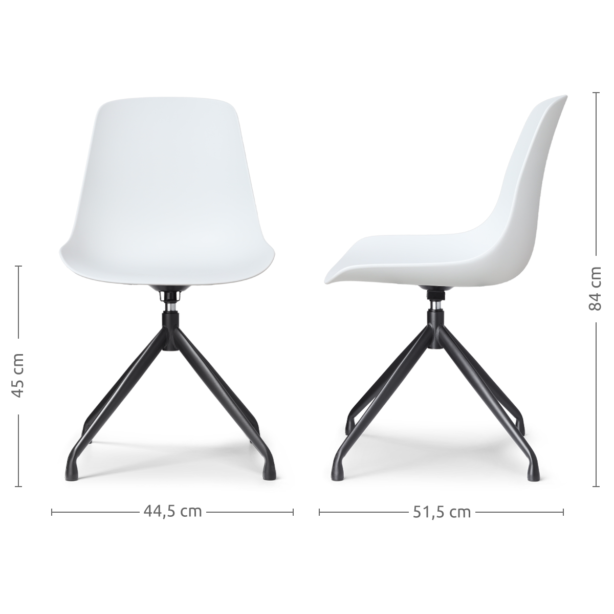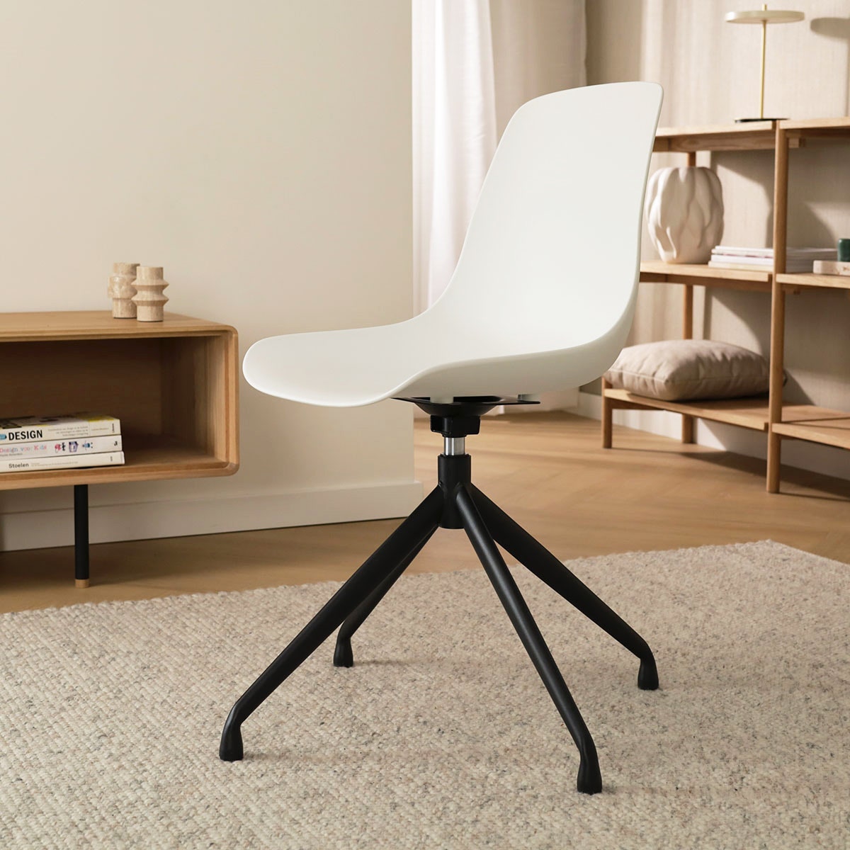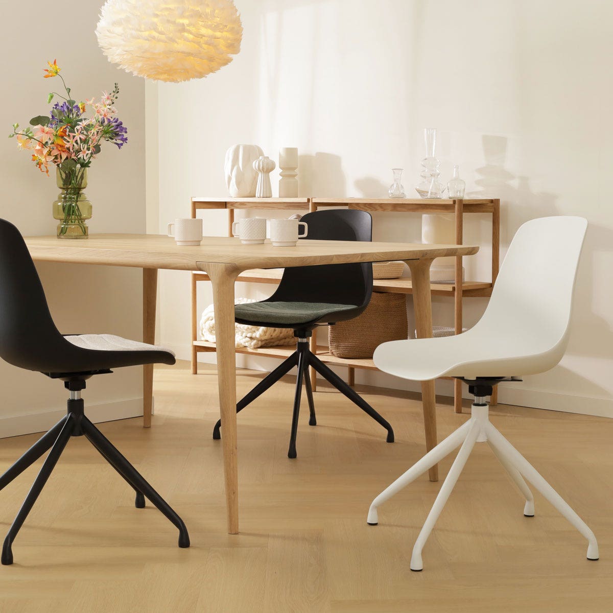 Deze eetkamerstoel combineert namelijk een praktische kunststof zitting met een tijdloos metalen onderstel. Het onderstel staat op vier ranke poten en is bovendien draaibaar. Dankzij de afwezigheid van een terugdraaifunctie kan de zitting 360 graden op het onderstel draaien. Dit zorgt voor veel bewegingsvrijheid aan tafel en voorkomt dat je de stoel helemaal naar achteren hoeft te schuiven. Dit maakt van deze draaibare eetkamerstoel de perfecte keuze voor in een kleine ruimte. De zitting is gemaakt van door en door gekleurd kunststof, wat betekent dat krassen en beschadigingen niet opvallen. Dankzij de ergonomische vorm zit je comfortabel aan het diner, maar met het Fem zitkussen van Nolon kan je het zitcomfort nog meer verhogen.