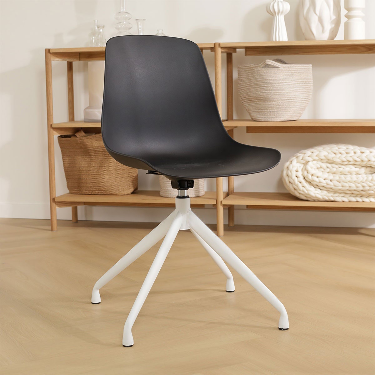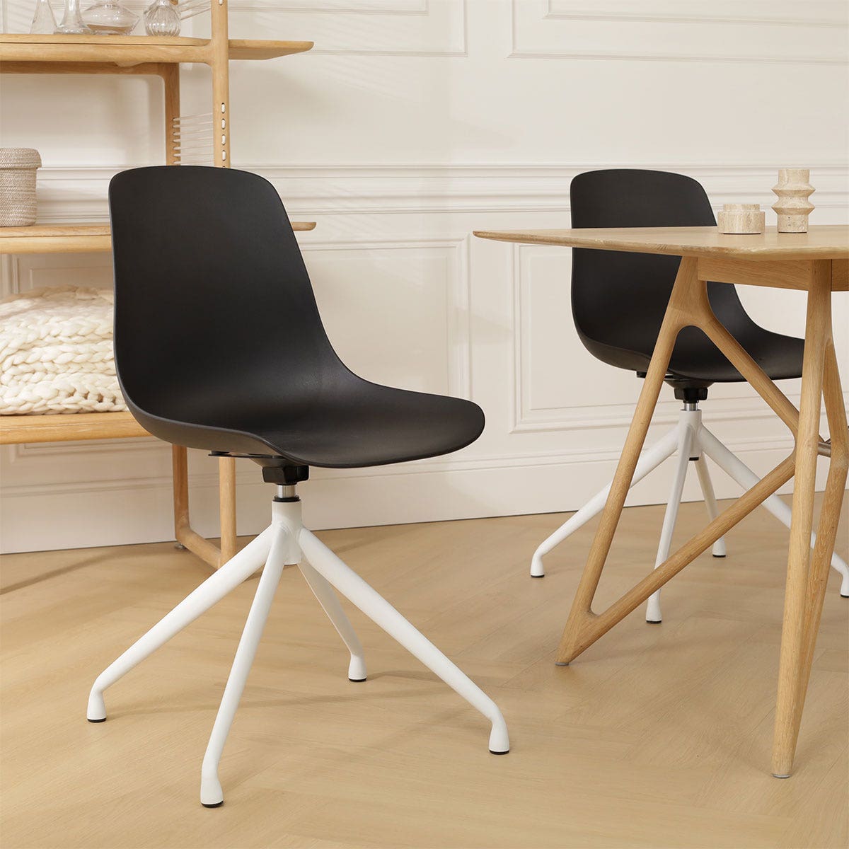 Deze eetkamerstoel combineert namelijk een praktische kunststof zitting met een tijdloos metalen onderstel. Het onderstel staat op vier ranke poten en is bovendien draaibaar. Dankzij de afwezigheid van een terugdraaimechanisme kan de zitting 360 graden op het onderstel draaien. Dit zorgt voor veel bewegingsvrijheid aan tafel en voorkomt dat je de stoel helemaal naar achteren hoeft te schuiven. Dit maakt van deze draaibare eetkamerstoel de perfecte keuze voor in een kleine ruimte. De zitting is gemaakt van door en door gekleurd kunststof, wat betekent dat krassen en beschadigingen niet opvallen. Dankzij de ergonomische vorm zit je comfortabel aan het diner, maar met het Fem zitkussen van Nolon kan je het zitcomfort nog meer verhogen.