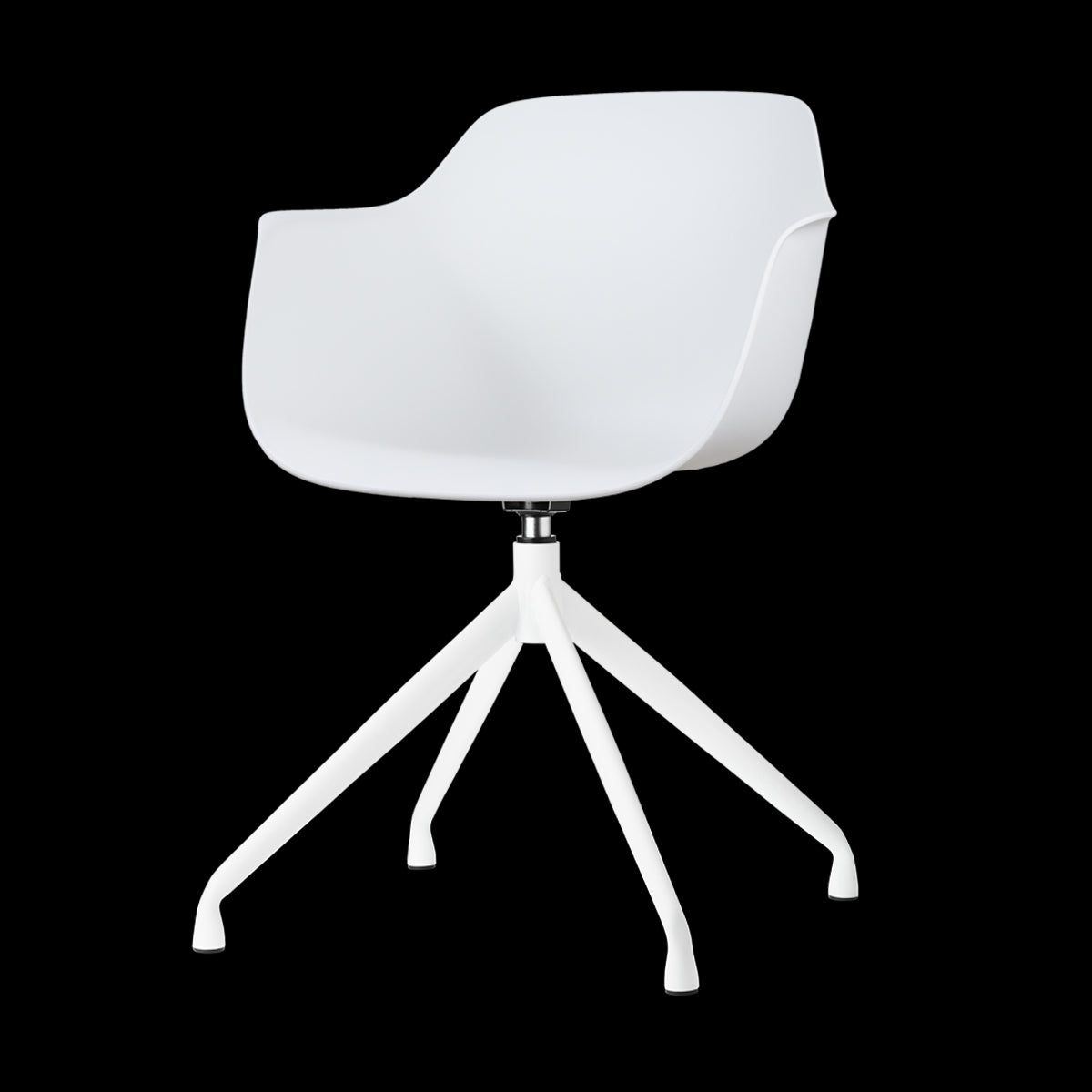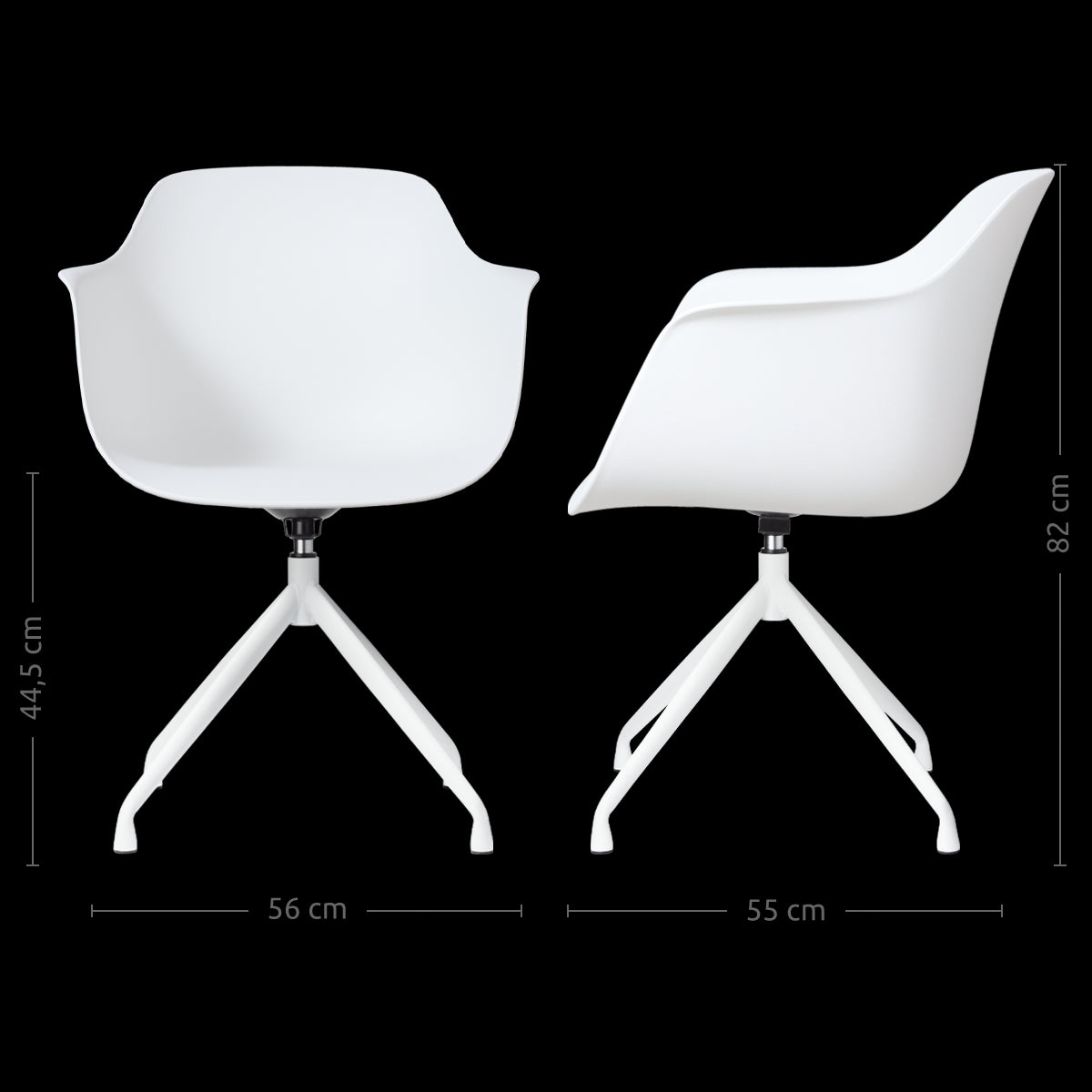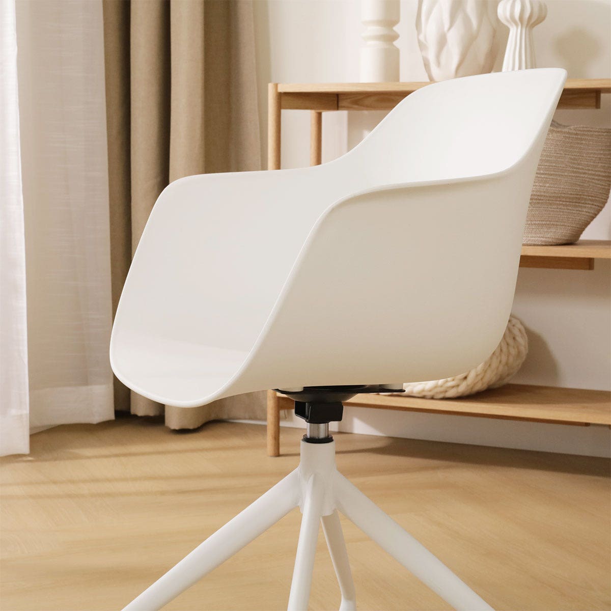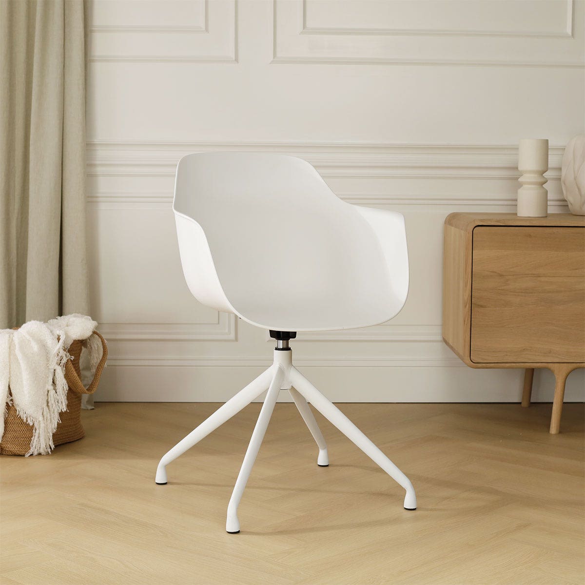 De Nola-Puk draaibare eetkamerstoel in wit, met een elegant wit onderstel, biedt een verfrissende Scandinavische stijl voor je eetkamer.