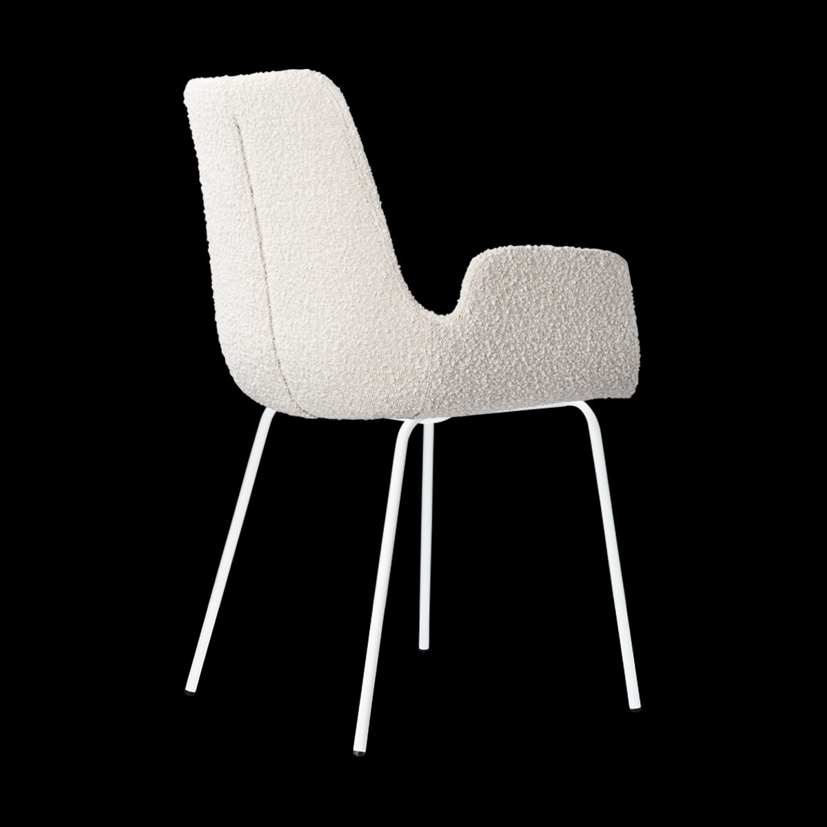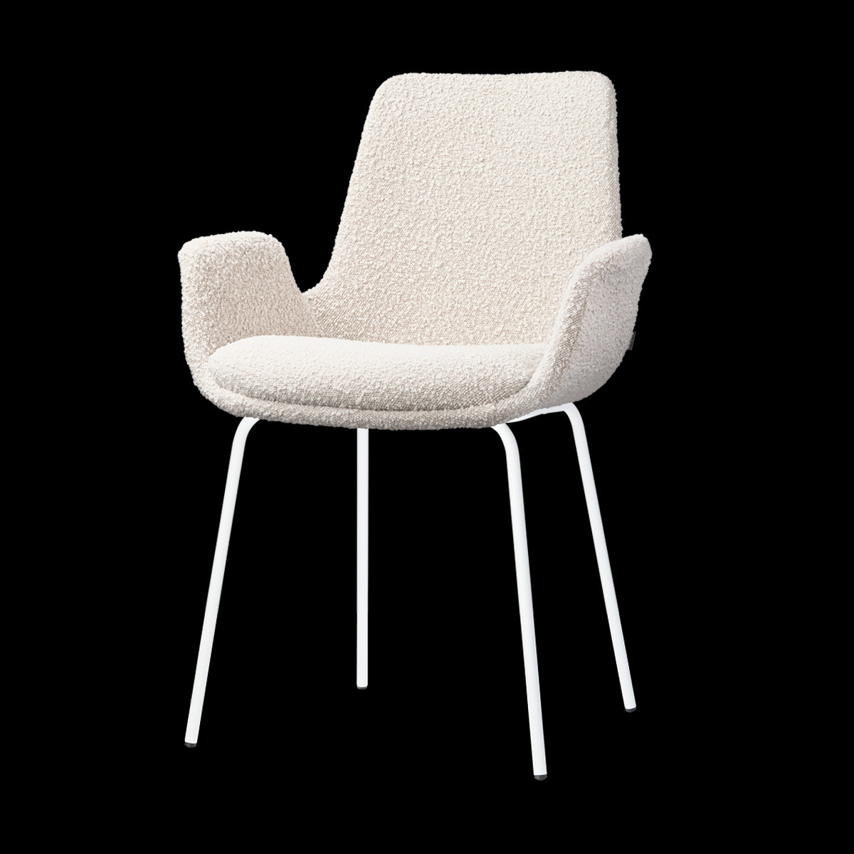 Deze eetkamerstoel is ontworpen met een rank metalen frame dat verkrijgbaar is in zwart en wit. De zitting heeft een stevige rugleuning en armleuningen voor een hoog zitcomfort. Zo kan je zorgeloos genieten van gezellige diners en bijeenkomsten. De armleuningen van deze eetkamerstoel zijn iets lager dan normaal, zodat ze beter onder de eettafel passen. De Nora-Eef is verkrijgbaar met een zitting in diverse kleuren en materialen, waaronder bouclé stof. Dit populaire materiaal zorgt dankzij de rijke textuur voor de ultieme warme sfeer in de eethoek en is daarnaast ook nog eens extra onderhoudsvriendelijk. Heb je liever een eetkamerstoel met een tijdloze uitstraling? De zitting is ook verkrijgbaar met een luxe stof in beige of warm grijs. Welke variant je ook kiest, de Nora-Eef eetkamerstoel is altijd een goede keuze.