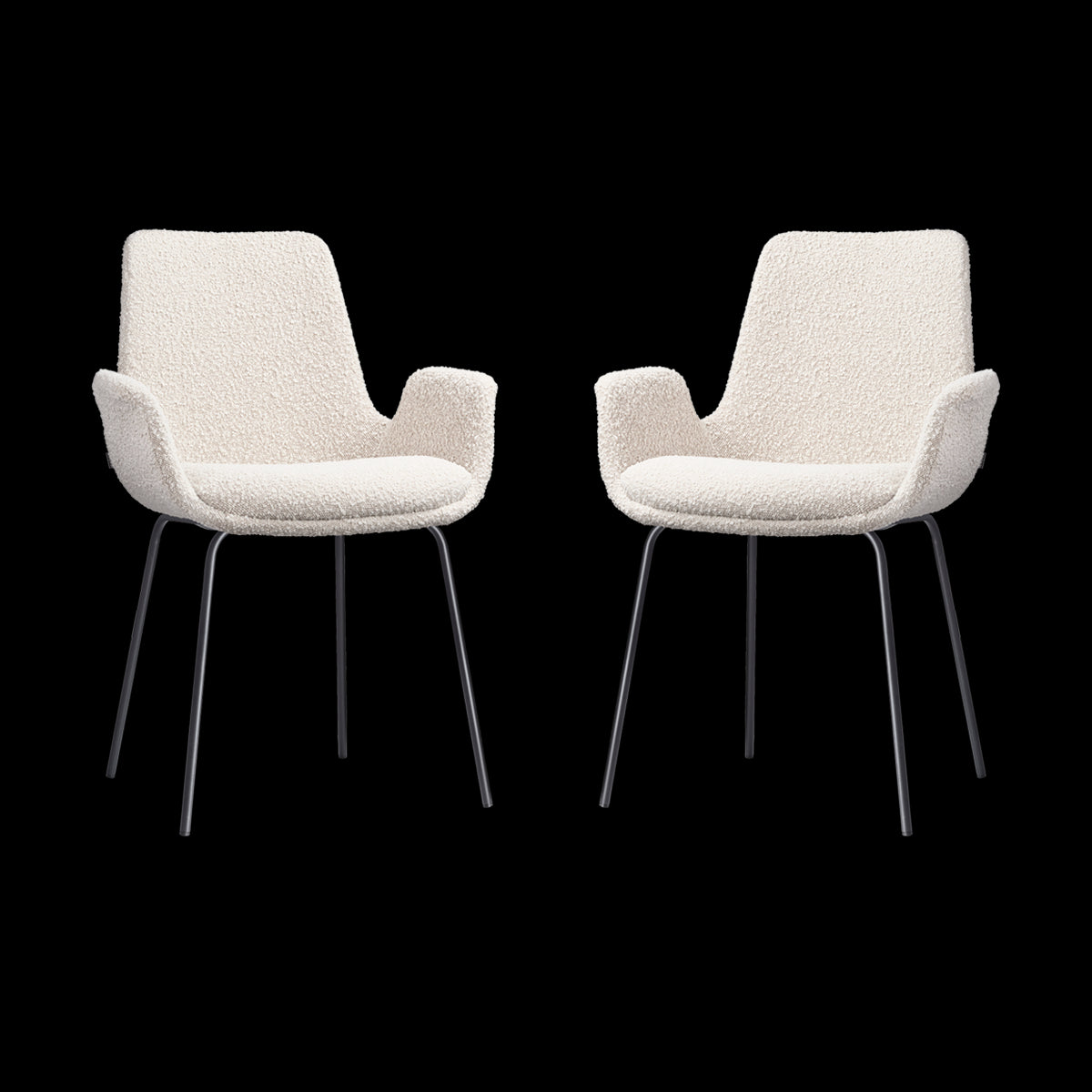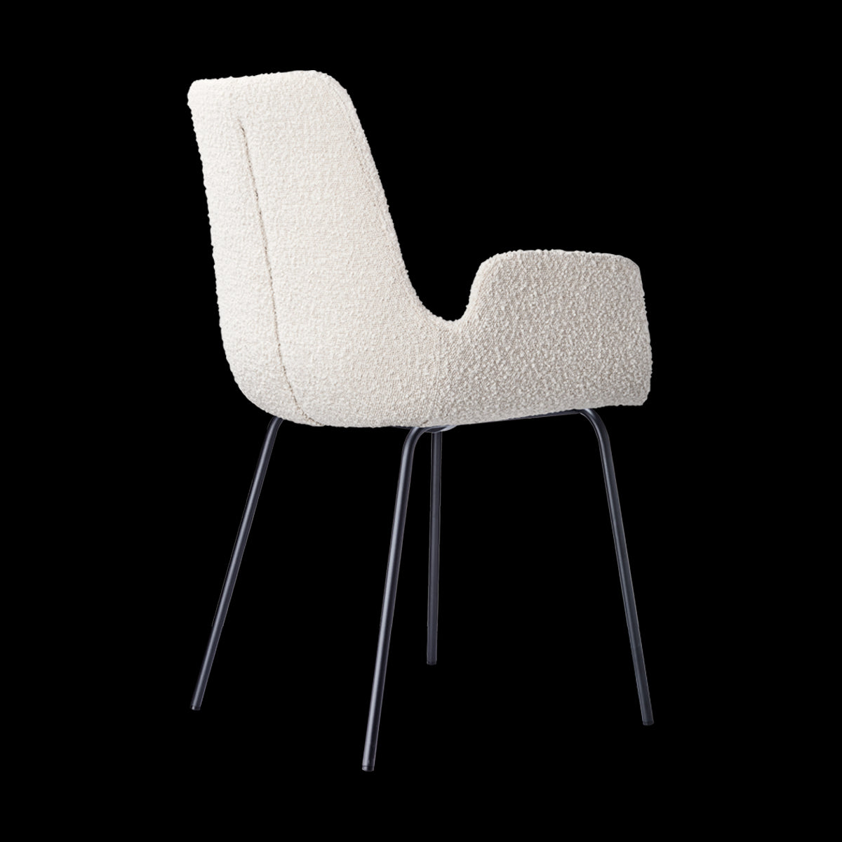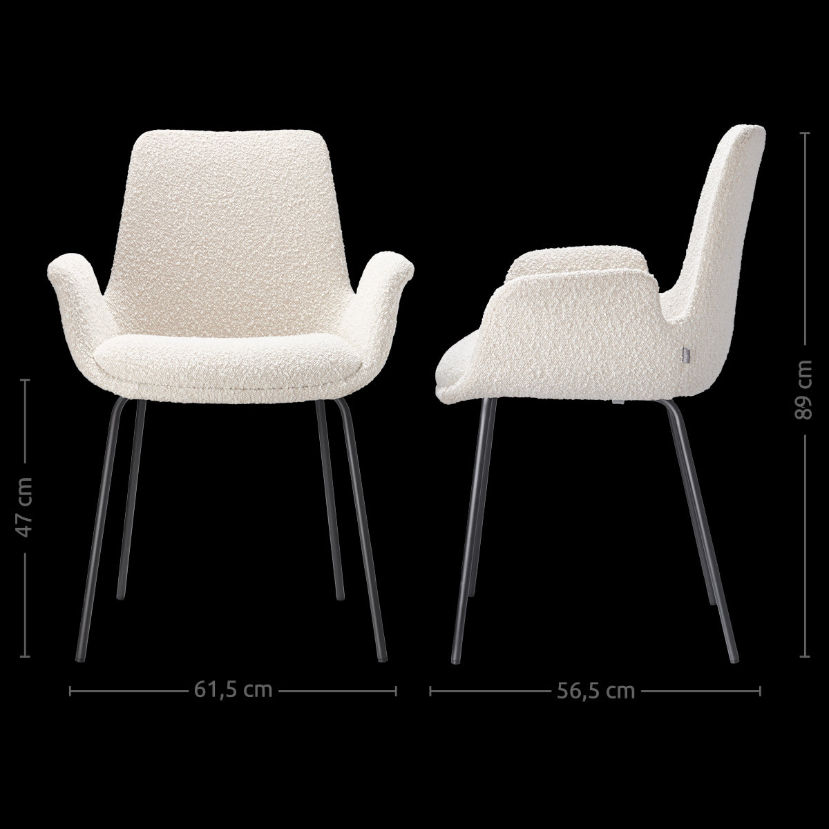 Deze eetkamerstoel is ontworpen met een rank metalen frame dat verkrijgbaar is in zwart en wit. De zitting heeft een stevige rugleuning en armleuningen voor een hoog zitcomfort. Zo kan je zorgeloos genieten van gezellige diners en bijeenkomsten. De armleuningen van deze eetkamerstoel zijn iets lager dan normaal, zodat beter onder de eettafel passen. De Nora-Eef is verkrijgbaar met een zitting in twee verschillende kleuren en materialen, waaronder bouclé stof. Dit populaire materiaal zorgt dankzij de rijke textuur voor de ultieme warme sfeer in de eethoek en is daarnaast ook nog eens extra onderhoudsvriendelijk. Heb je liever een eetkamerstoel met een tijdloze uitstraling? De zitting is ook verkrijgbaar met een luxe beige stof. Welke variant je ook kiest, de Nora-Eef eetkamerstoel is altijd een goede keuze.