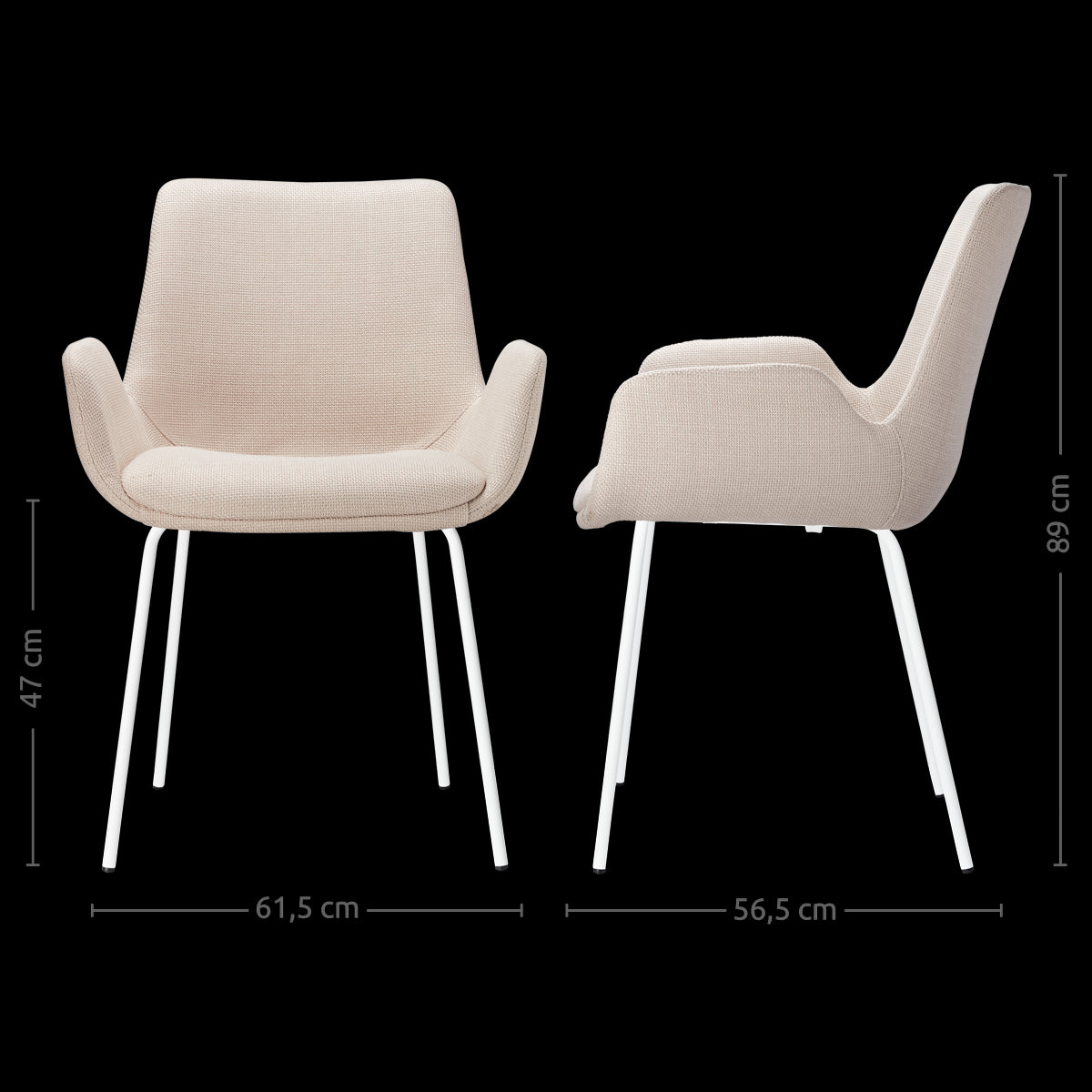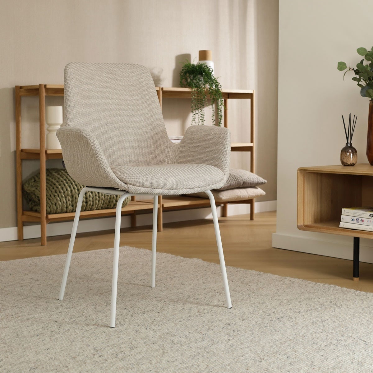 Deze eetkamerstoel is ontworpen met een rank metalen frame dat verkrijgbaar is in zwart en wit. De zitting heeft een stevige rugleuning en armleuningen voor een hoog zitcomfort. Zo kan je zorgeloos genieten van gezellige diners en bijeenkomsten. De armleuningen van deze eetkamerstoel zijn iets lager dan normaal, zodat beter onder de eettafel passen. De Nora-Eef is verkrijgbaar met een zitting in twee verschillende kleuren en materialen, waaronder bouclé stof. Dit populaire materiaal zorgt dankzij de rijke textuur voor de ultieme warme sfeer in de eethoek en is daarnaast ook nog eens extra onderhoudsvriendelijk. Heb je liever een eetkamerstoel met een tijdloze uitstraling? De zitting is ook verkrijgbaar met een luxe beige stof. Welke variant je ook kiest, de Nora-Eef eetkamerstoel is altijd een goede keuze.