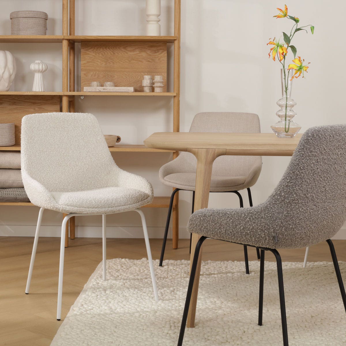 Deze stoel is de belichaming van eenvoudige elegantie en past perfect in elke stijlvolle ruimte. De combinatie van strakke lijnen en hoogwaardige materialen maakt van deze stoel een onmisbare aanvulling op jouw eethoek. De Nora-Isa eetkamerstoel heeft een minimalistisch metalen onderstel dat zorgt voor een stabiele zit. Deze stoffen eetkamerstoel is ontworpen zonder armleuningen om ruimte te besparen aan de eettafel. Een ander voordeel hiervan is dat je je geen zorgen hoeft te maken of de stoel wel onder het tafelblad past. De gestoffeerde zitting heeft een stevig houten binnenwerk voor een actieve zithouding en een gevoerd zitvlak voor zodat je lekker zacht zit. De bekleding is in verschillende kleuren en materialen verkrijgbaar. Zo kan je kiezen voor de luxe stoffen bekleding met een tijdloze uitstraling, of juist de bouclé stof die deze eetkamerstoel nog meer sfeer in de eetkamer brengt.