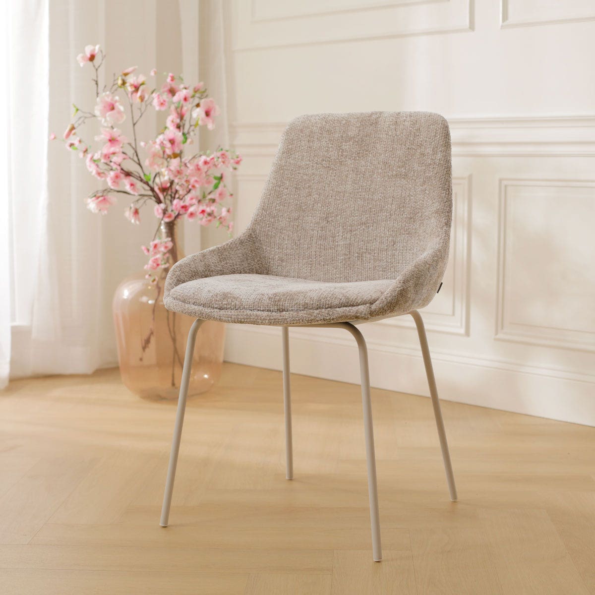 Deze stoel is de belichaming van eenvoudige elegantie en past perfect in elke stijlvolle ruimte. De combinatie van strakke lijnen en hoogwaardige materialen maakt van deze stoel een onmisbare aanvulling op jouw eethoek. De Nora-Isa eetkamerstoel heeft een minimalistisch metalen onderstel dat zorgt voor een stabiele zit. Deze stoffen eetkamerstoel is ontworpen zonder armleuningen om ruimte te besparen aan de eettafel. Een ander voordeel hiervan is dat je je geen zorgen hoeft te maken of de stoel wel onder het tafelblad past. De gestoffeerde zitting heeft een stevig houten binnenwerk voor een actieve zithouding en een gevoerd zitvlak voor zodat je lekker zacht zit. De bekleding is in verschillende kleuren en materialen verkrijgbaar. Zo kan je kiezen voor de luxe stoffen bekleding met een tijdloze uitstraling, of juist de bouclé stof die deze eetkamerstoel nog meer sfeer in de eetkamer brengt.