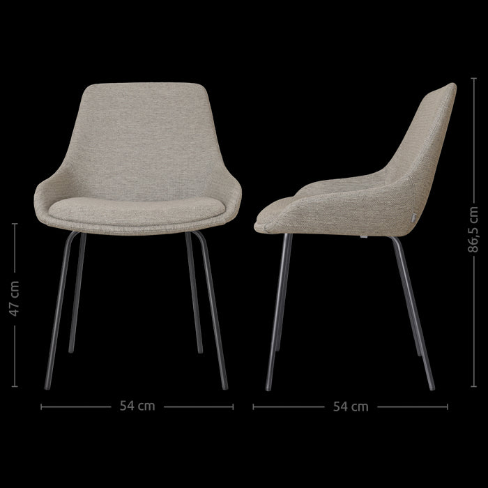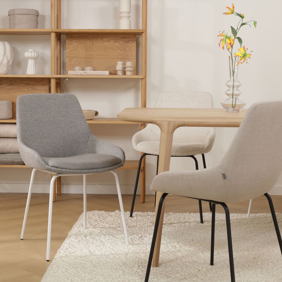 De Nora-Isa eetkamerstoel warm grijs - zwart onderstel is onderdeel van een mix en match collectie. Dit betekent dat zowel het onderstel als de zitting van deze stoel in diverse andere combinaties verkrijgbaar zijn. Zo is de stoel met een wit onderstel en een zwart onderstel verkrijgbaar in de kleuren bouclé taupe, beige, warm grijs, bruin, beige gemêleerd en in het groen. Met het zwarte onderstel biedt de collectie ook bouclé beige en bouclé taupe. Deze varianten bieden voldoende keuze om verschillende interieurstijlen te complementeren en persoonlijke voorkeuren te weerspiegelen.Afmetingen | |